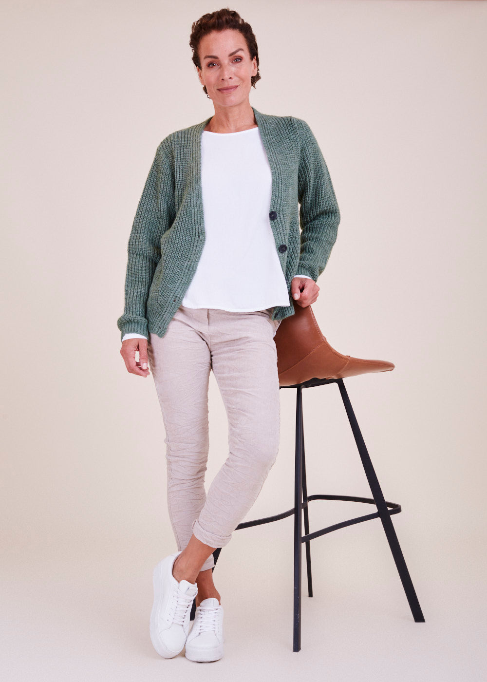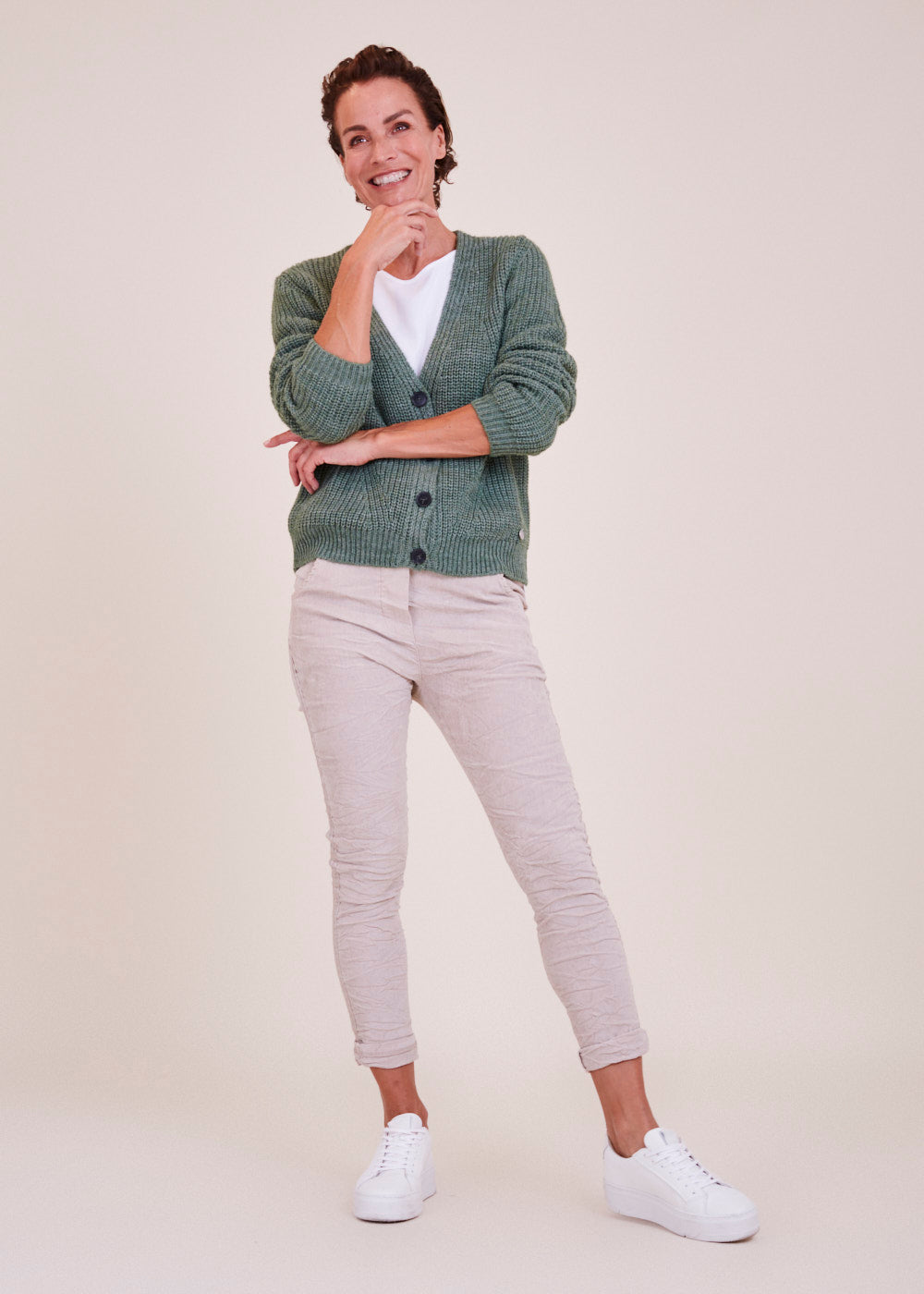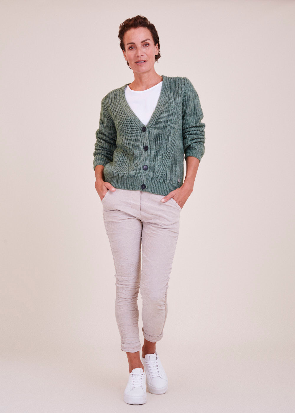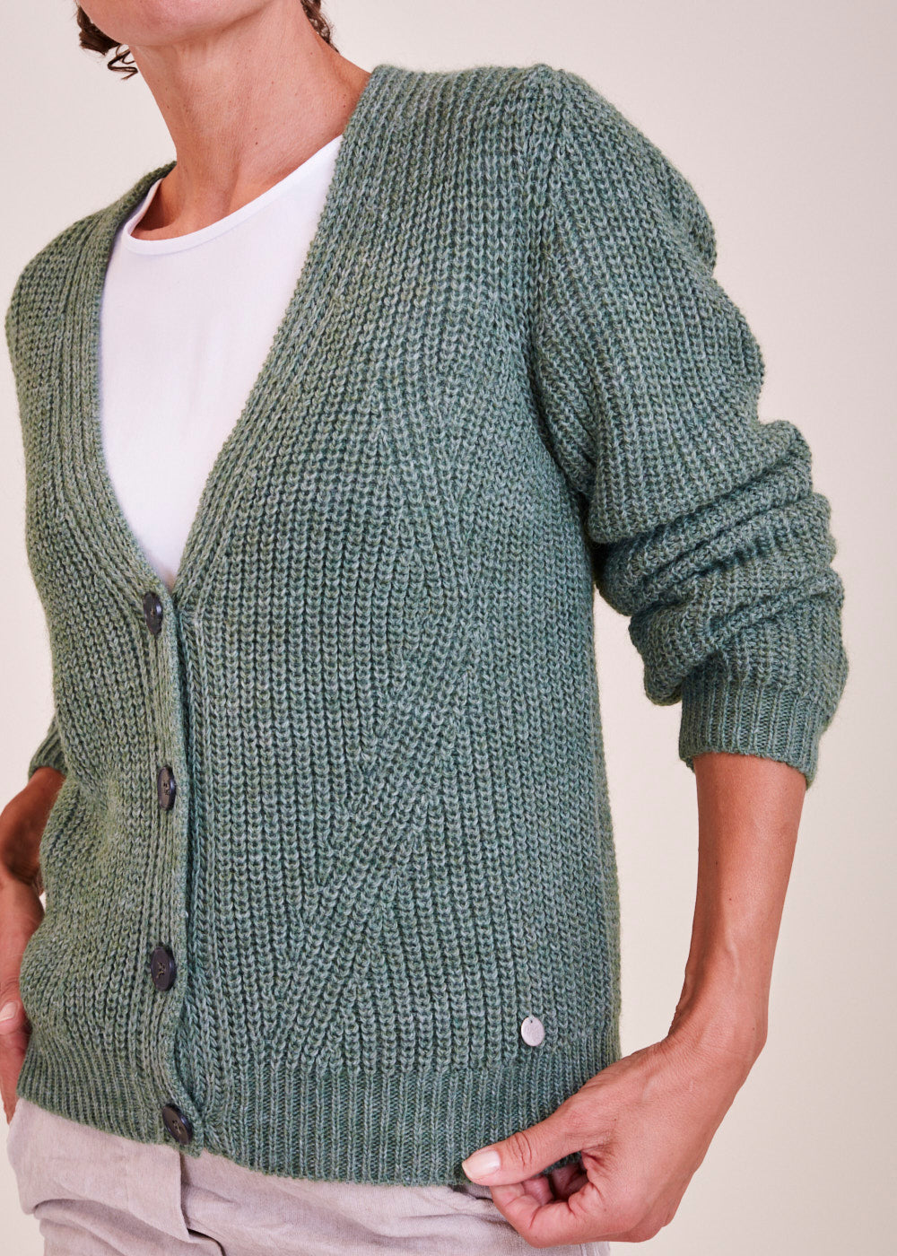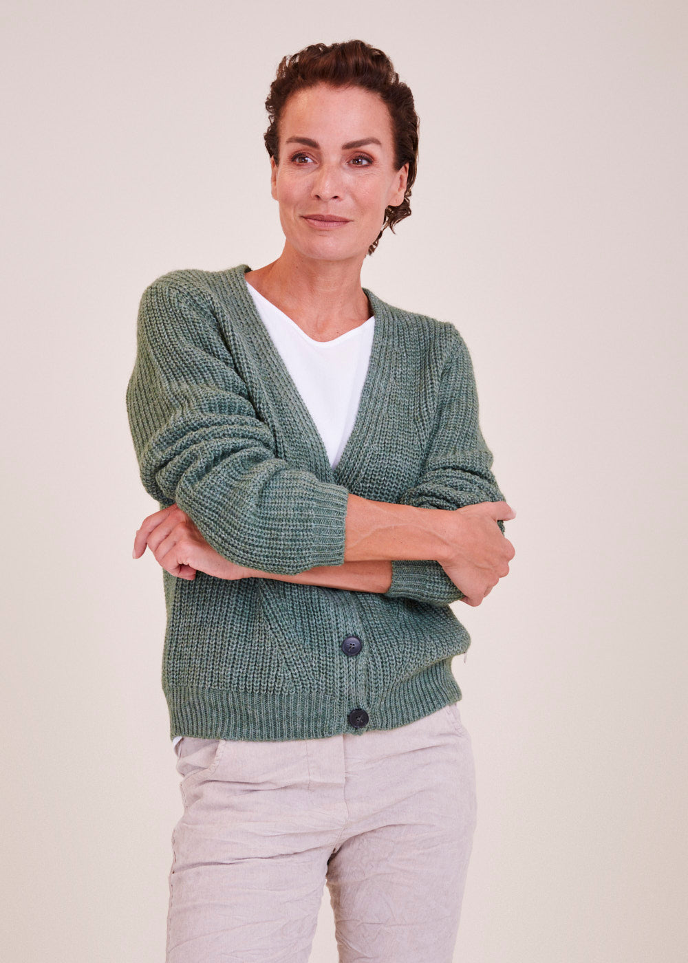 Kurz und kastenförmig geschnittene Strickjacke mit langen Armen in einem großartigen Grün Ton. Sie hat ein Rippenbündchen an den Ärmeln und am Saum. Durch die vier besonderen  Frontknöpfe lässt sich diese Jacke wunderbar geschlossen tragen. Kuschelig weicher Tragekomfort mit absoluter Wohlfühlgarantie.