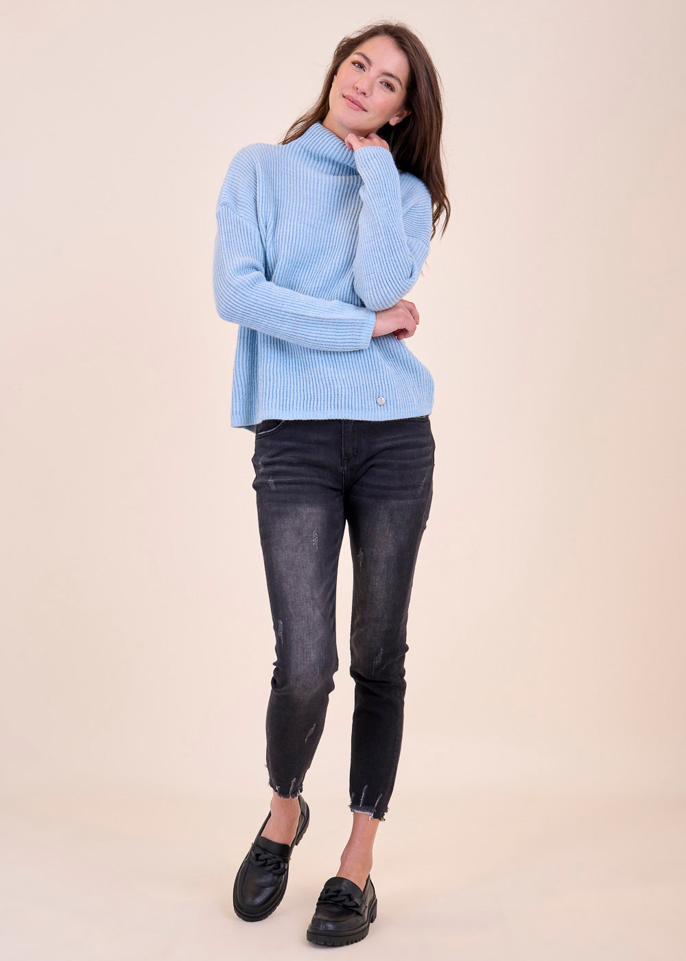Strickpullover mit Rollkragen aus einem angenehmen Garn. Er hat überschnittene Schultern und eng geschnittene Arme. Der perfekte Pullover für kältere Tage.