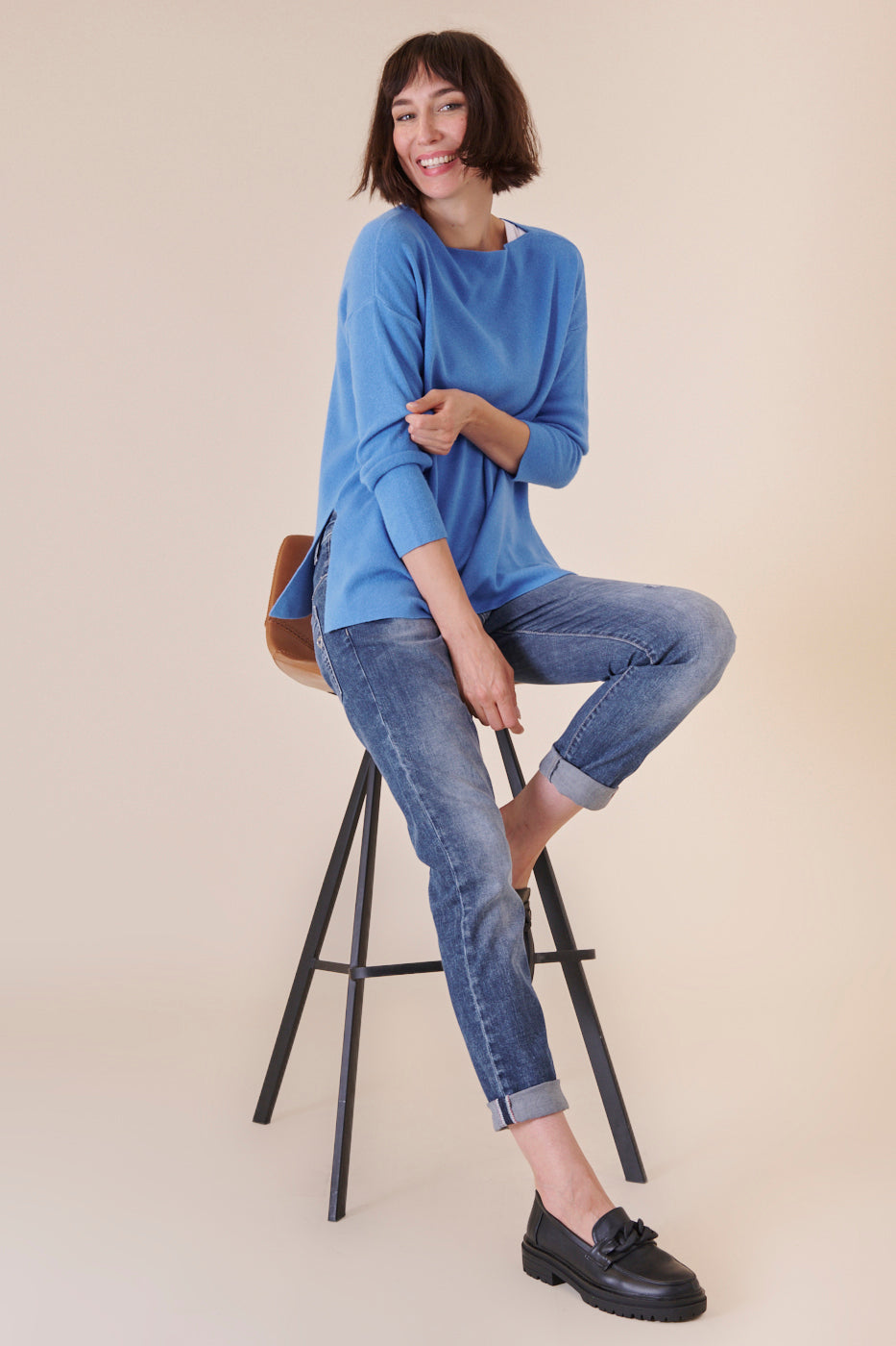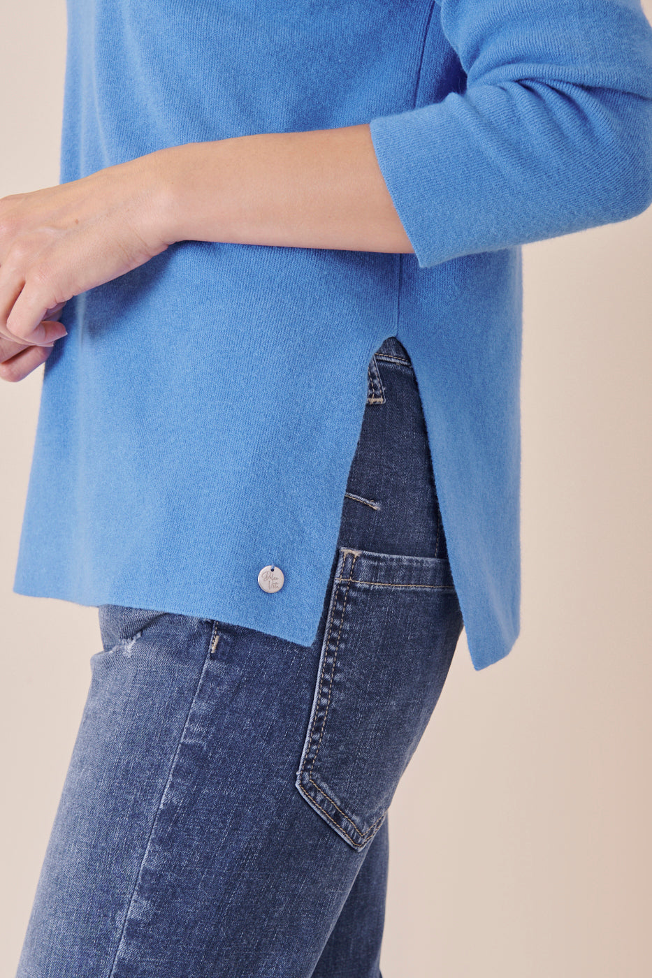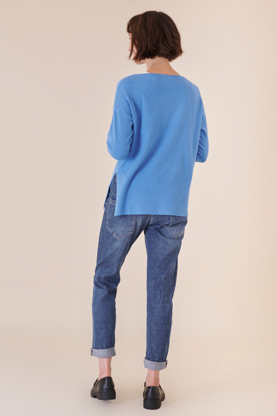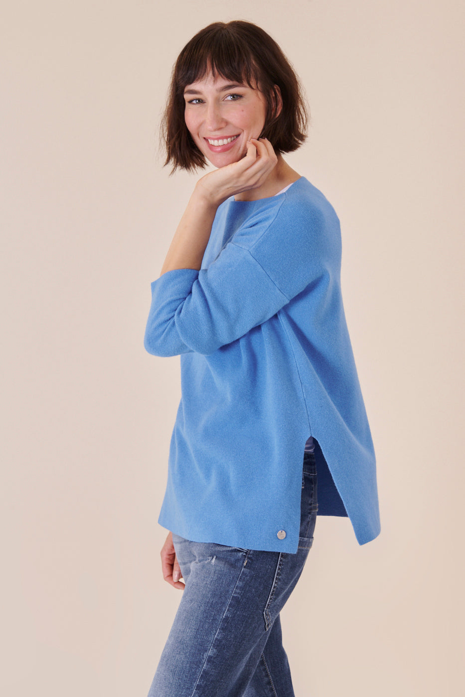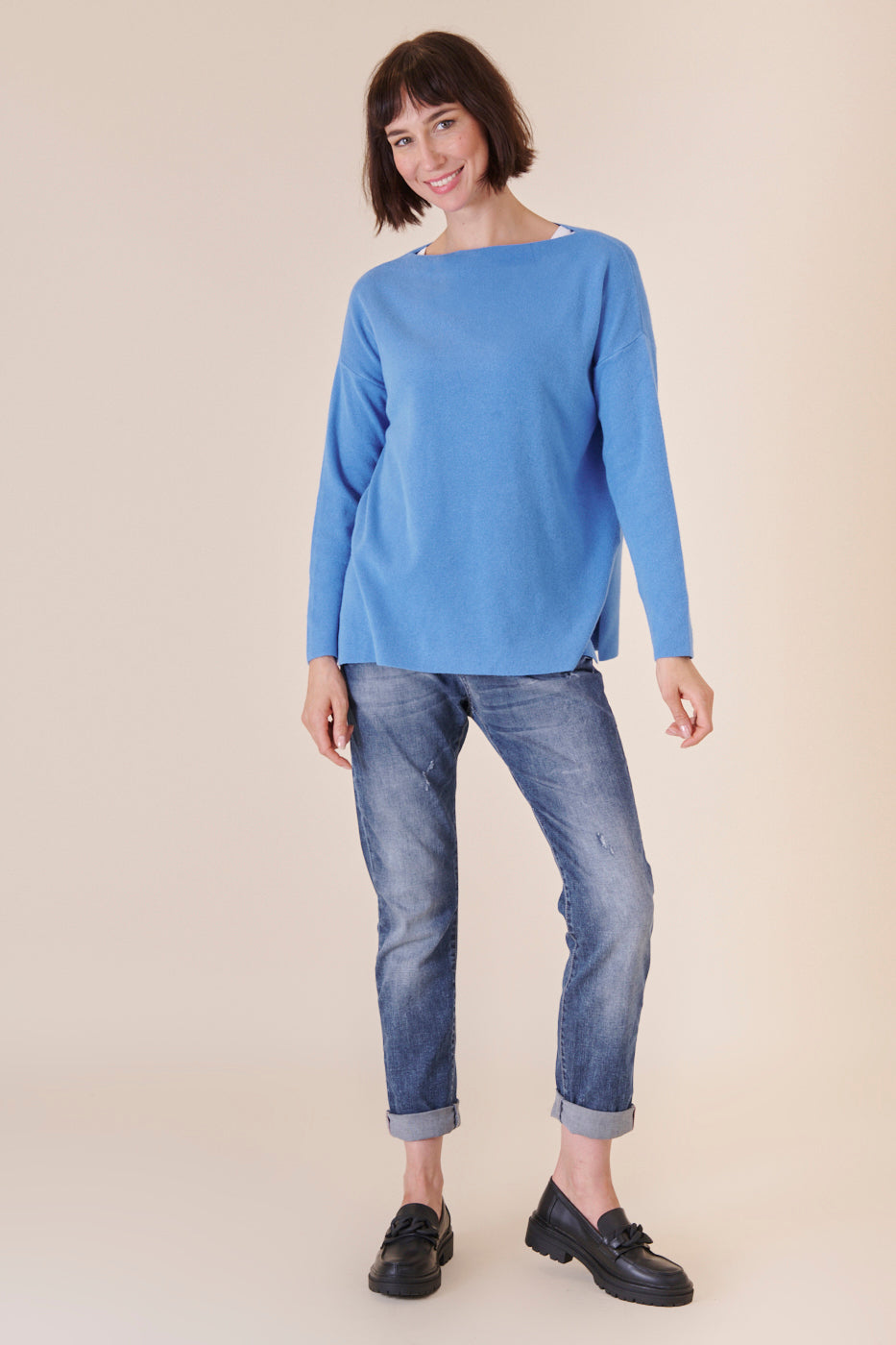 Kastenförmig geschnittener U-Boot Ausschnittpullover in einem wunderschönen Blauton. Er ist etwas länger geschnitten und hat seitliche Schlitze. Durch unser Bestseller Kuschelgarn hat er einen angenehmen und weichen Tragekomfort. Kombiniere diese Artikel gerne mit einer Jeans und weißen Sneakern, um ganz casual unterwegs zu sein.