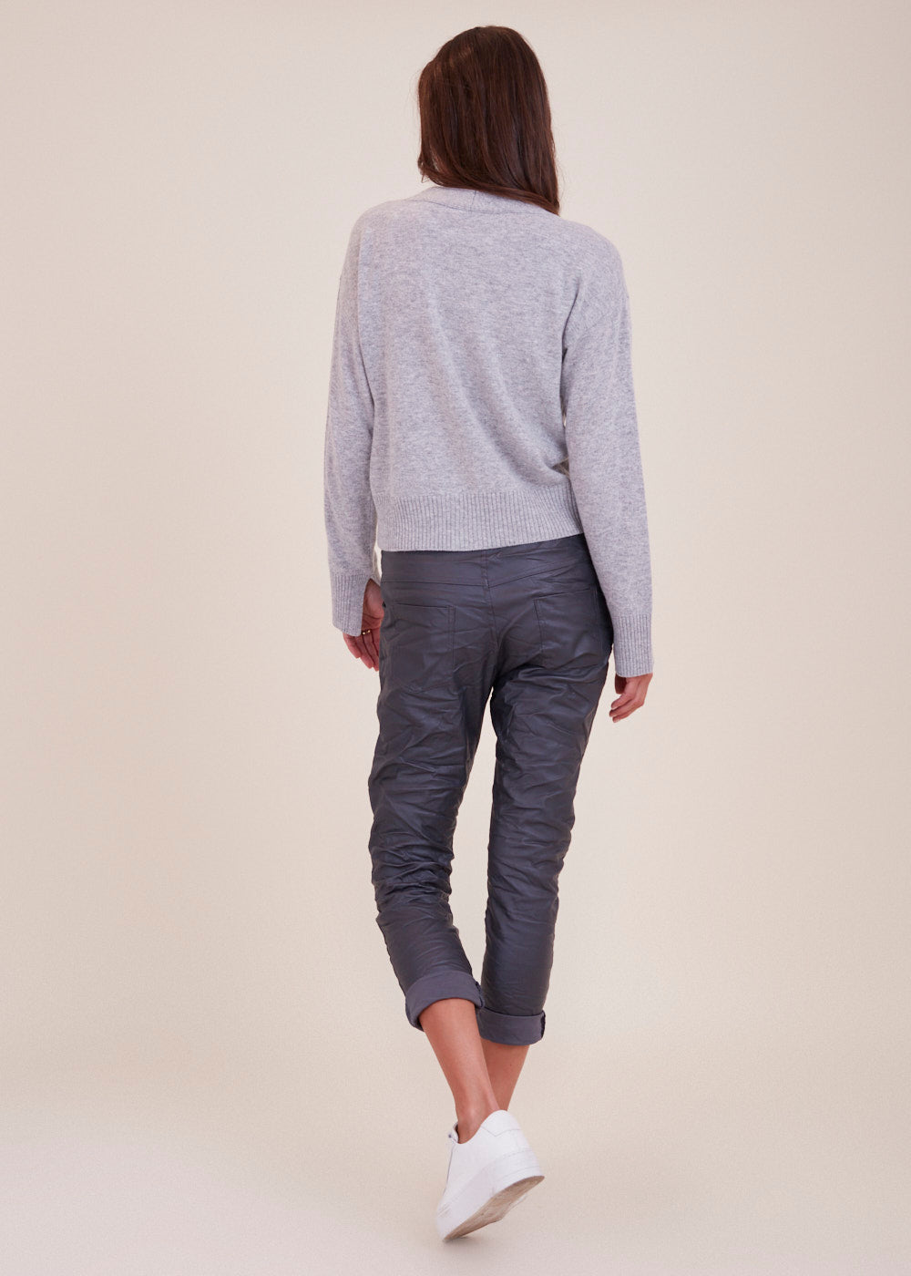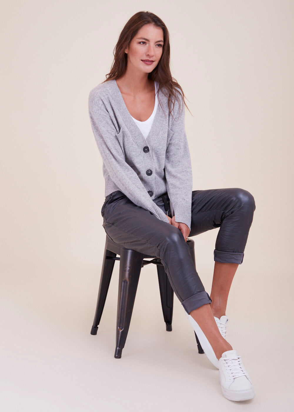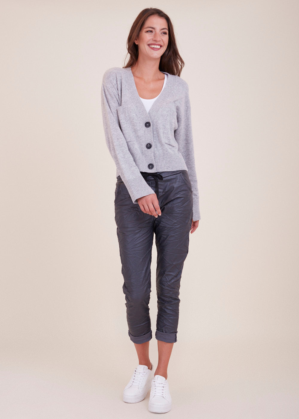 Kurz und kastenförmig geschnittene Strickjacke mit langen Armen mit Kaschmiranteil. Sie hat ein Rippenbündchen an den Ärmeln und am Saum. Durch die drei Frontknöpfe lässt sich diese Jacke wunderbar geschlossen tragen. Die aufsetzten Taschen geben der Jacke noch das besondere etwas. Zum darunter tragen empfehlen wir dir unsere Basic Tops. Kuschelig weicher Tragekomfort mit absoluter Wohlfühlgarantie.