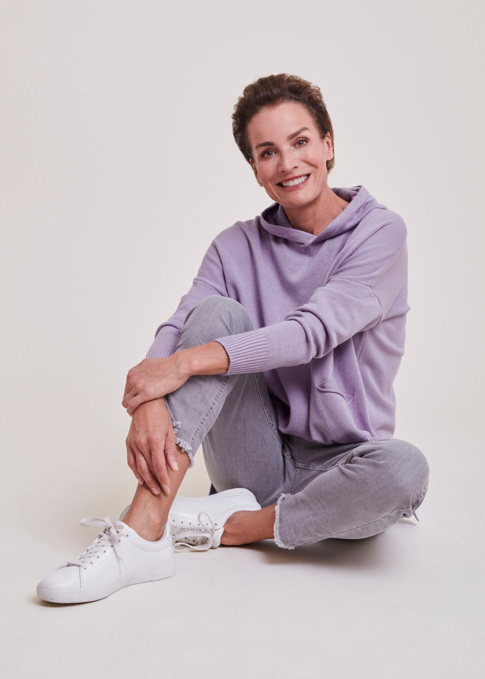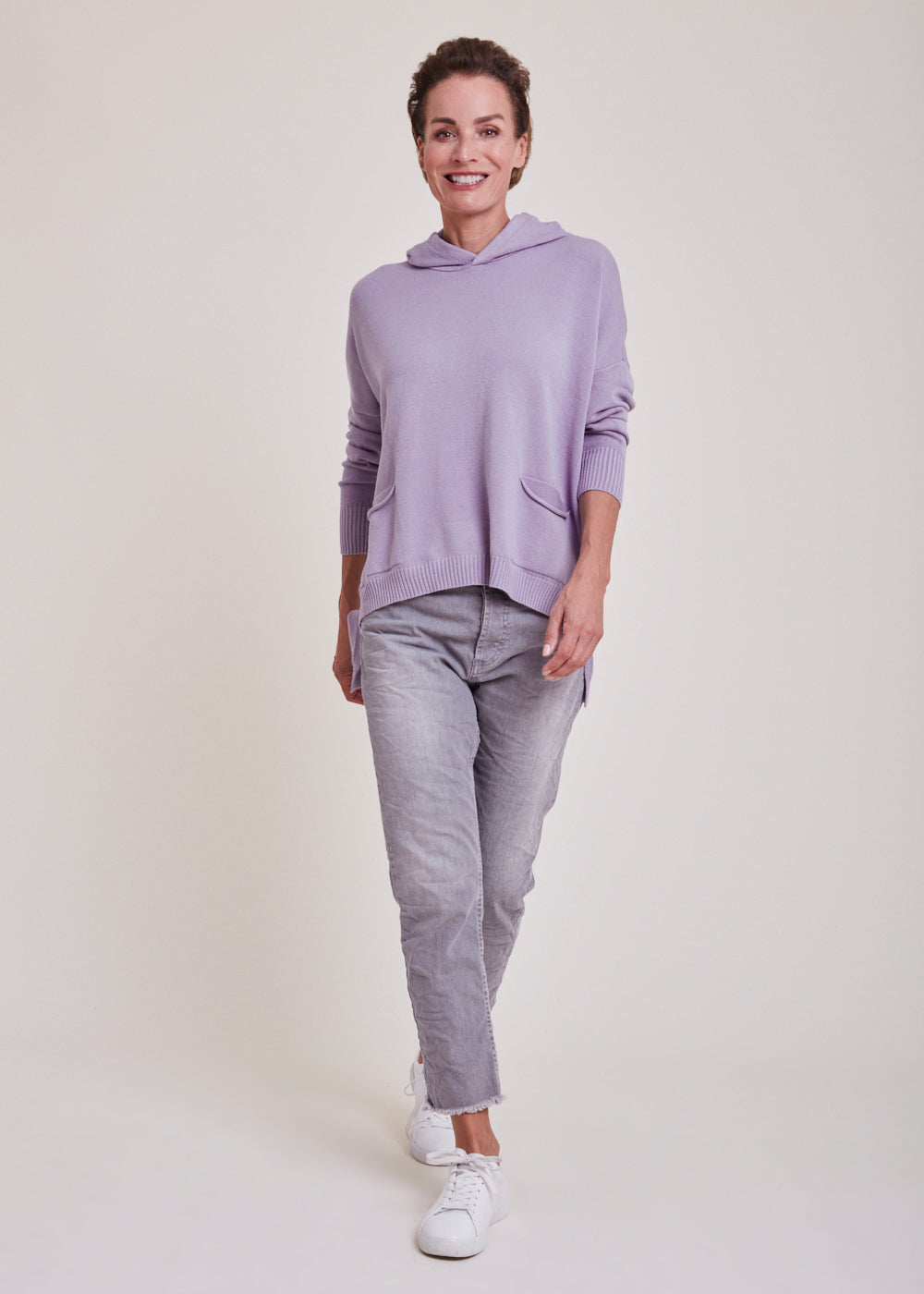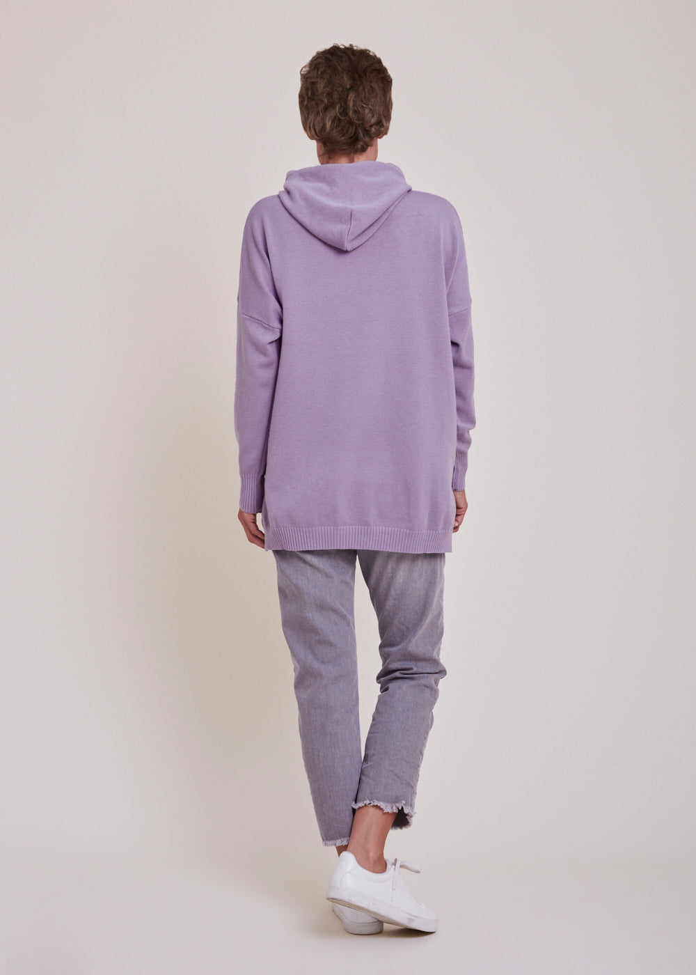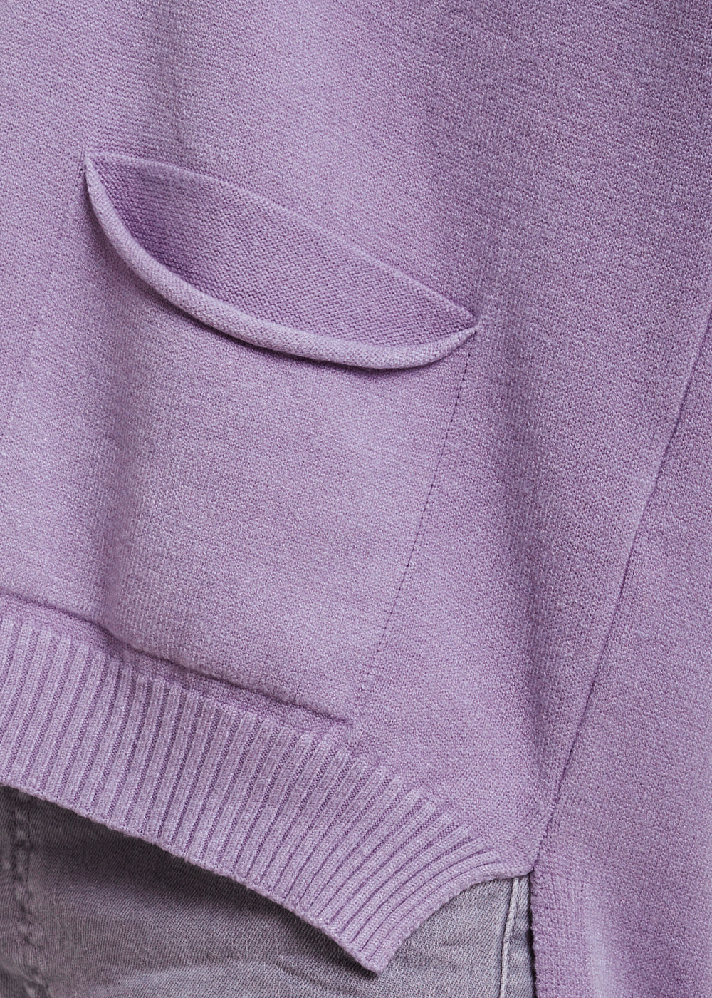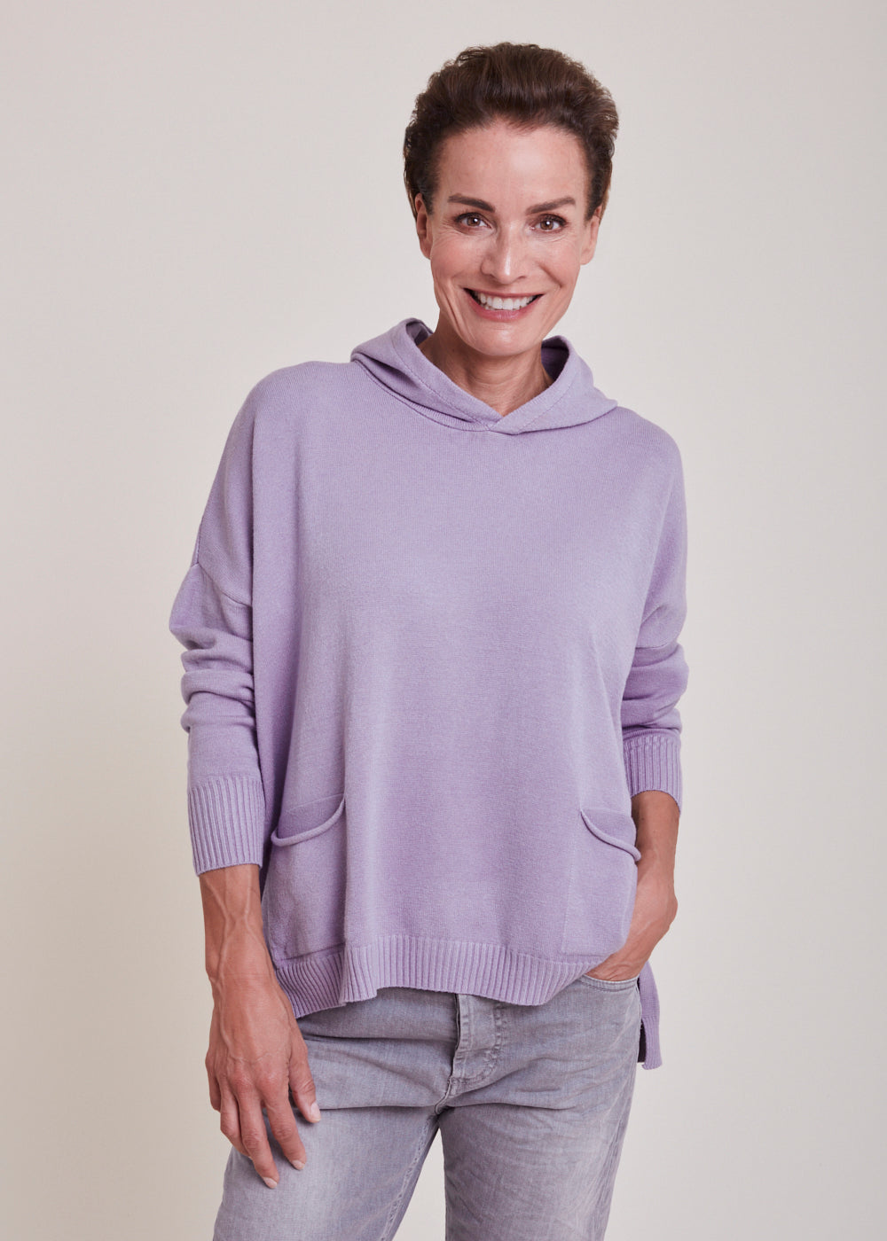 Bequemer Kapuzenpullover mit gerippten Bündchen in der Trendfarbe Lilla. Der Pullover hat seitliche Eingriffstaschen und einen leicht asymmetrischen Schnitt, der sich nach hinten verlängert.