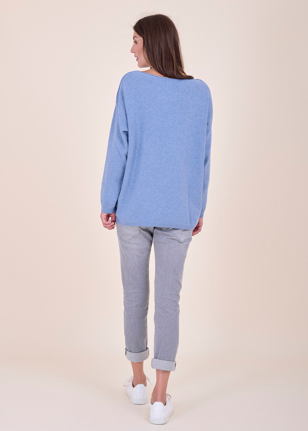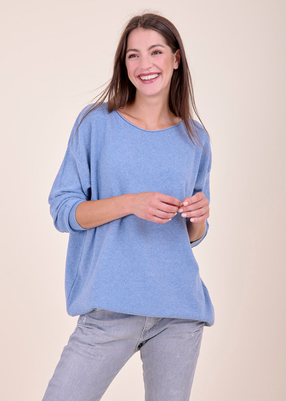 Leichter Pullover mit langen Ärmeln und Bündchen in Rippenstrickoptik. Der Pullover hat einen Rundhalsausschnitt und ist leicht oversized.