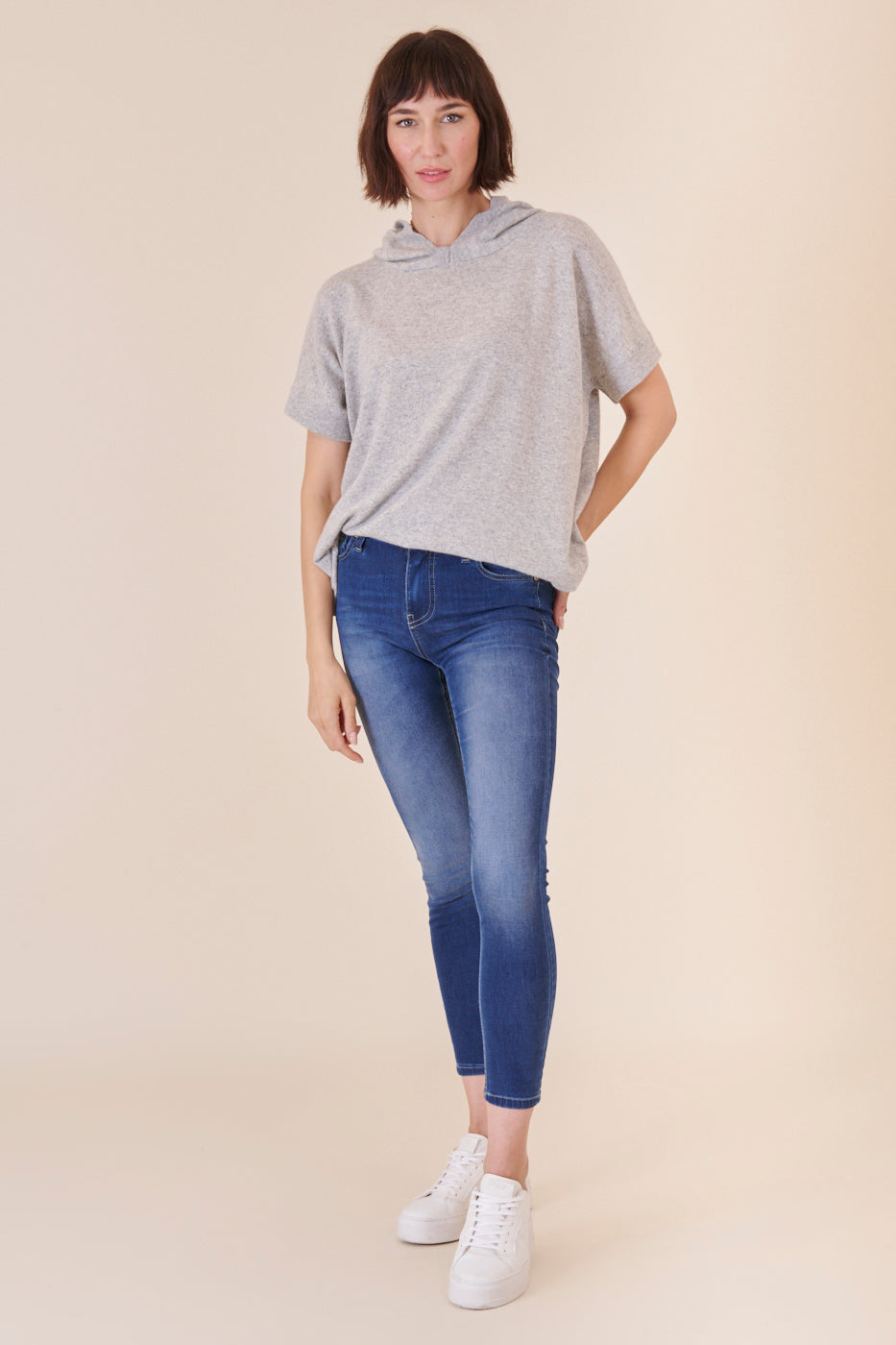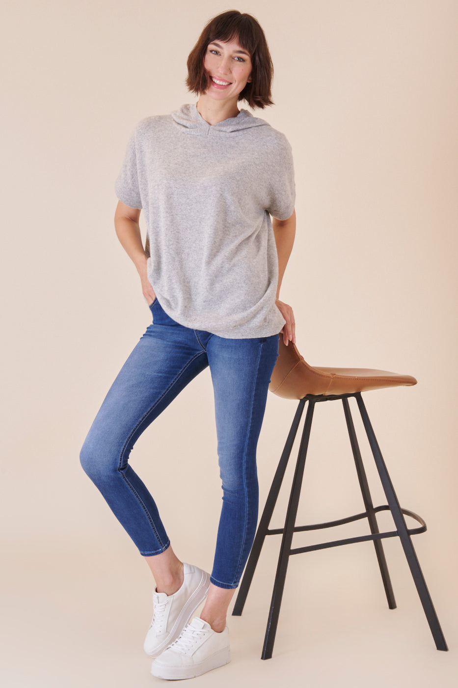 Lässig und kastenförmig geschnittener Hoody mit halben Arm. Er hat besondere Rippendetails an der Kapuze, sowie am Saum und Armabschluss. Ein absoluter Wohlfühl Hoody mit tollen Kaschmiranteil. Kombiniere diesen Artikel, um ganz lässig zu wirken, mit einer Jeans und Sneaker.