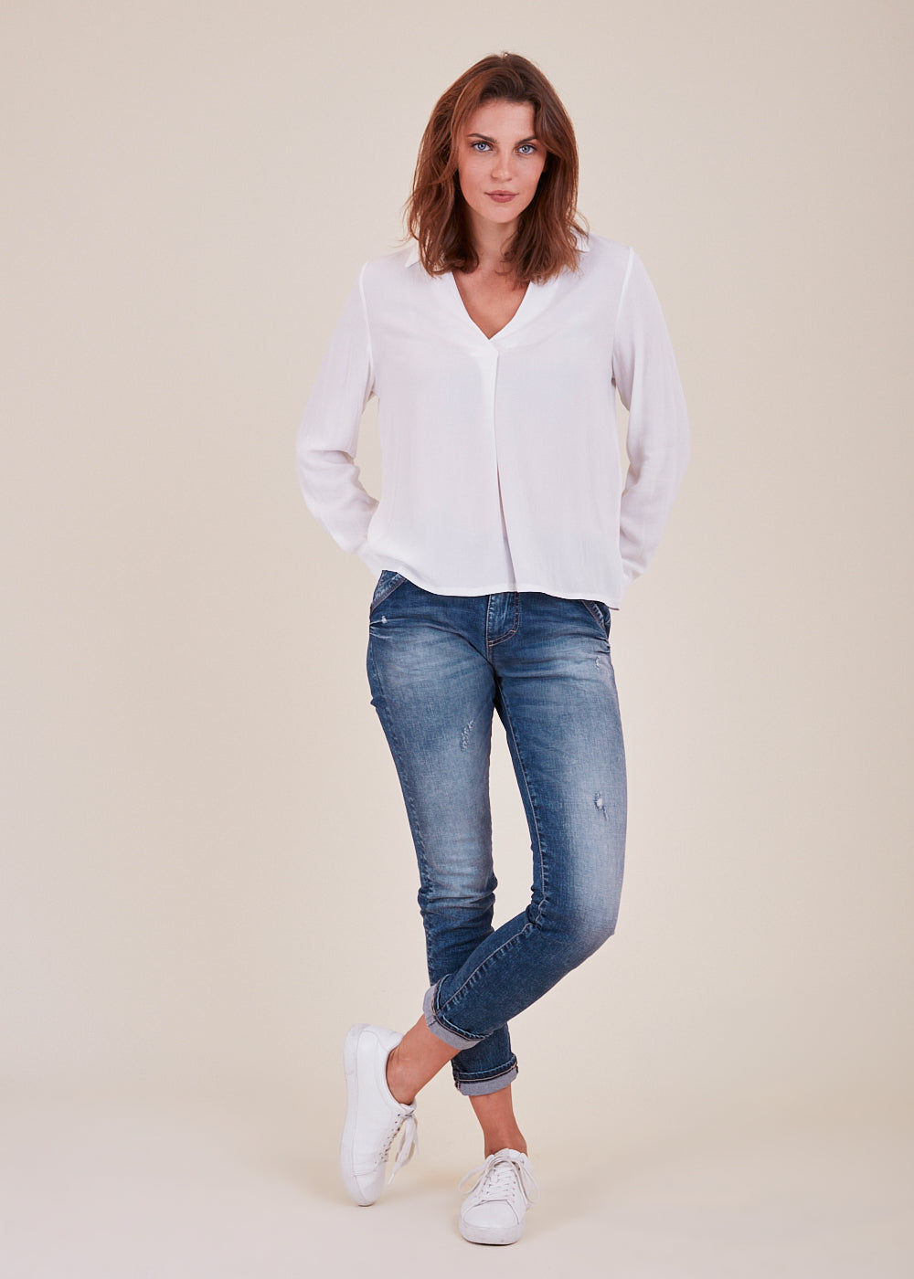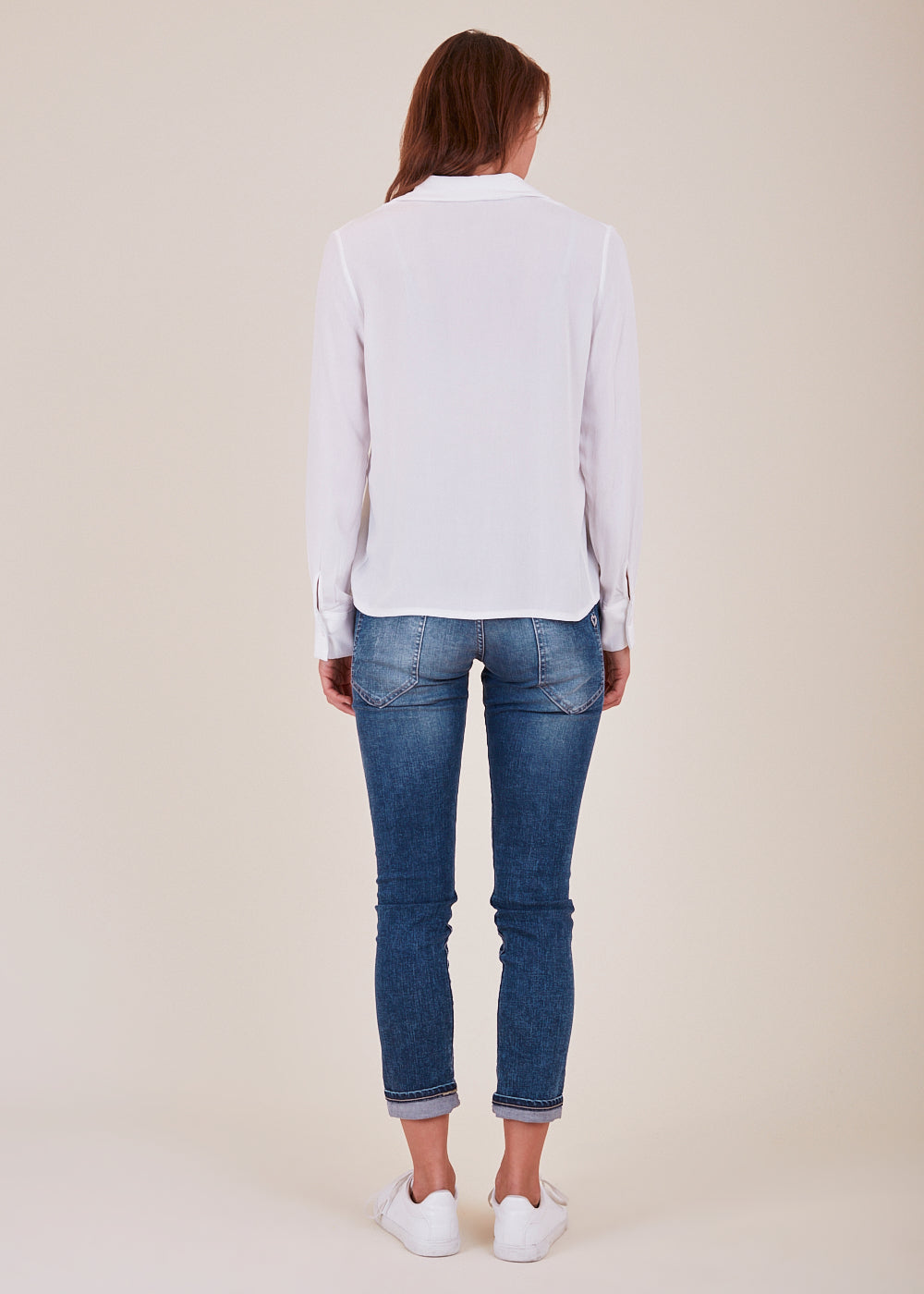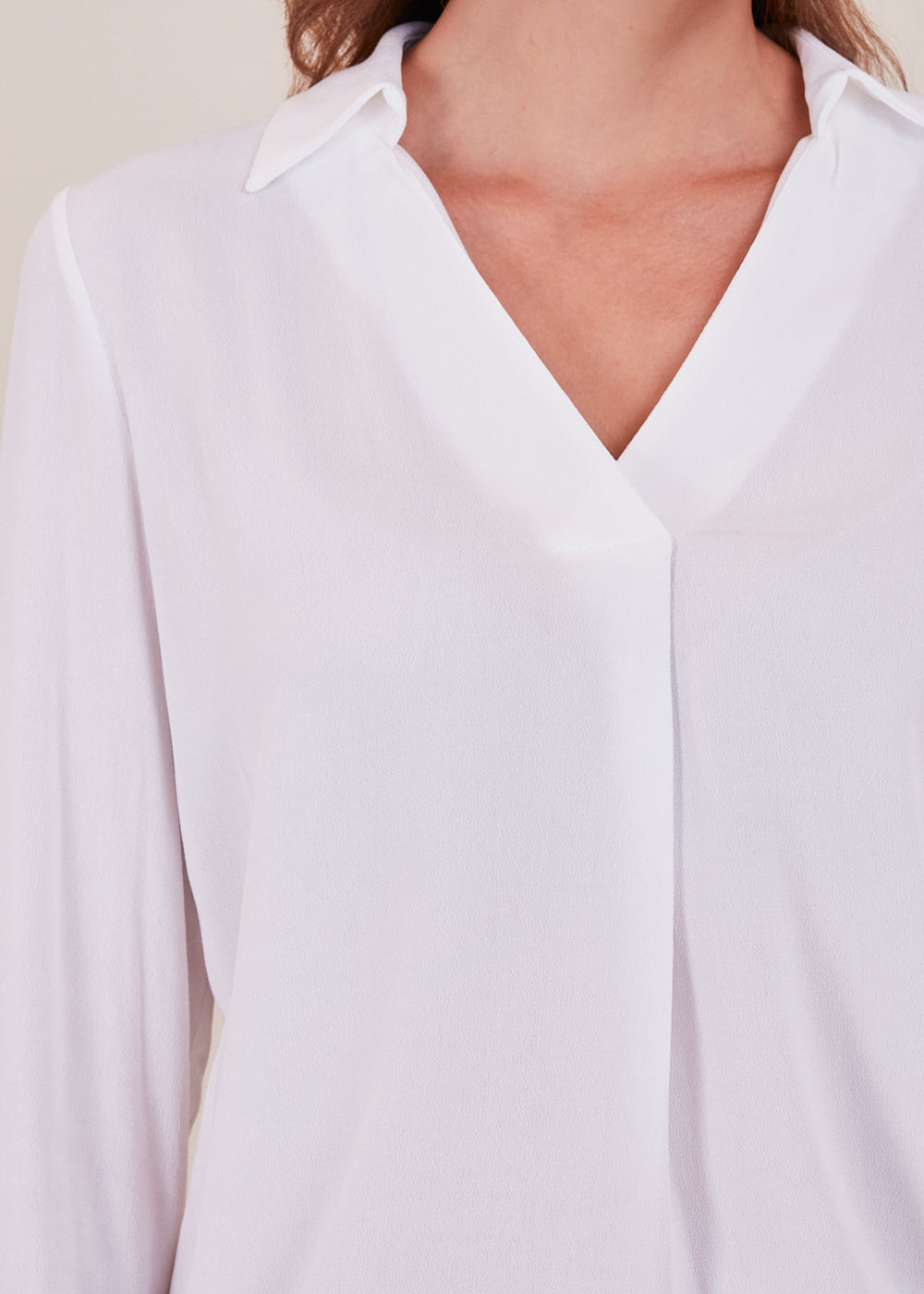 Weiße Crepe-Bluse in geradem Schnitt mit langen Ärmeln. Die Bluse hat einen kleinen Kragen und einen V-Ausschnitt, der in eine Kellerfalte mündet. Die Ärmelbündchen haben eine Manchetten-Optik.