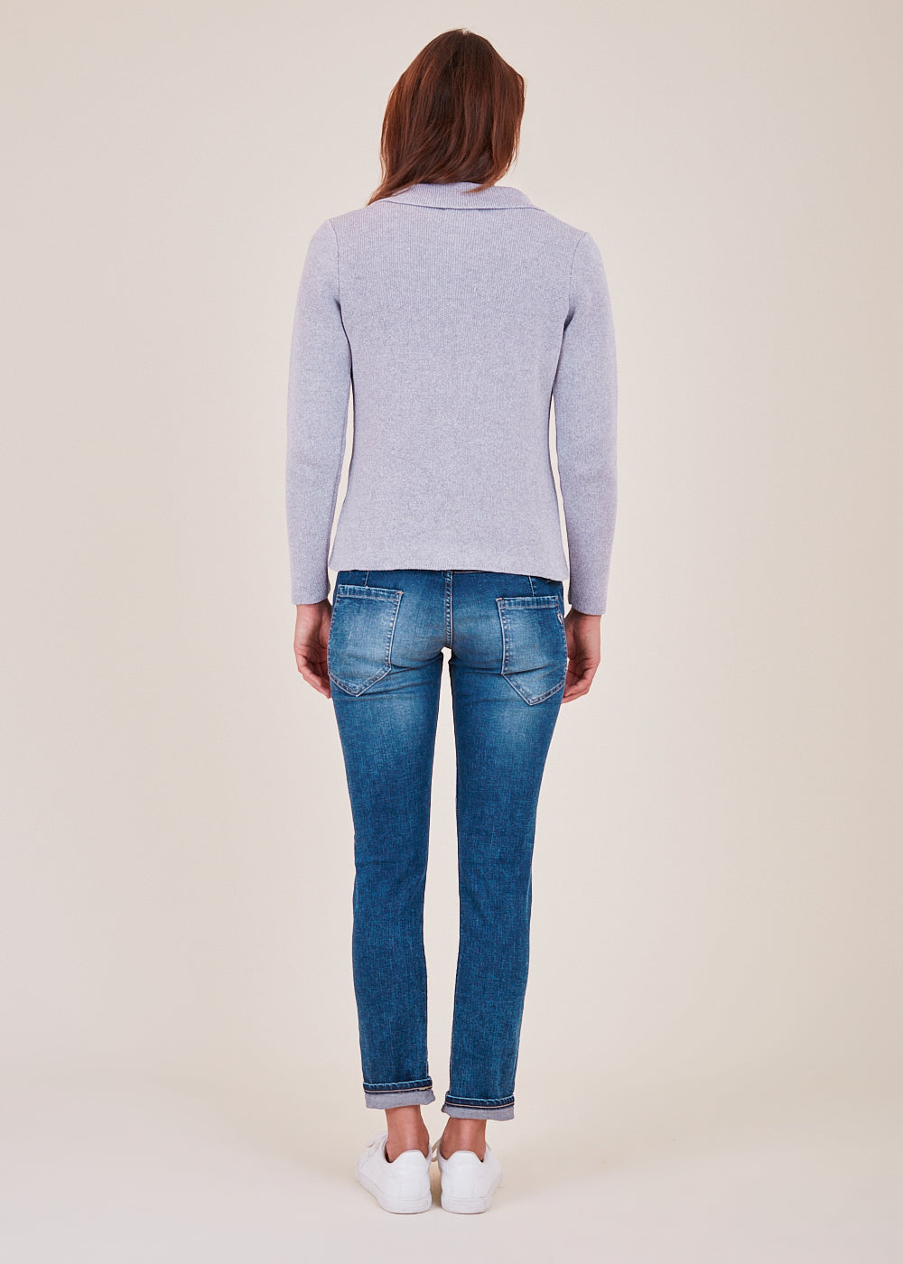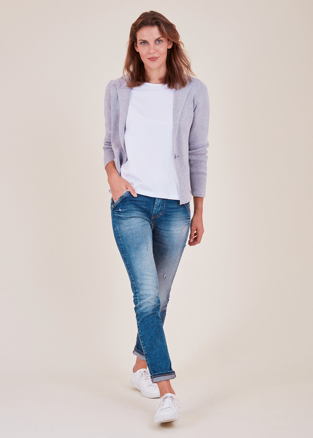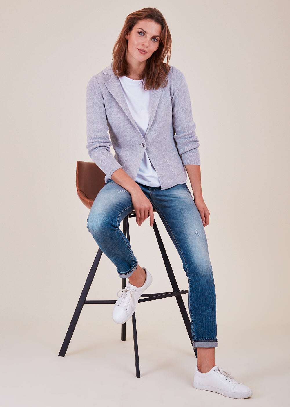 Taillierter Strickblazer mit langem Ärmeln und einem Knopf. Der Blazer hat aufgesetzte Taschen und einen weiten V-Ausschnitt.
