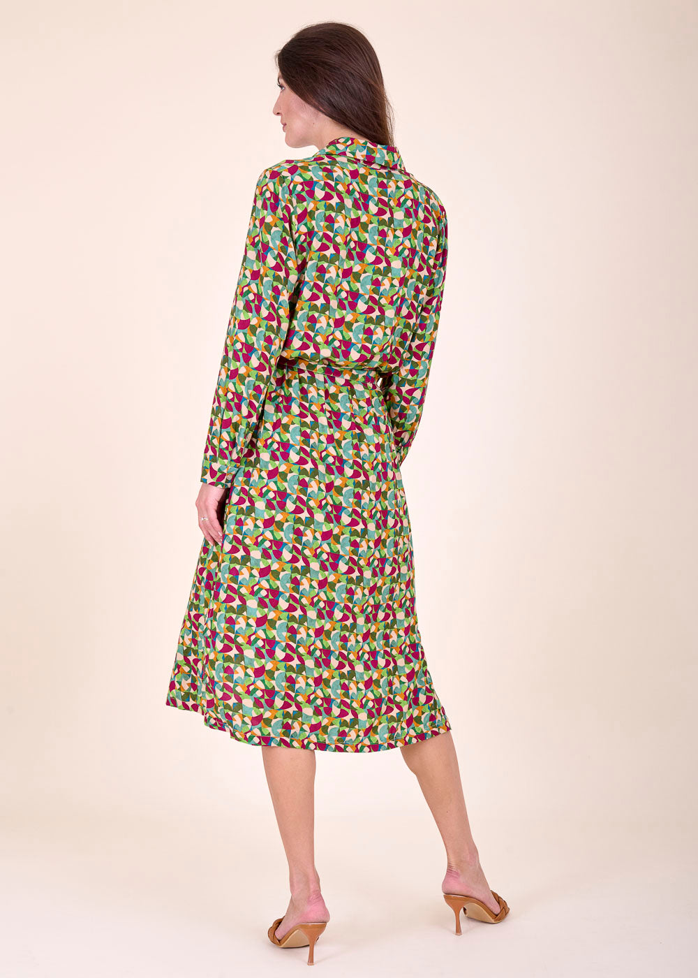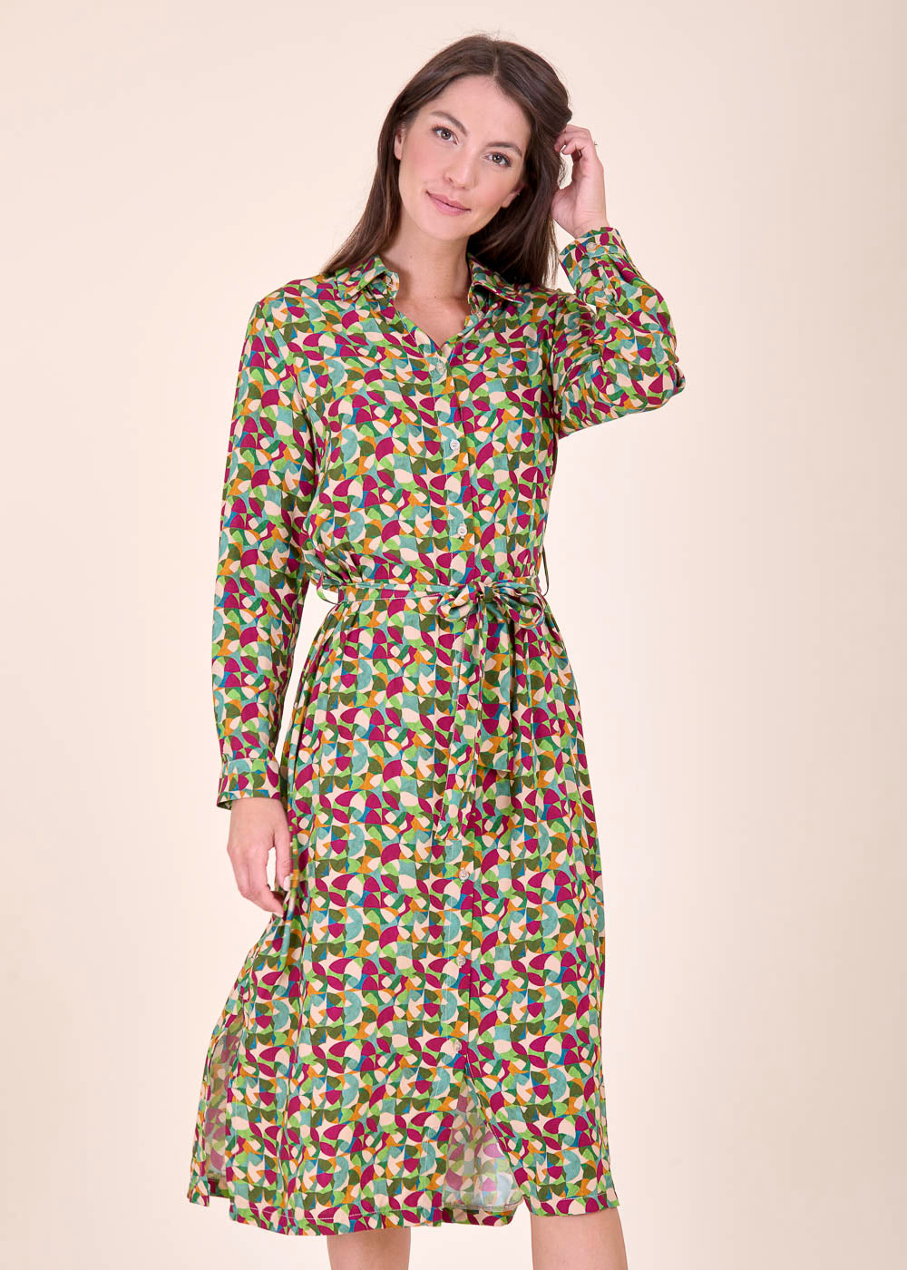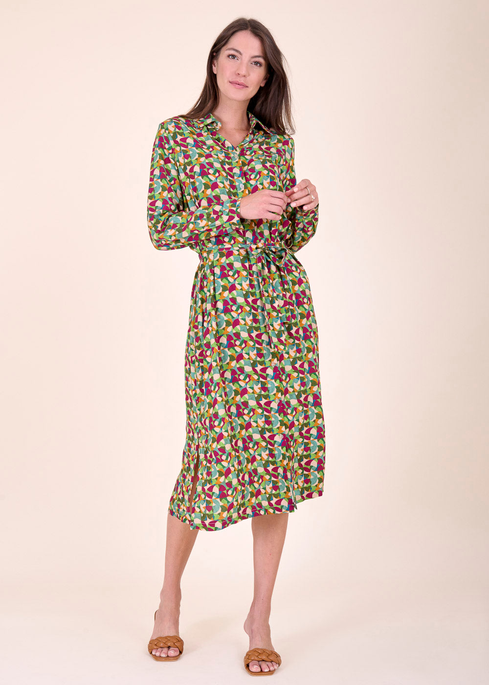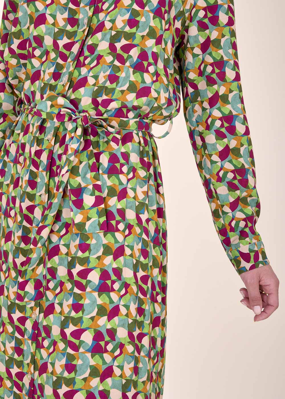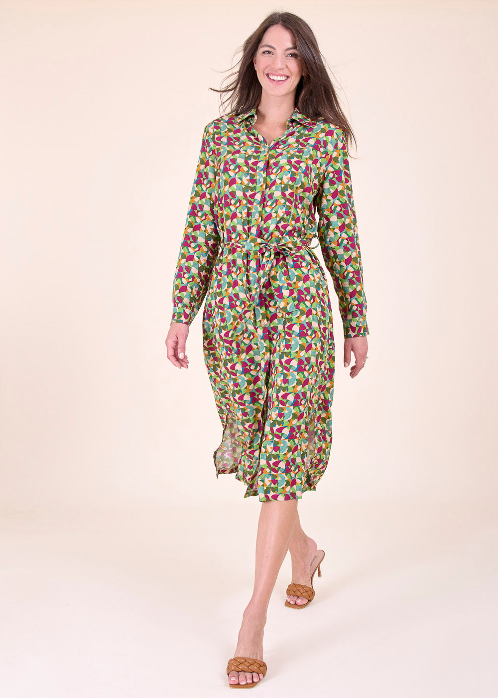 Maxikleid mit All-Over-Print in den neuen Herbst Trendfarben. Das Kleid hat lange Ärmel, die mit einer Manschette abschließen. Der kleine Hemdkragen mündet in einem V-Ausschnitt mit durchgängiger Knopfleiste und einem Bindegürtel. Der perfekte Begleiter für die Übergangszeit.