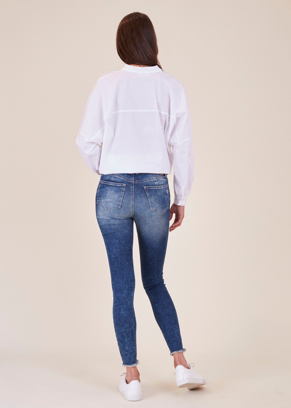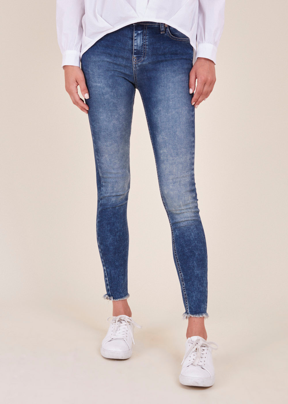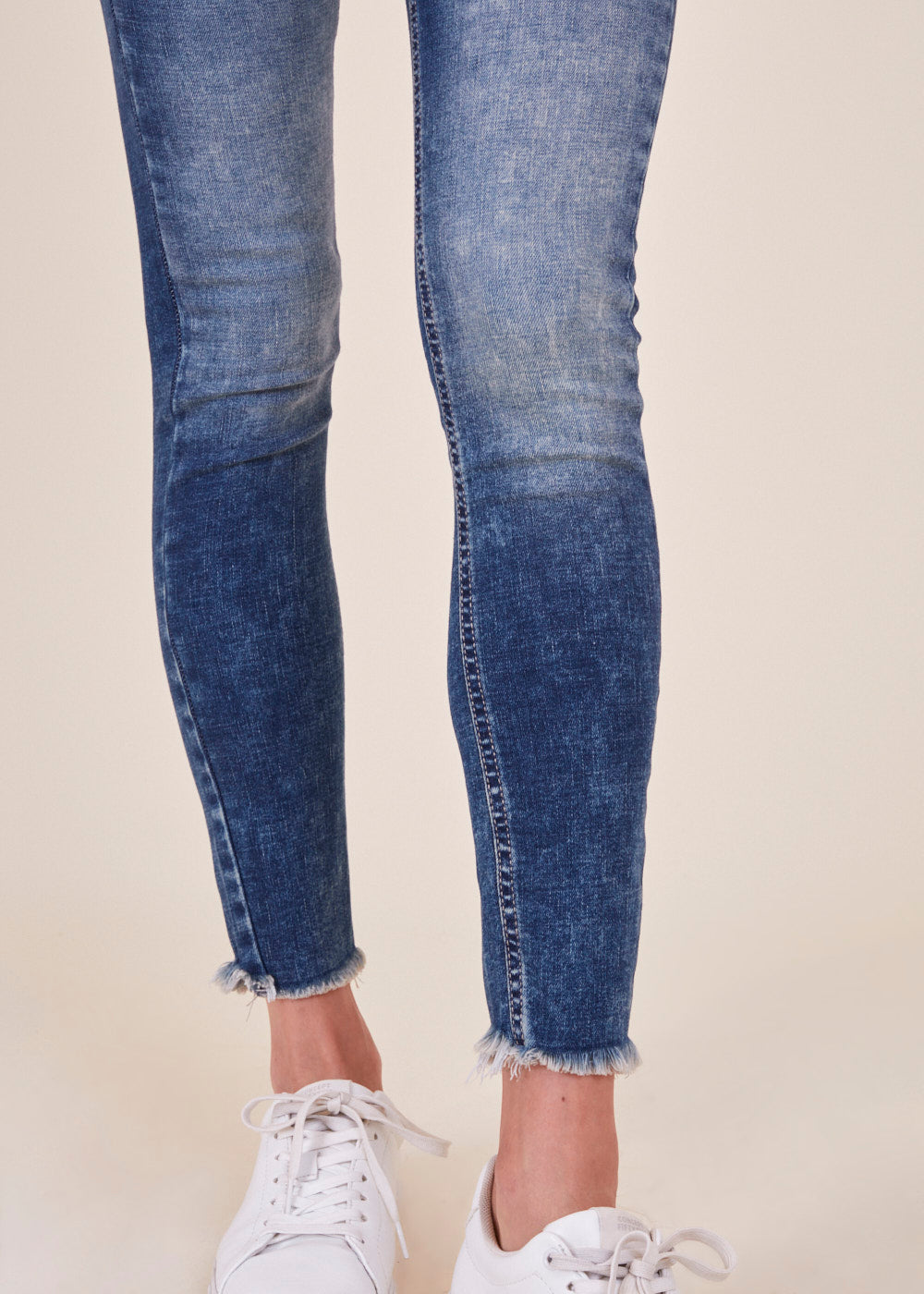 Yes, Please! Please-Jeans mit dunkelblauer Used-Waschung, seitlichen Eingriffstaschen und kleinem Metallherz auf der Gesäßtasche. Die Jeans hat einen engen Schnitt und passt sich durch ihr wundervolles Material optimal an deine Figur an.