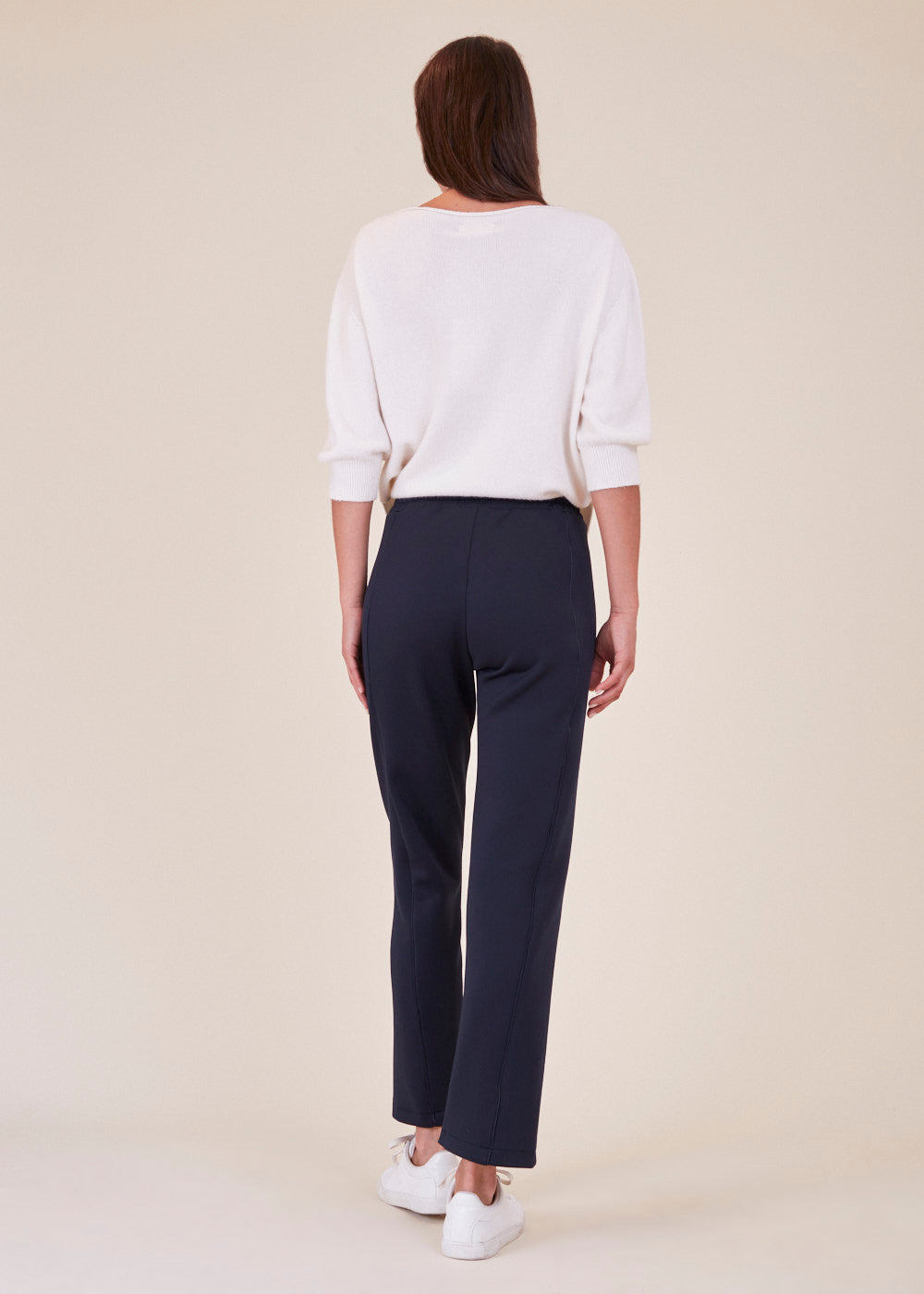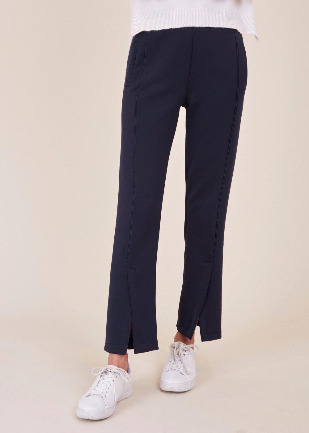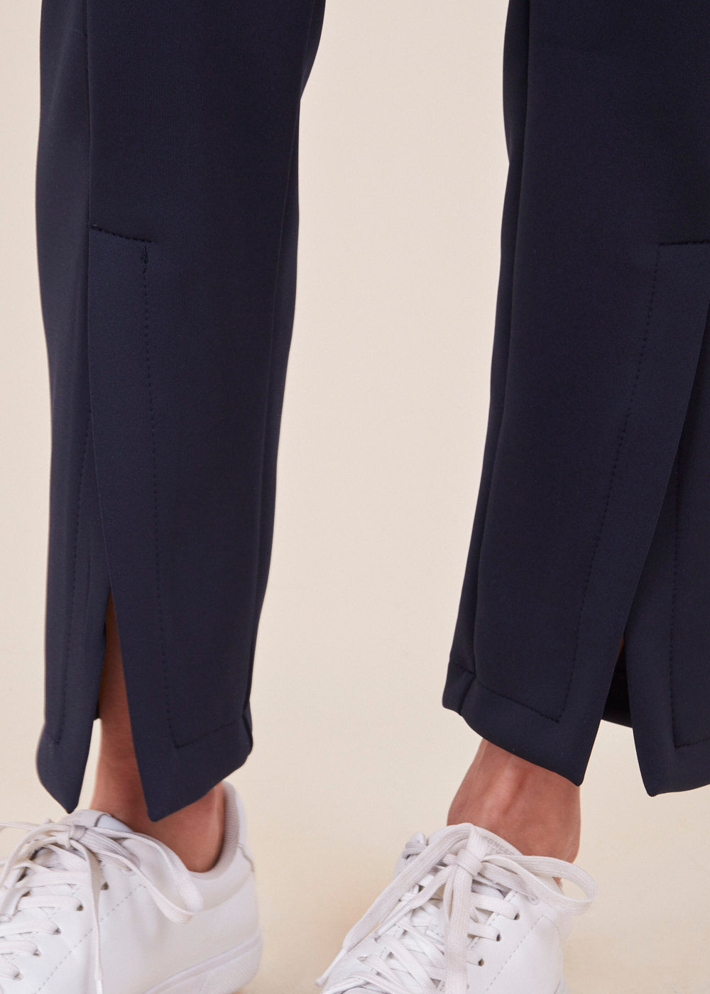 Hoch taillierte Hose in einem Mischgewebe aus Polyester und Elasthan. Dieses Modell hat einen Gummizug im Bund, schräge Seitentaschen und gerade, weite Beine mit vorderem Schlitz.