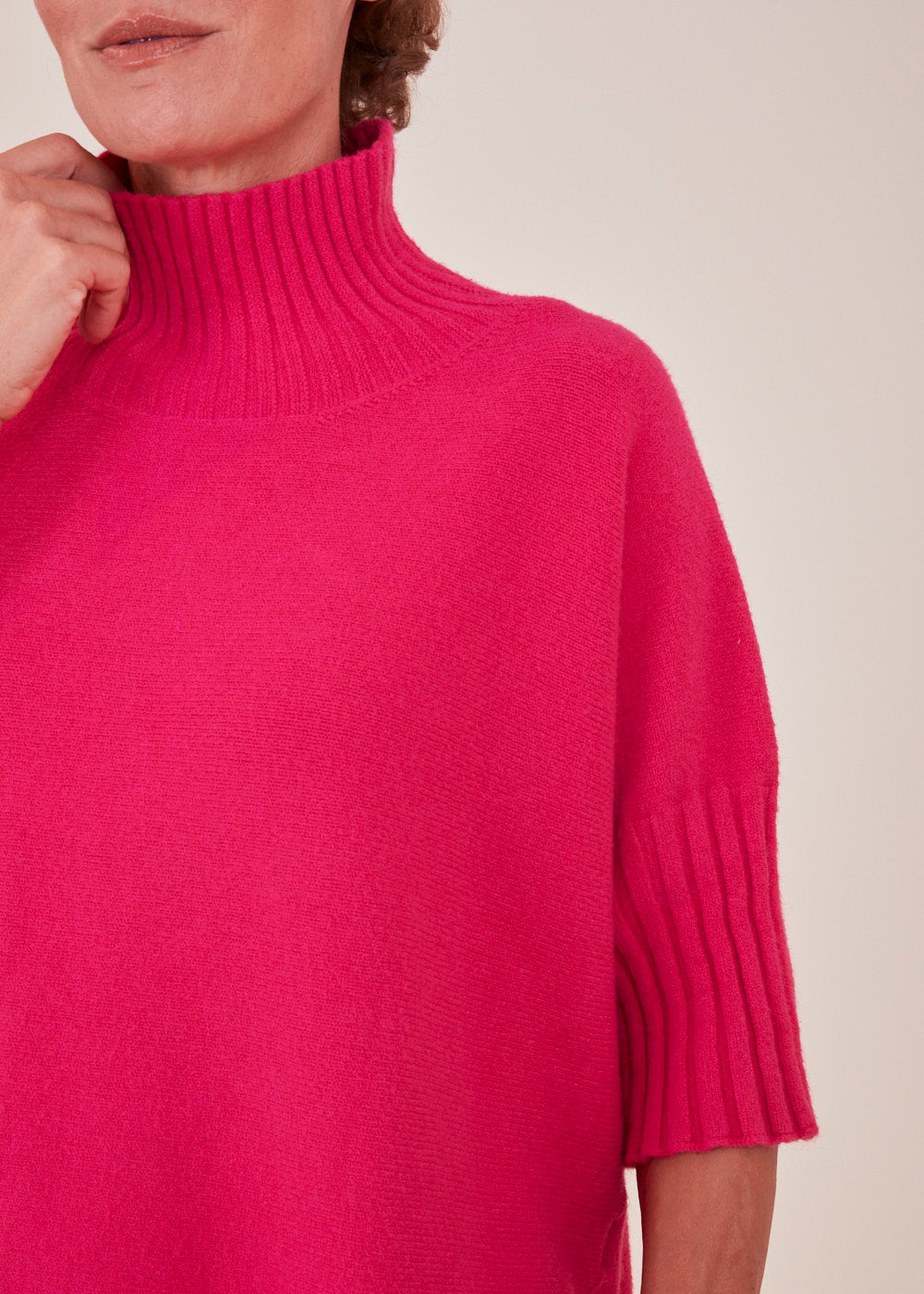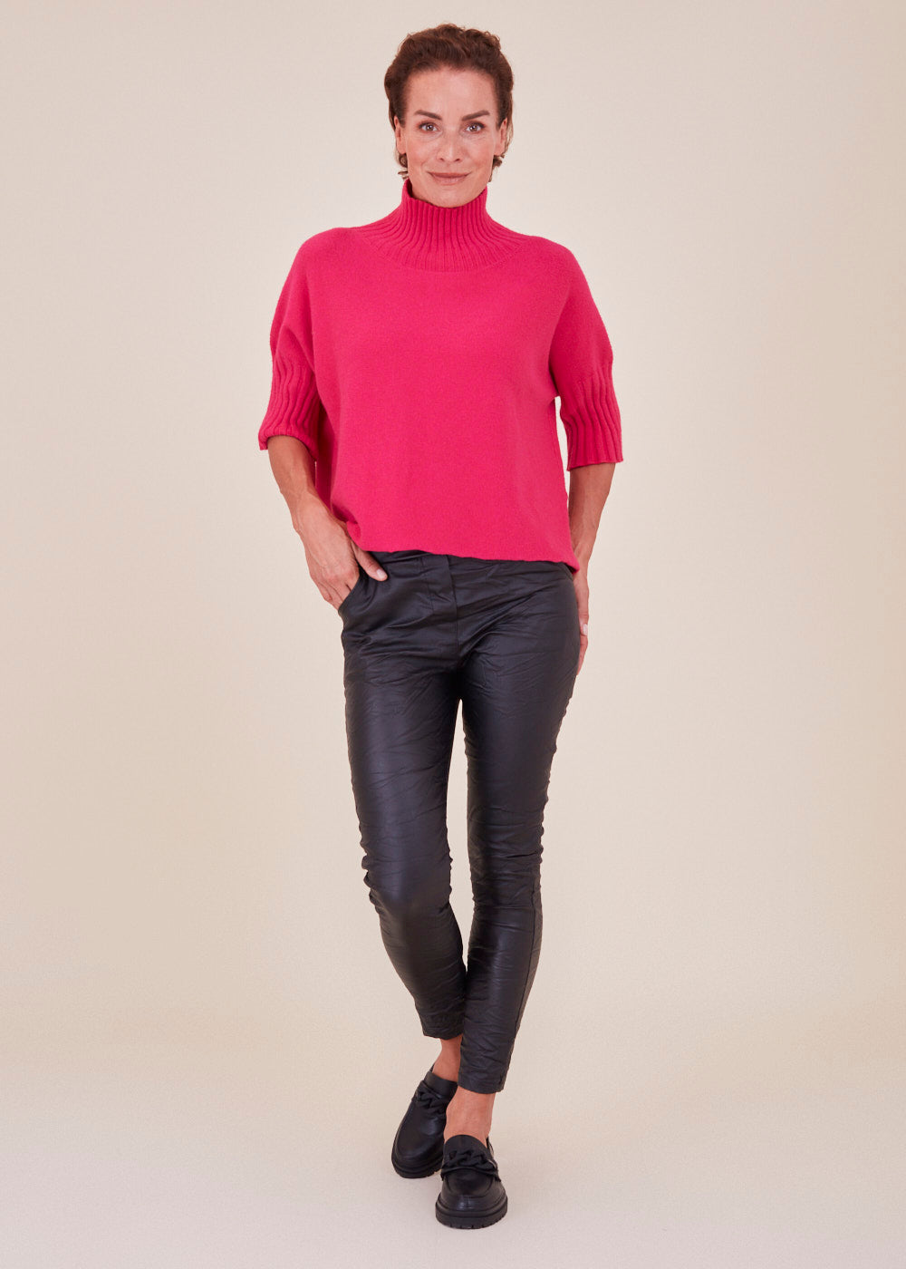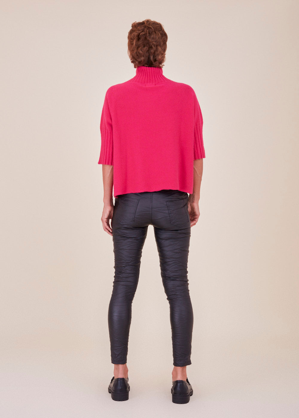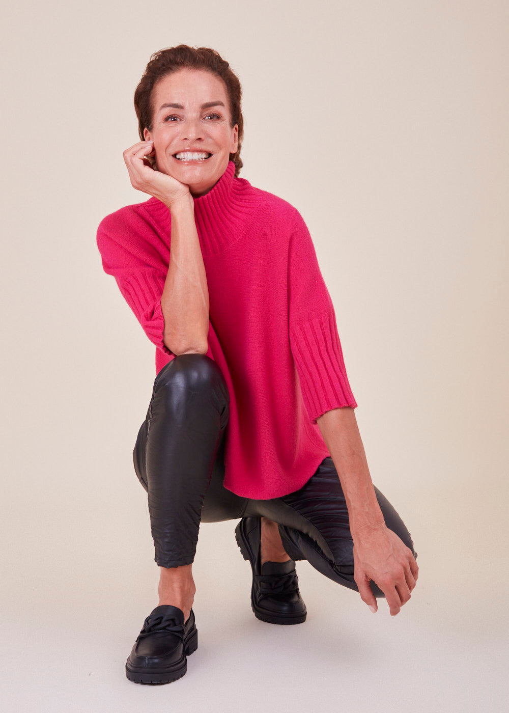 Kurz geschnittener Strickpullover mit Rollkragen aus unserem Kuschelgarn. Er hat ein Rippenbündchen am Kragen und an den Ärmeln. Mit kurz geschnittenen Armen.