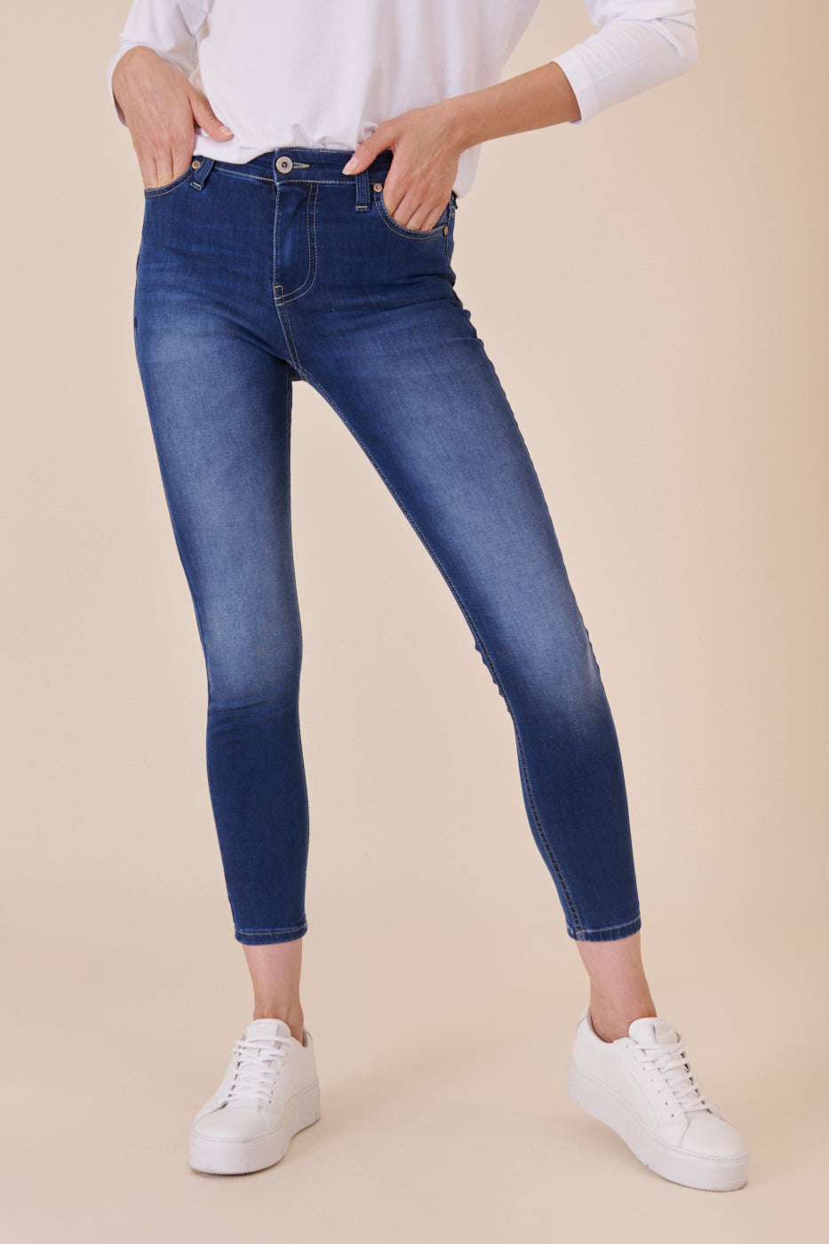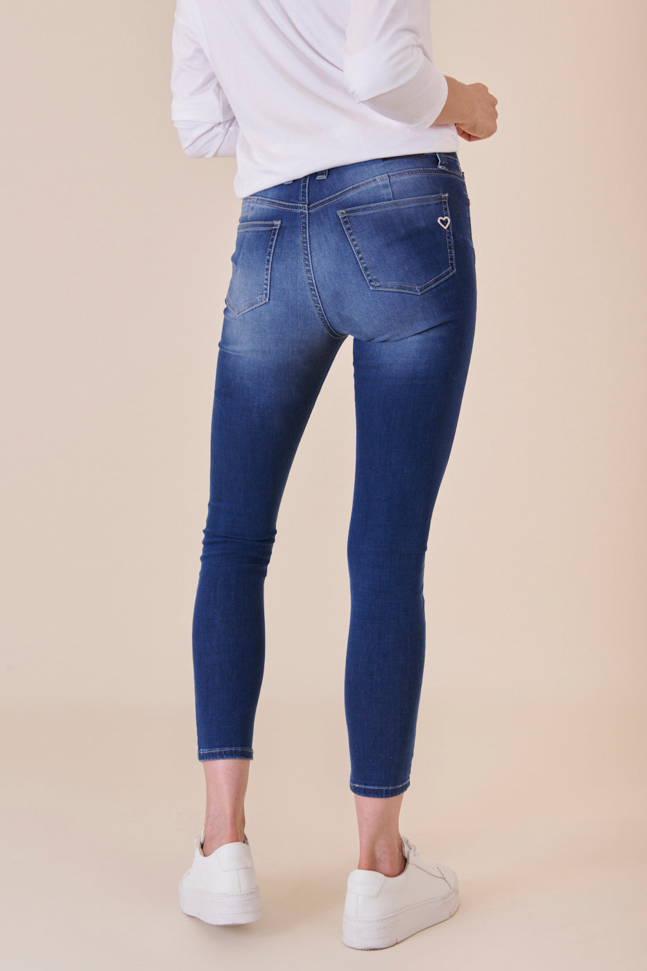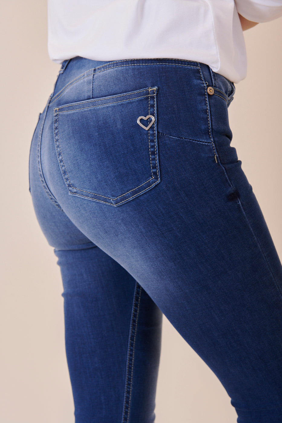 Yes, Please! Please-Jeans mit dunkelblauer Waschung, seitlichen Eingriffstaschen und kleinem Metallherz auf der Gesäßtasche. Die Jeans hat einen engen Schnitt und passt sich durch ihr wundervolles Material optimal an deine Figur an.
