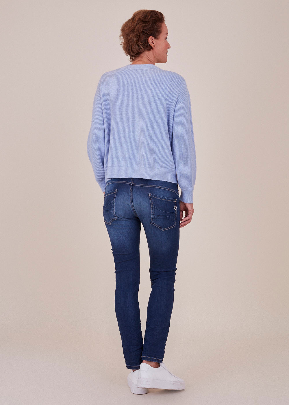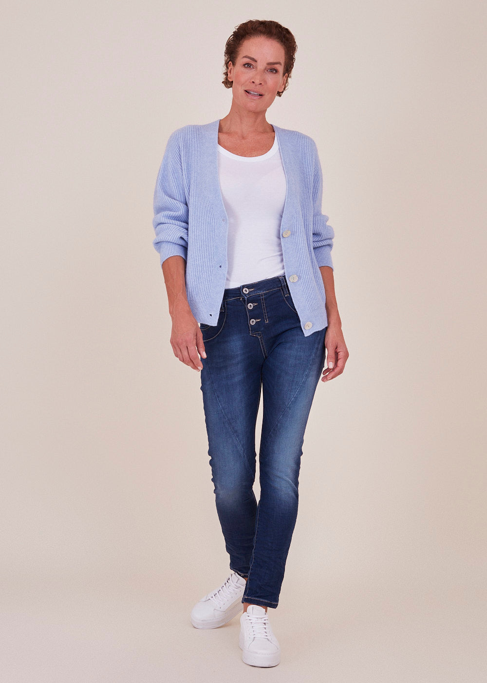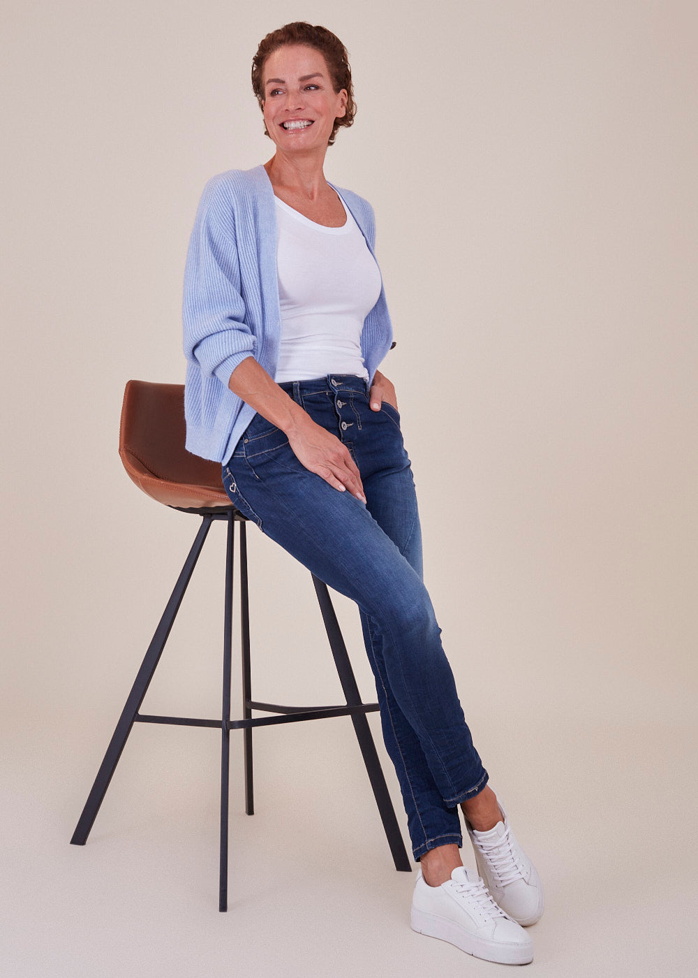 Boyfriend-Fit Jeans von Please in einer Stretch Variante. Sie sitzt locker auf den Hüften und hat die typische Ziernaht quer über die Vorderschenkel. Knopfleiste mit 3 Metallknöpfen vorn. Klassischer 5-Pocket Stil, mit dem kleinen Metallherz auf der Gesäßtasche.