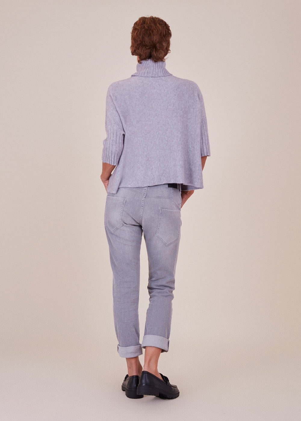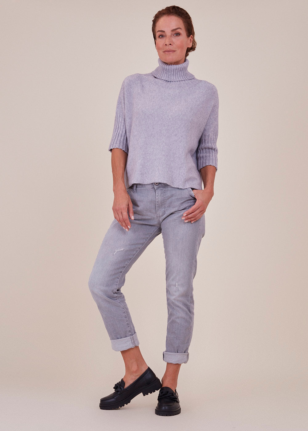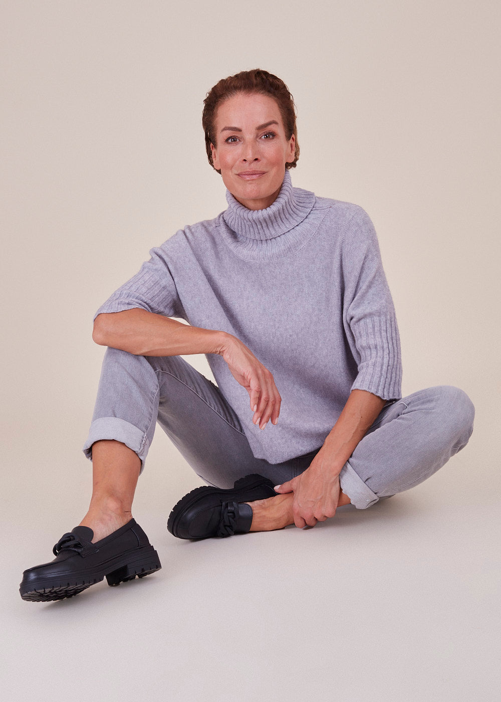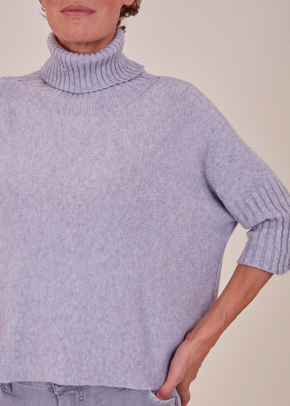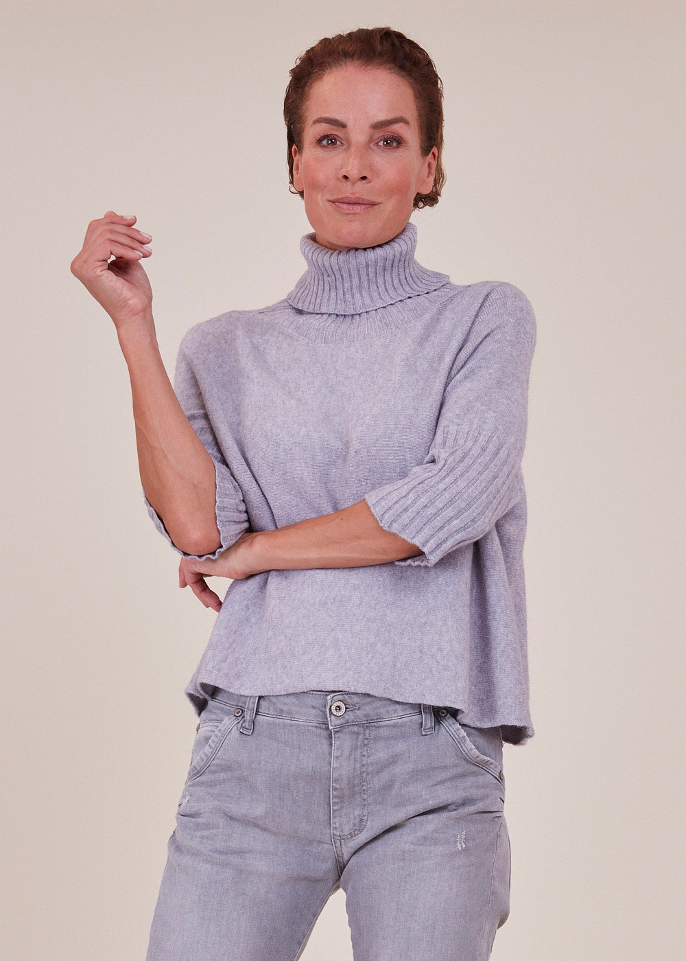 Kurz geschnittener Strickpullover mit Rollkragen aus unserem Kuschelgarn. Er hat ein Rippenbündchen am Kragen und an den Ärmeln. Mit kurz geschnittenen Armen.