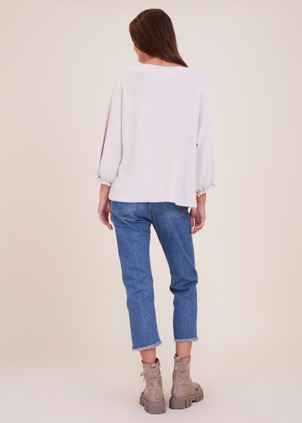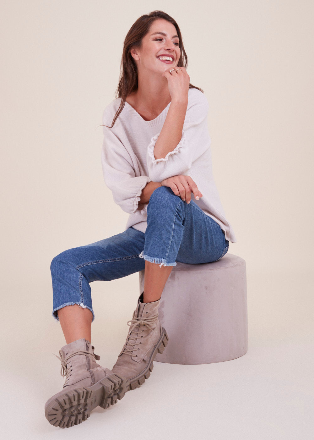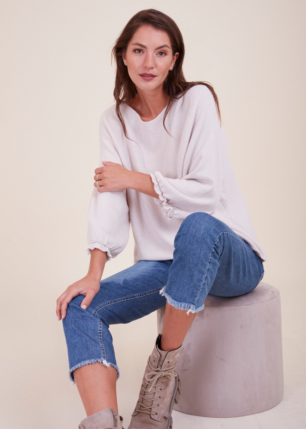 Locker geschnittener U-Bootausschnitt Pullover aus unserem Kuschelgarn. Mit besonderen Armdetail. Er ist durch seinen lässigen Schnitt perfekt in der Kombination mit einer unseren Skinny Jeans Hosen. Kuschelig und weich.