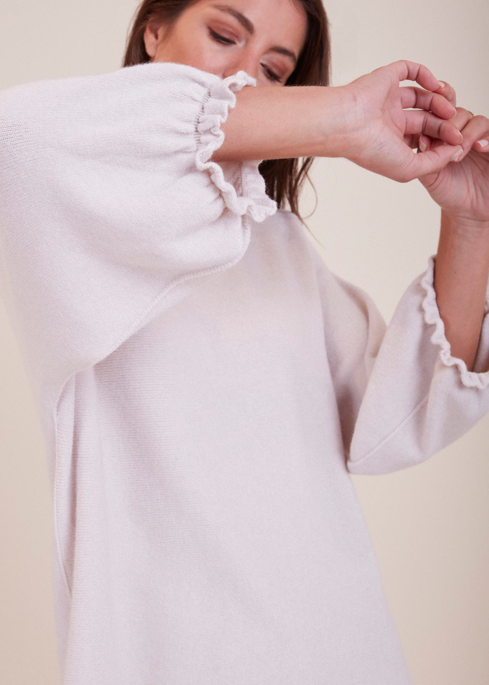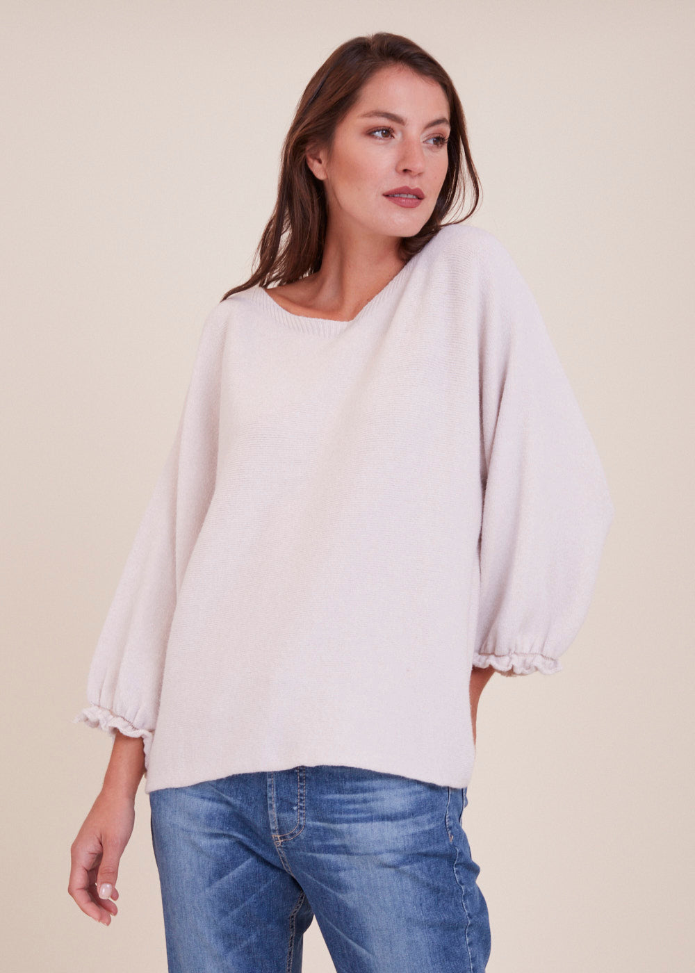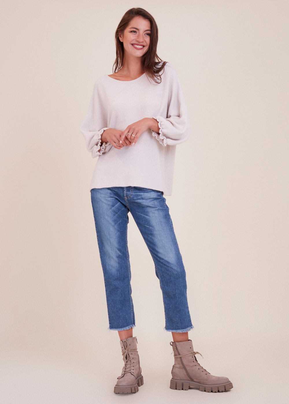 Locker geschnittener U-Bootausschnitt Pullover aus unserem Kuschelgarn. Mit besonderen Armdetail. Er ist durch seinen lässigen Schnitt perfekt in der Kombination mit einer unseren Skinny Jeans Hosen. Kuschelig und weich.
