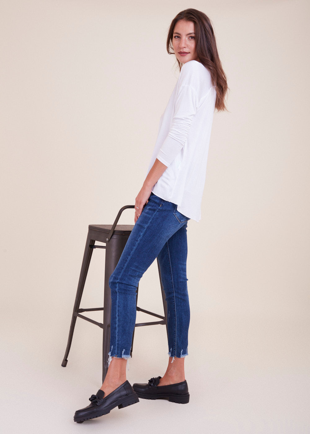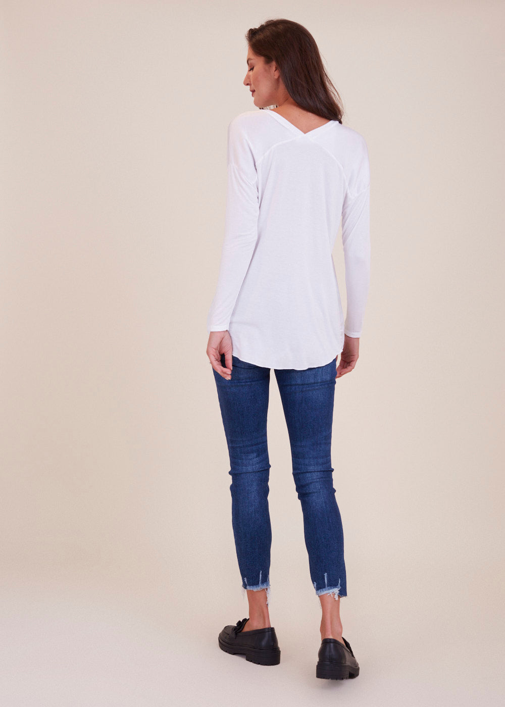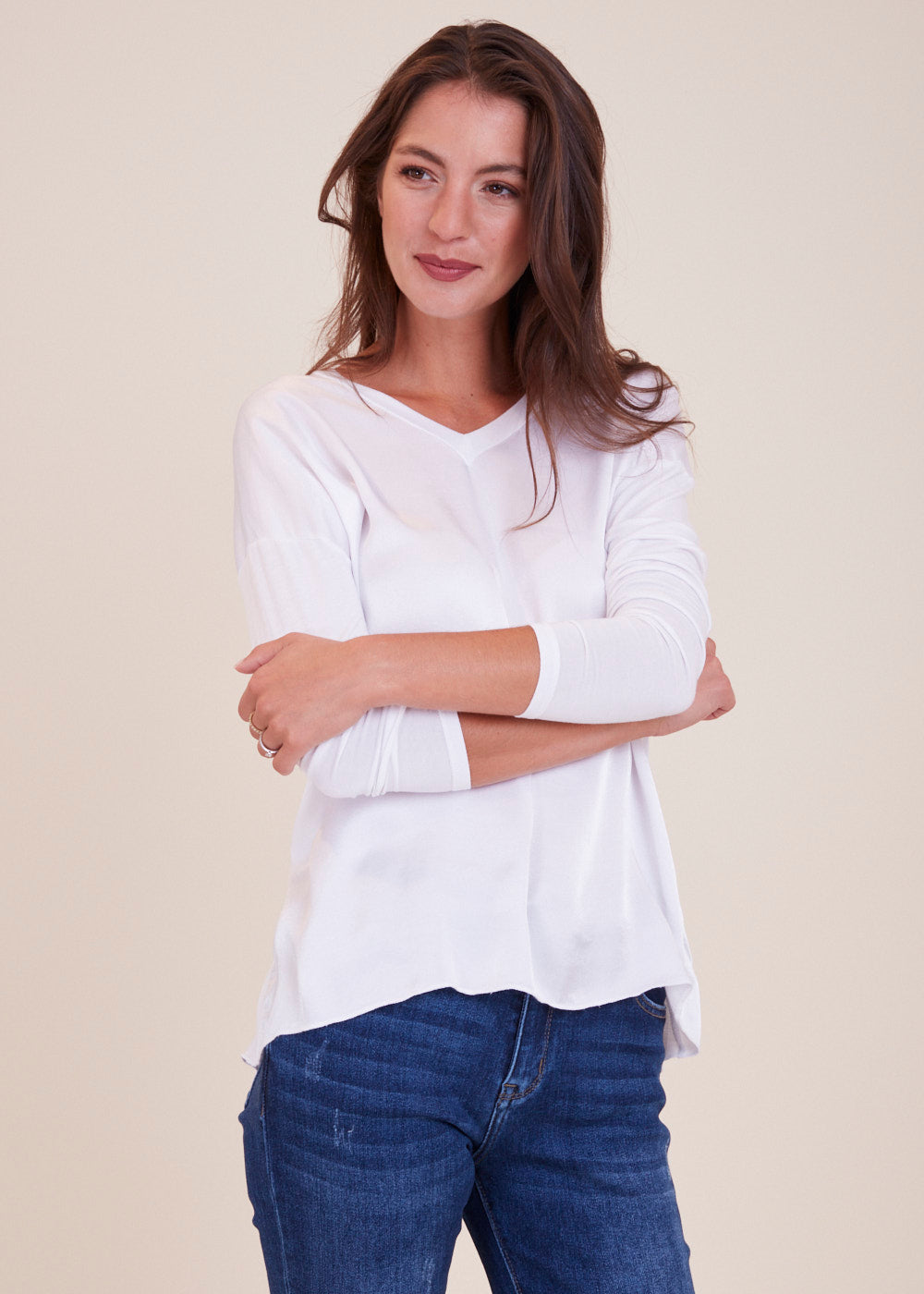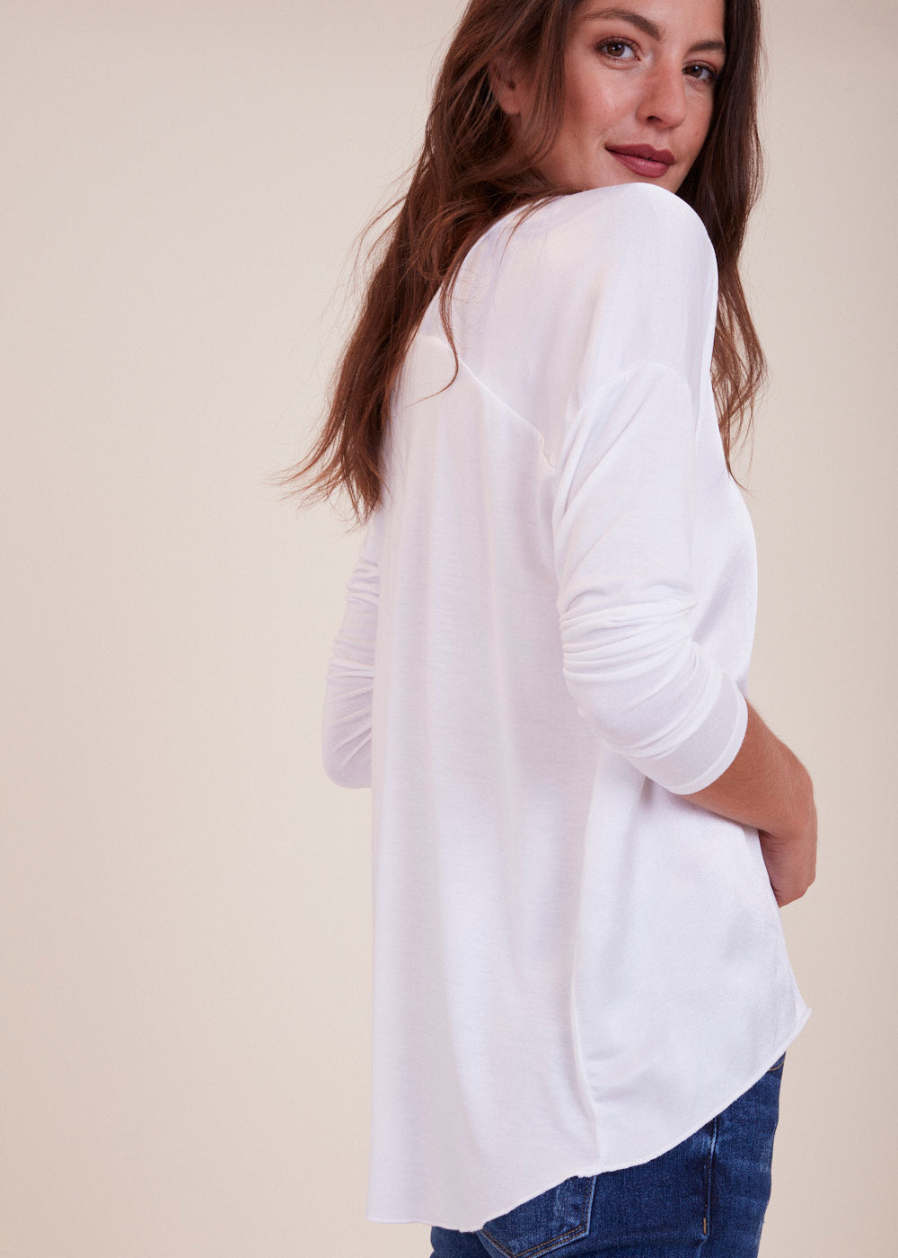 Basics sind ein absolutes Must-Have! Shirt mit langen Armen. Es hat einen Figurfernen Schnitt der nach hinten länger wird. Durch die zwei unterschiedlichen Materialen bekommt das Basic einen besonderen Touch. Der V-Ausschnitt sorgt darüber hinaus für ein schönes Dekolletee.