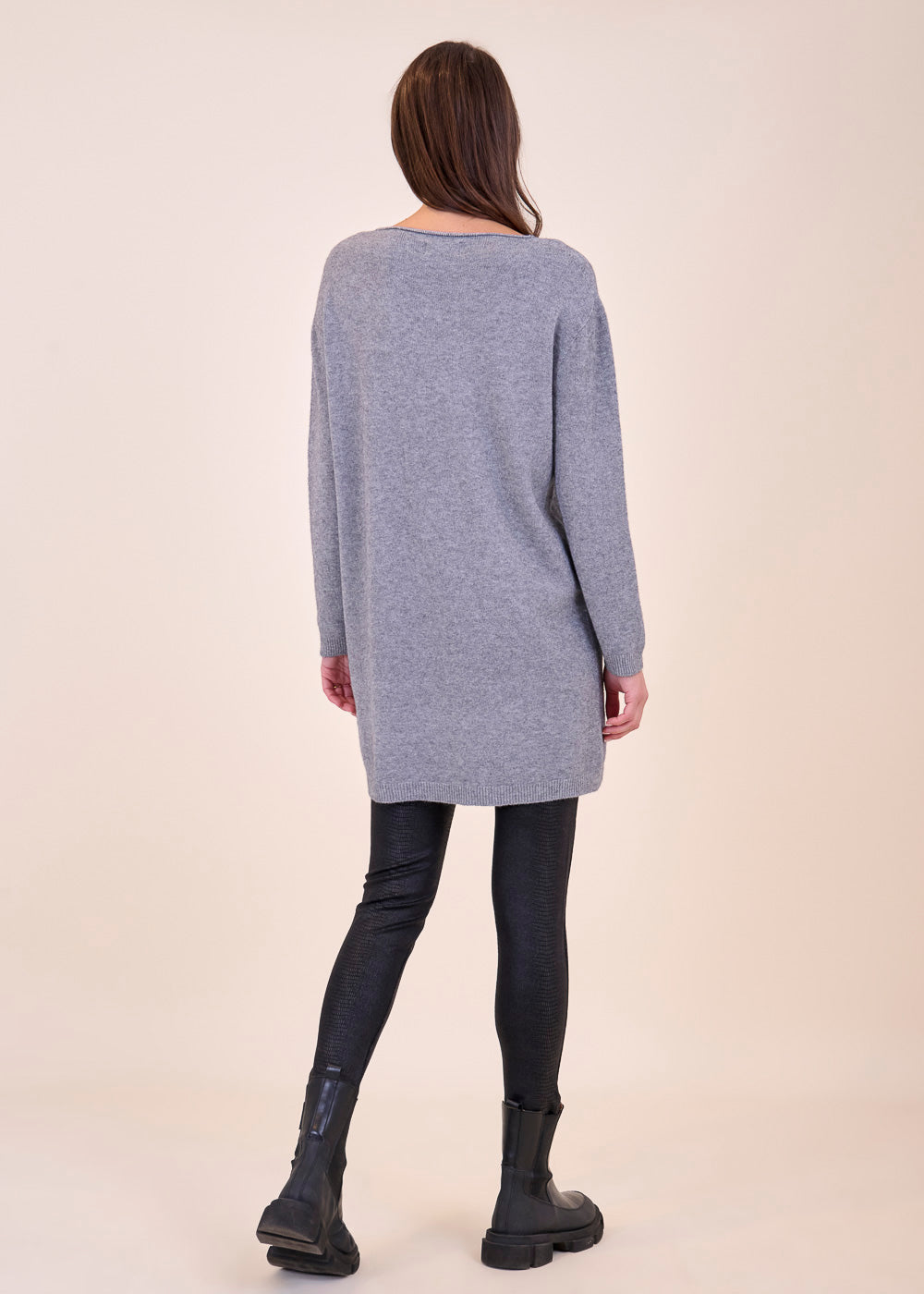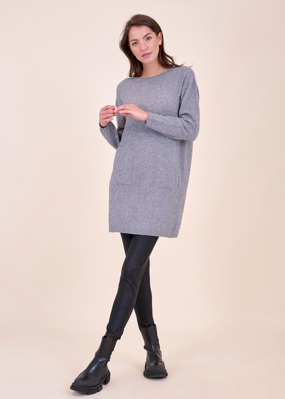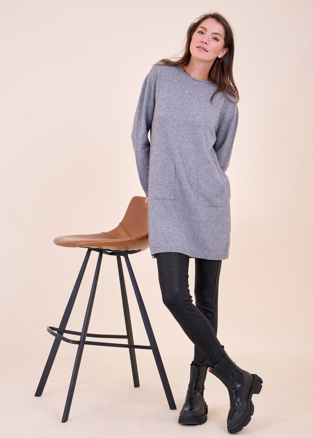 Lässig geschnittenes Strickleid aus unserem Kuschelgarn. Es hat lang geschnittene Arme und ein Rippenbündchen an den Saum, sowie an den Ärmeln. Die aufgesetzten Taschen geben dem Kleid eine gewisse Lässigkeit. Einfach zum Wohlfühlen!