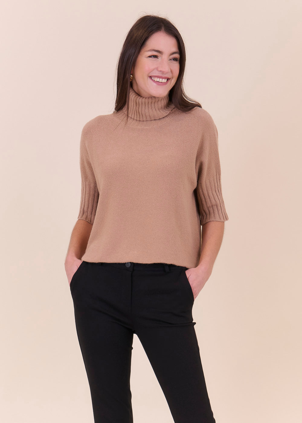 Kurz geschnittener Strickpullover mit Rollkragen aus unserem Kuschelgarn. Er hat ein Rippenbündchen am Kragen und an den Ärmeln. Mit kurz geschnittenen Armen.