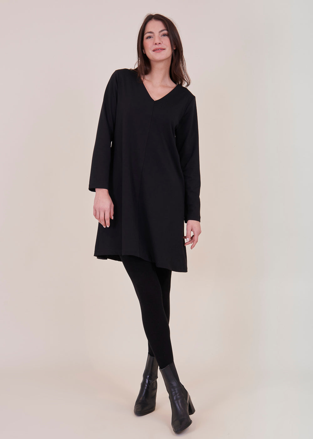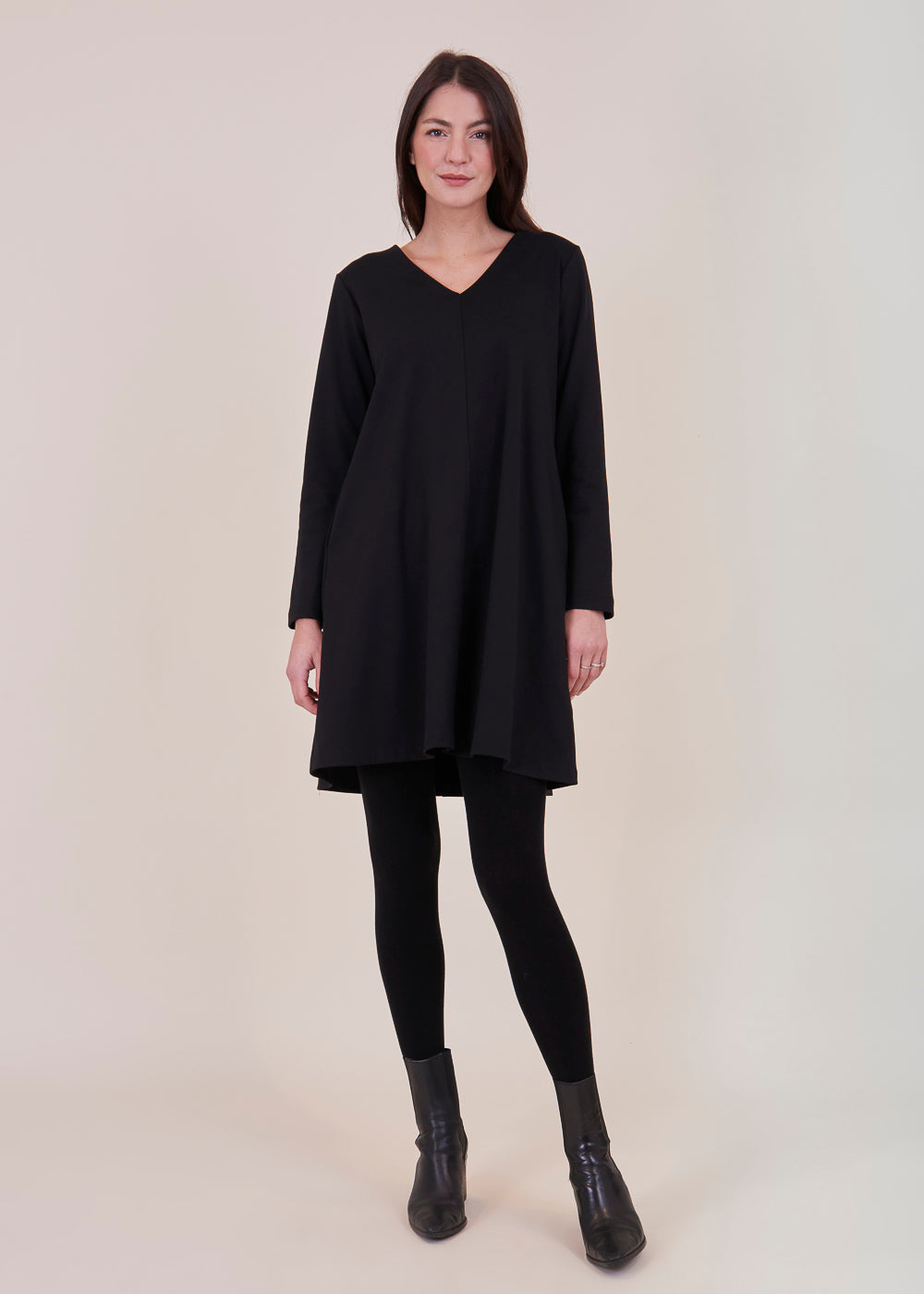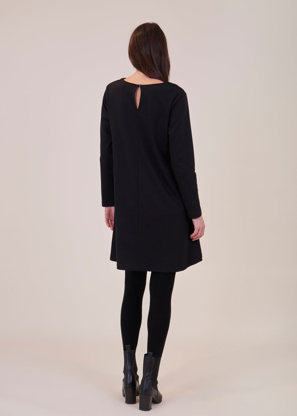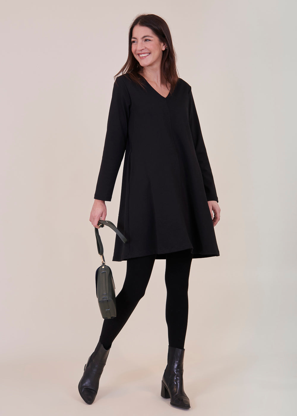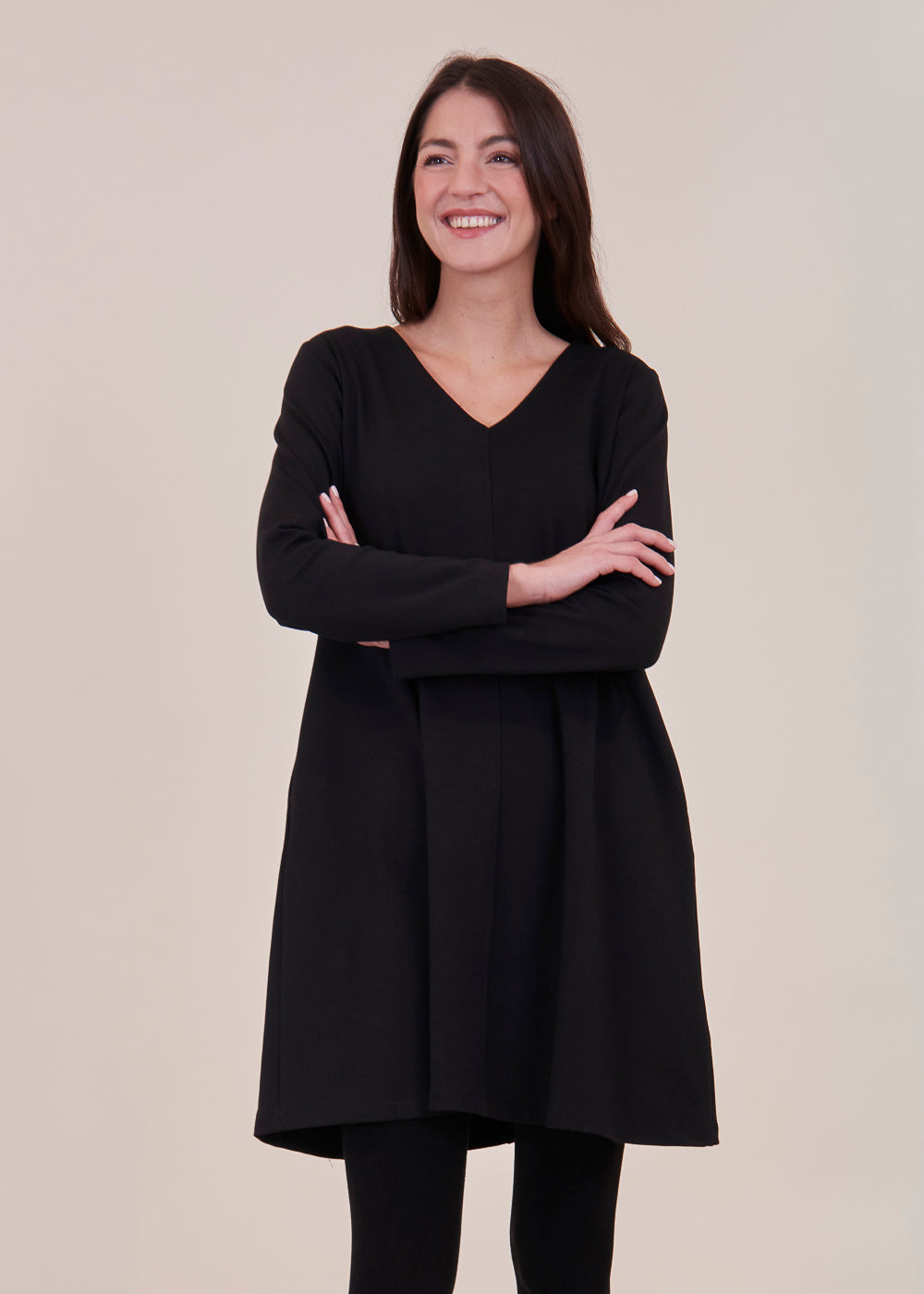 Besonderes Kleid in einem A-linien förmigen Schnitt. Der Ausschnitt des Kleides ist V-förmig, der Ärmel ist lang geschnitten. Mit seitlichen Eingriffstaschen. Das Material schmiegt sich angenehm an deinen Körper an und zaubert dir eine traumhafte Silhouette. Einfach perfekt für die bevorstehenden Festtage.