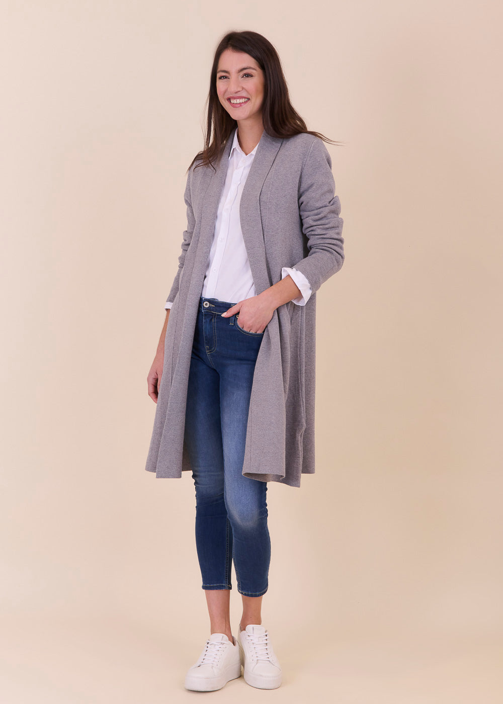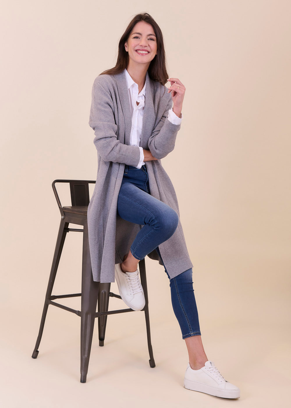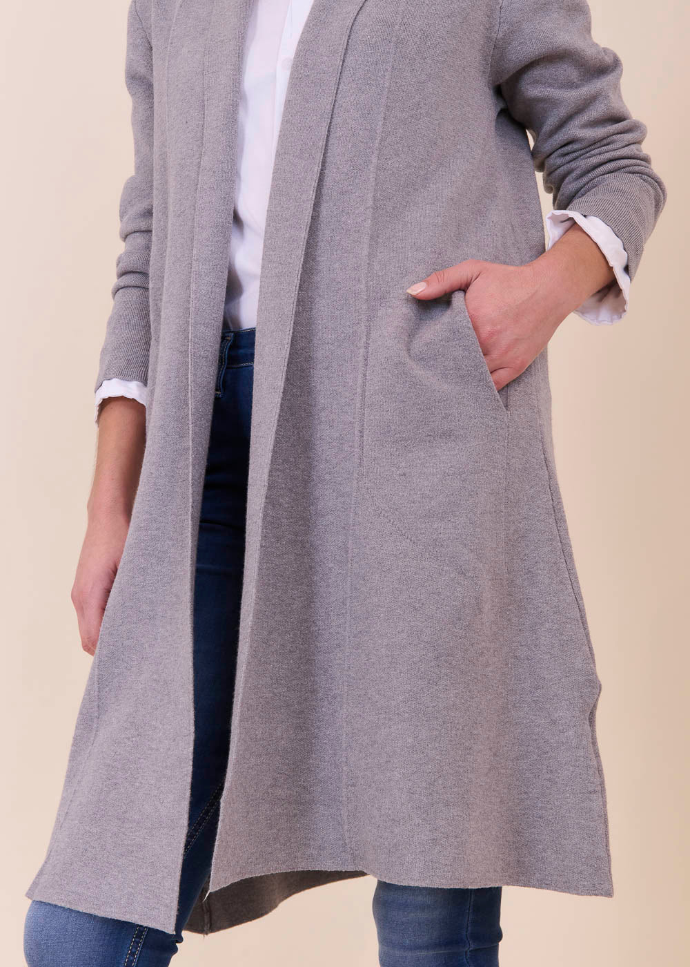 Diese lange Strickjacke aus unserem Kuschelgarn eignet sich perfekt für kühlere Tage unterwegs, zuhause oder im Büro. Der Cardigan ist lang geschnitten und so besonders lässig und bequem. In der verschlusslosen Art fällt die gemütliche Strickjacke locker und lädt zum Einkuscheln ein. Auch die seitlichen Eingriffstaschen verleihen einen lässigen Look für coole Herbst-Styles!