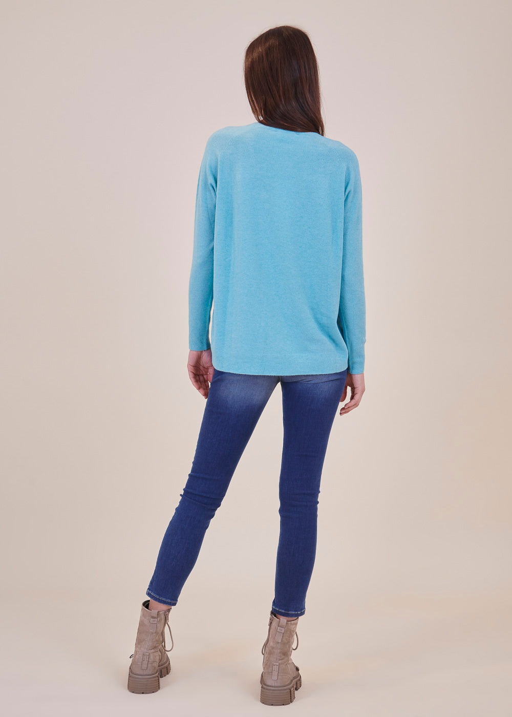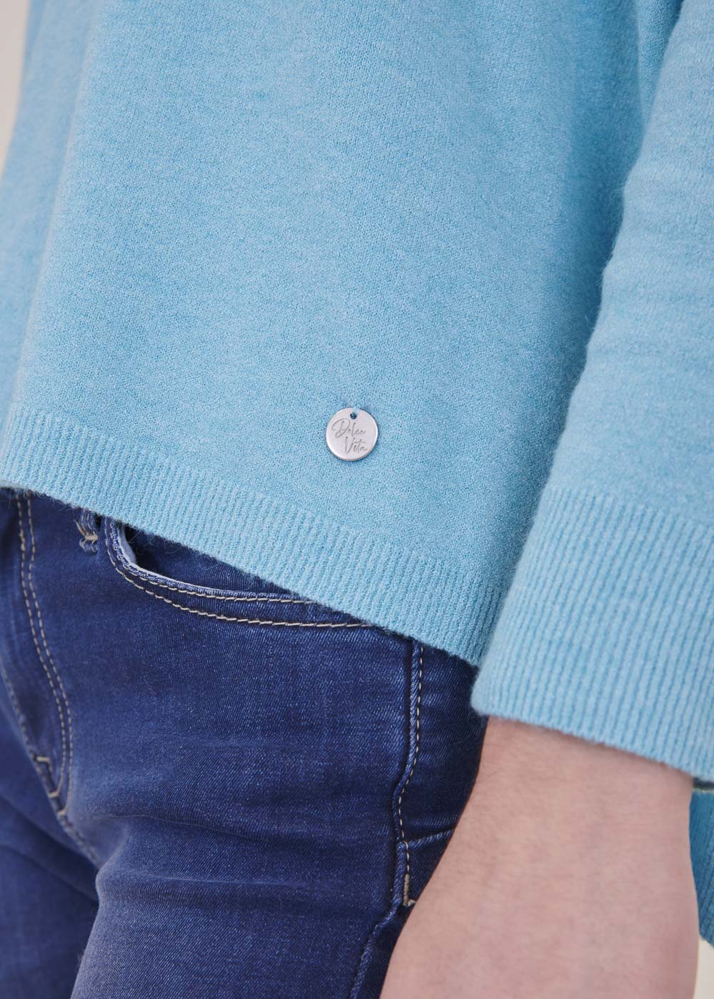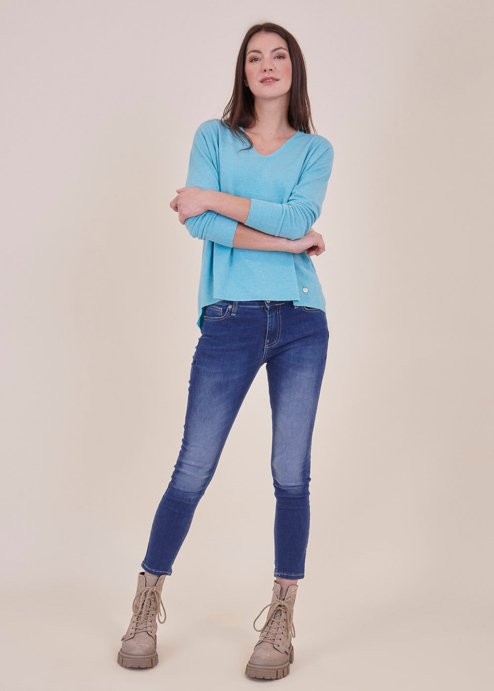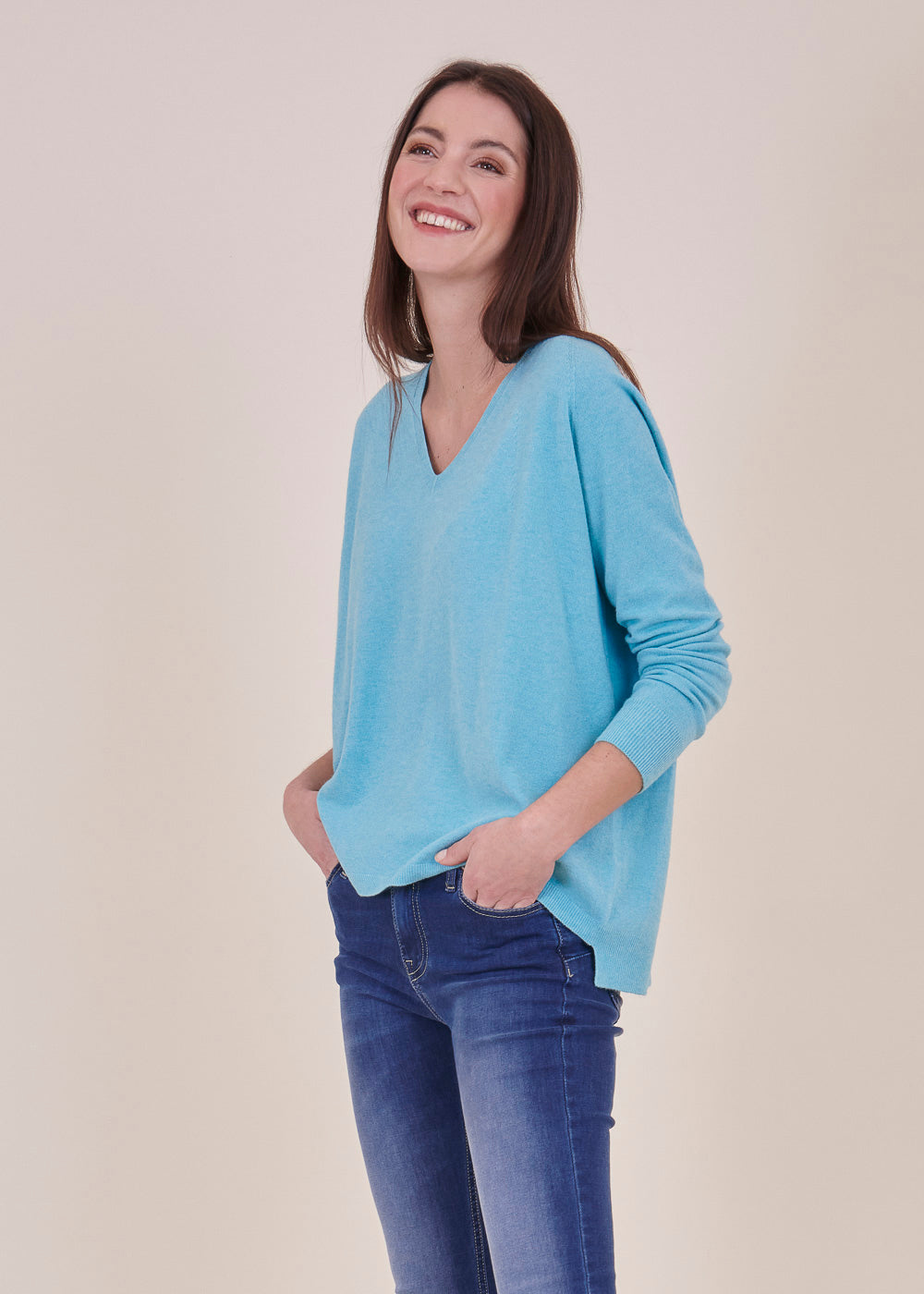 Dieser klassische Pullover ,in einem wunderschönen Aqua Ton, kann im Alltag absolut überzeugen. Der V-Pullover besteht aus einer weichen Strickqualität und ist vielseitig kombinierbar. Klassische Elemente wie der V-Ausschnitt, die langen Ärmel und der gerade Saum machen den Strickpulli zu einem Basic-Allrounder. Kuschelig weicher Tragekomfort mit absoluter Wohlfühlgarantie.