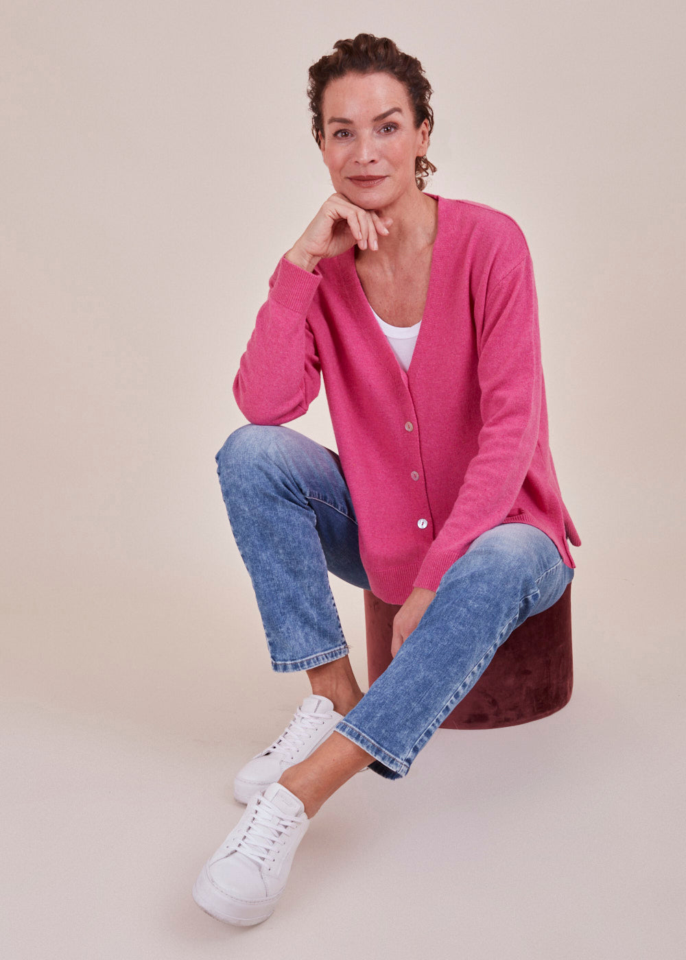 Kurz und kastenförmig geschnittene Strickjacke mit langen Armen. Sie hat ein Rippenbündchen an den Ärmeln und am Saum. Durch die besonderen Frontknöpfe lässt sich diese Jacke wunderbar geschlossen tragen. Zum darunter tragen empfehlen wir dir unsere Basic Tops. Kuschelig weicher Tragekomfort mit absoluter Wohlfühlgarantie.