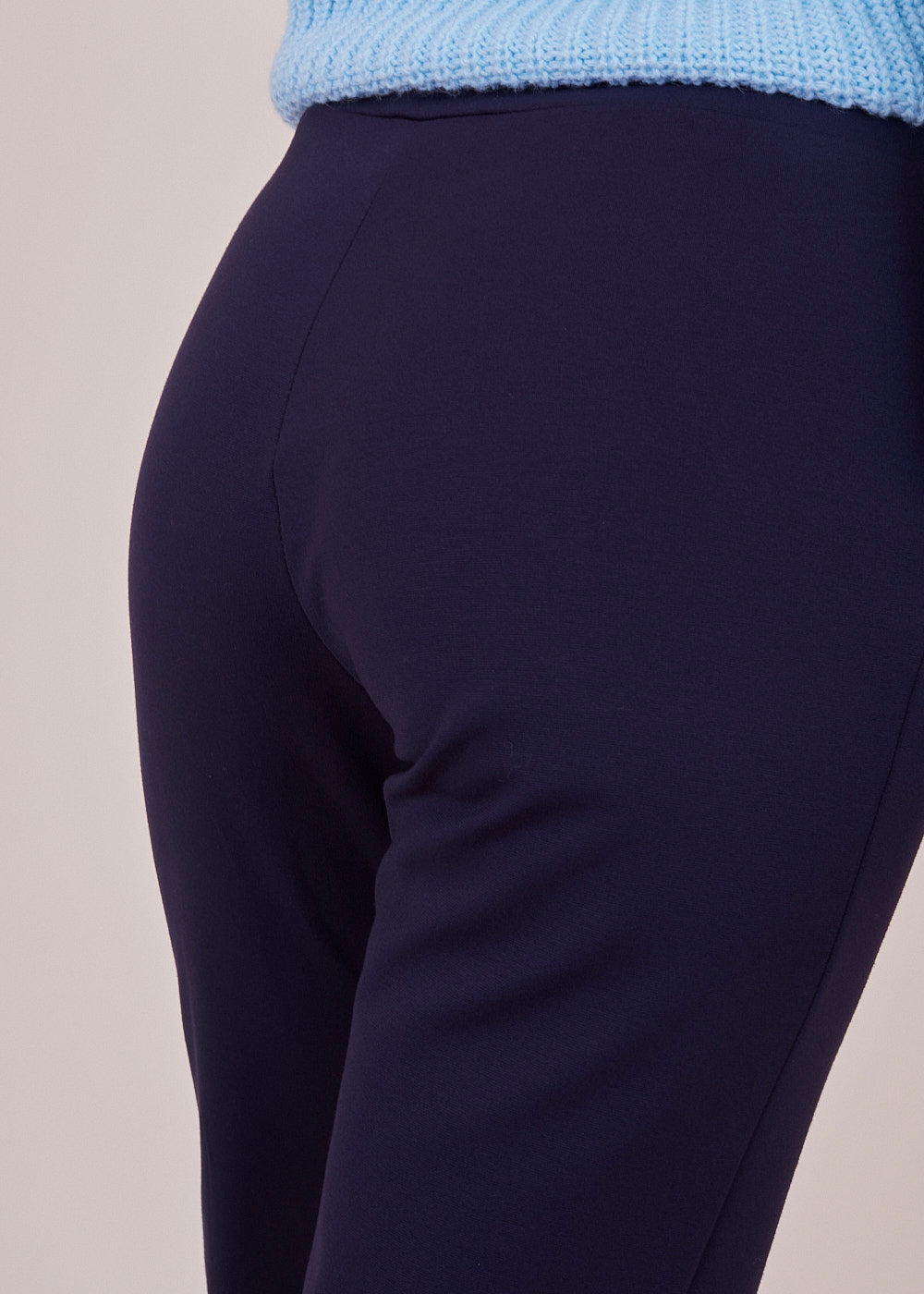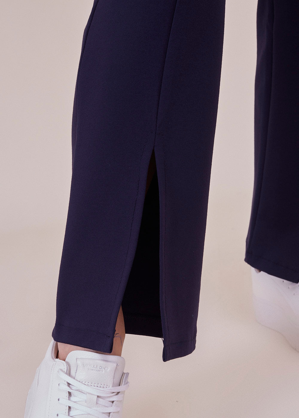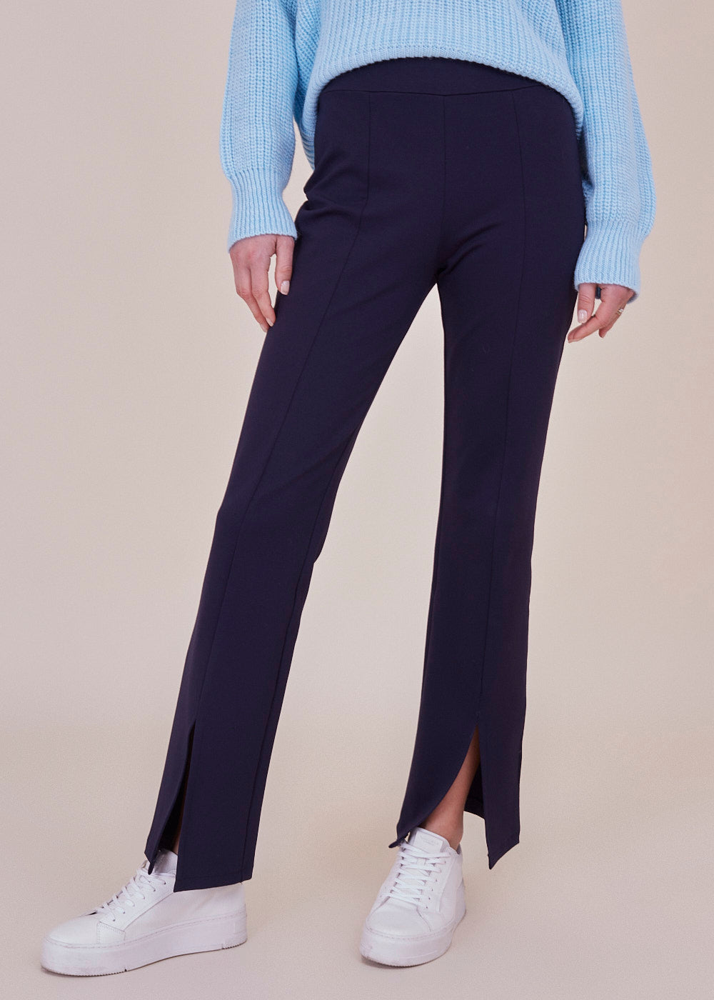 Hoch taillierte Hose in einem Mischgewebe aus Polyester und Elasthan. Dieses Modell hat einen Gummizug im Bund, schräge Seitentaschen und gerade, weite Beine mit vorderem Schlitz.