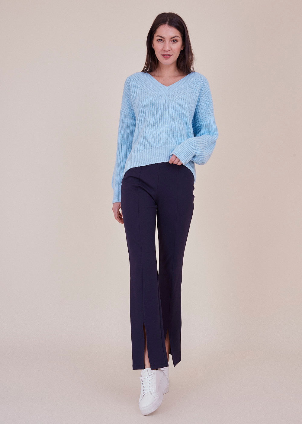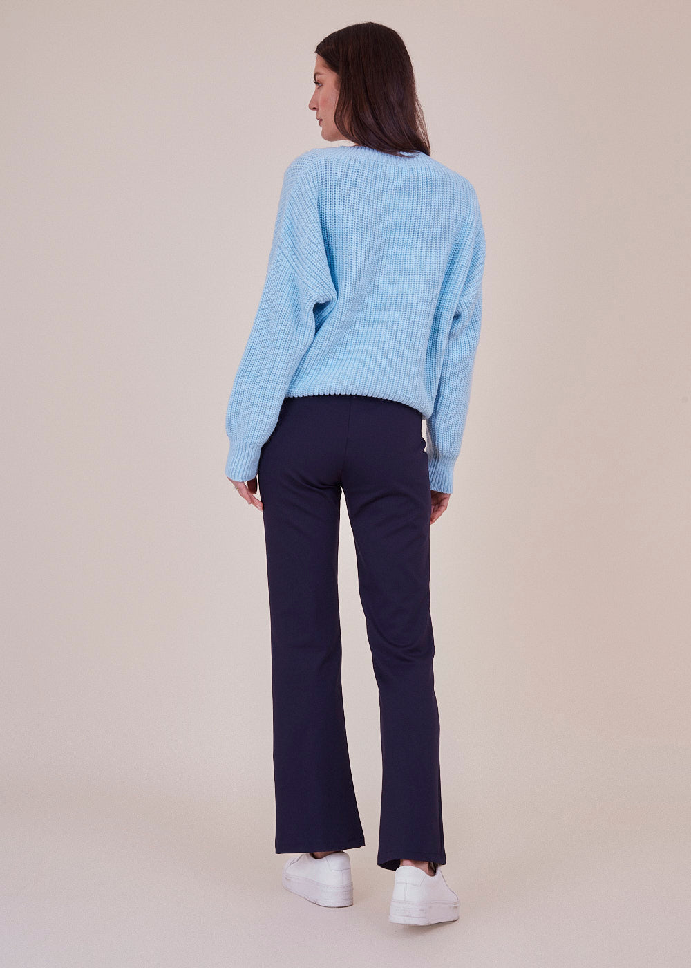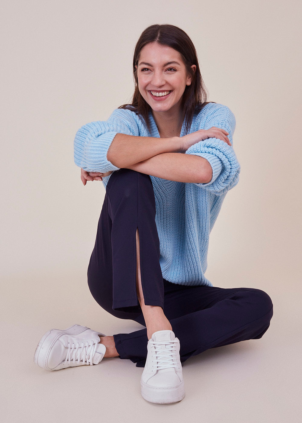 Hoch taillierte Hose in einem Mischgewebe aus Polyester und Elasthan. Dieses Modell hat einen Gummizug im Bund, schräge Seitentaschen und gerade, weite Beine mit vorderem Schlitz.