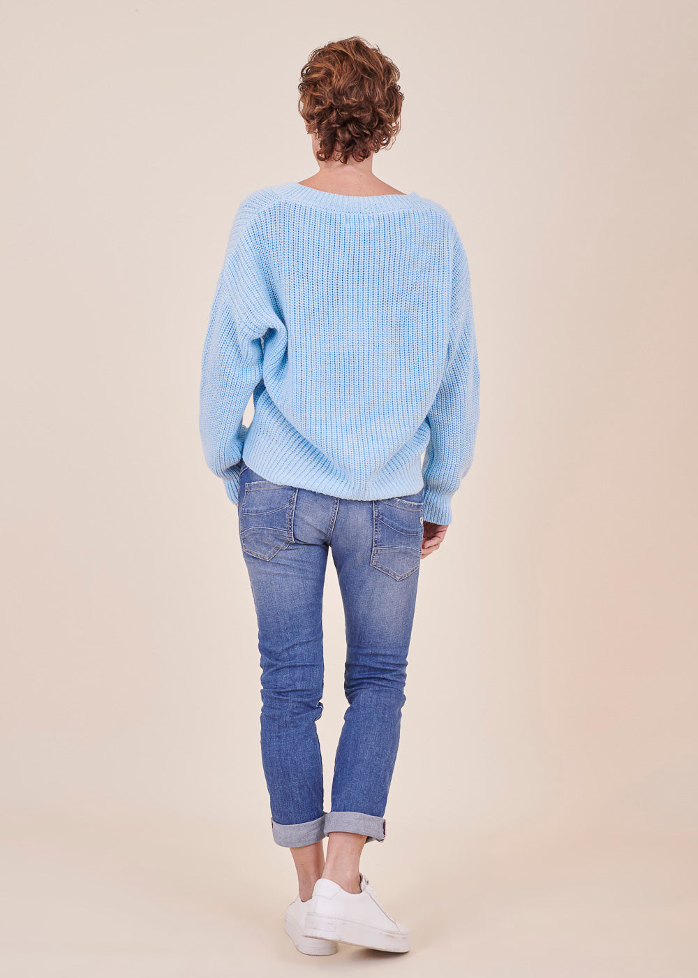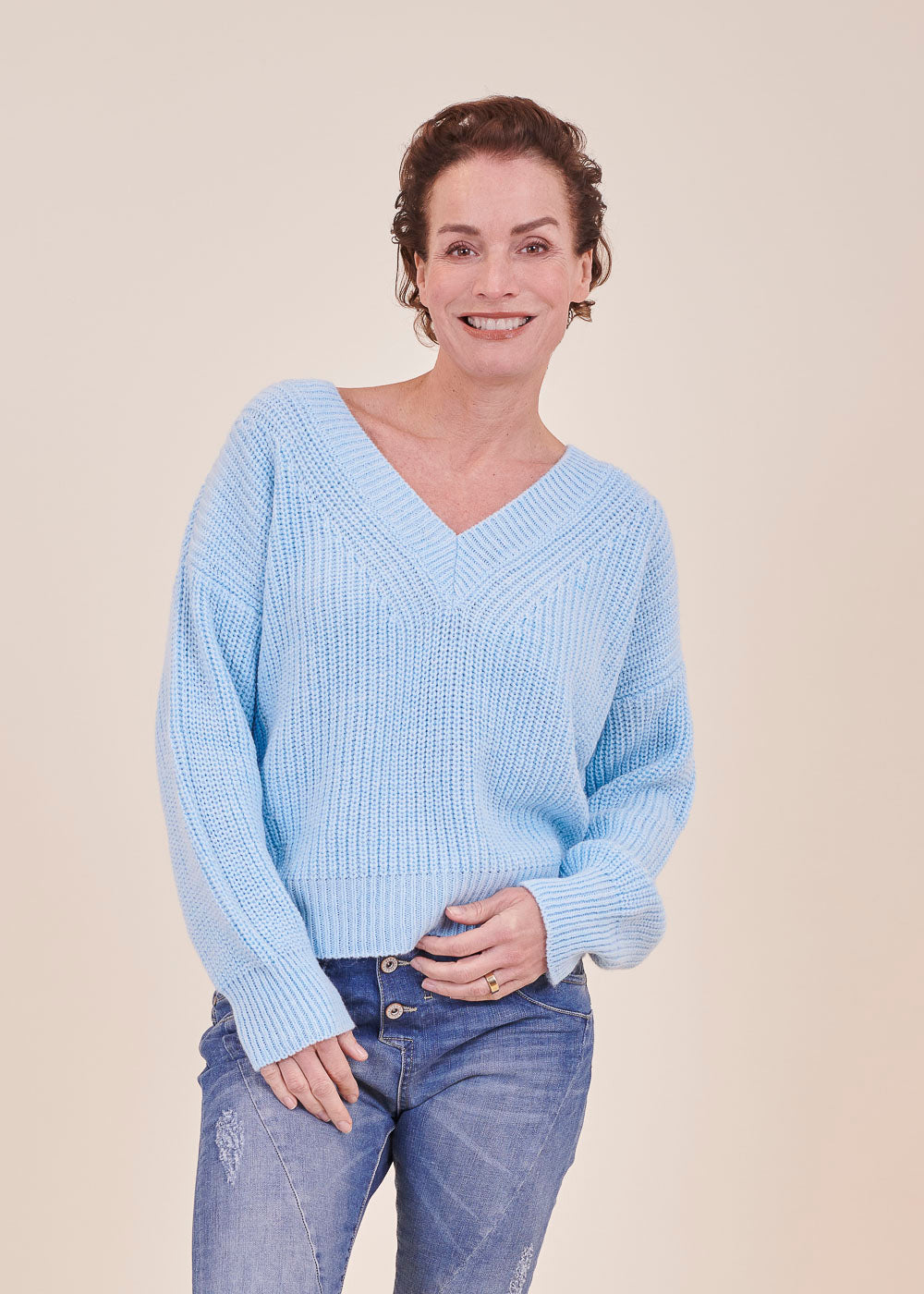 Wer kann dem schon widerstehen? Ein absoluter Traum ist dieser Grobstrick-Pullover in der Farbe Celeste. Der Langarmpullover ist nicht nur traumhaft schön, er ist auch ein super bequemes Teil. Sowohl die behagliche Materialmischung, als auch der legere Schnitt sorgen für einen optimalen Tragekomfort. Der V-Ausschnitt rundet das schicke Gesamtbild ab und unterstreicht zudem die gestreckte Form.