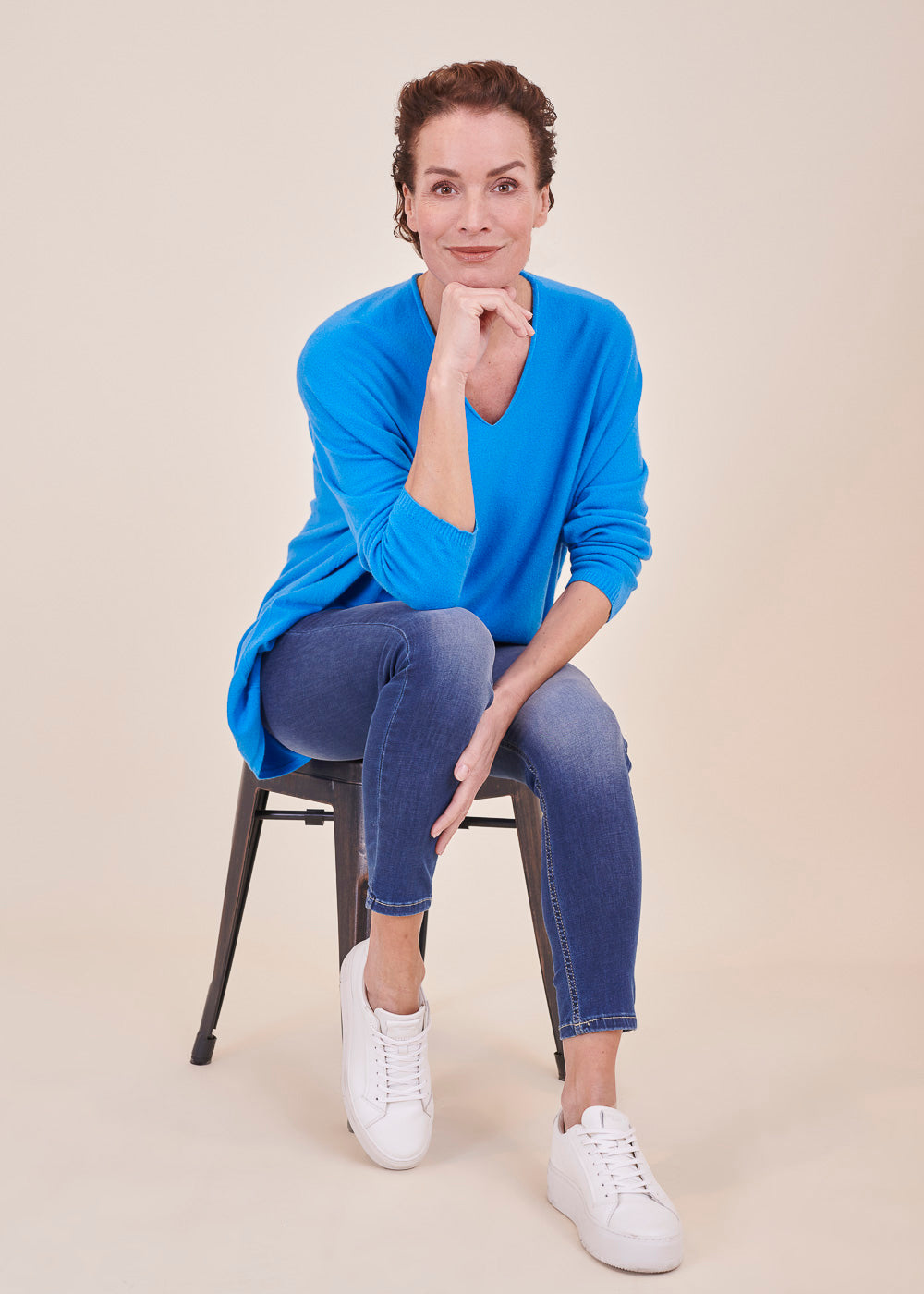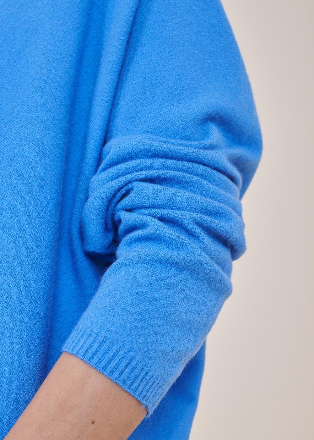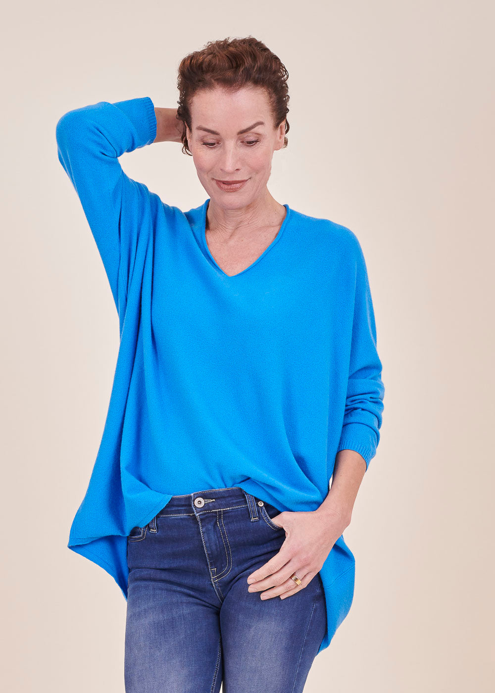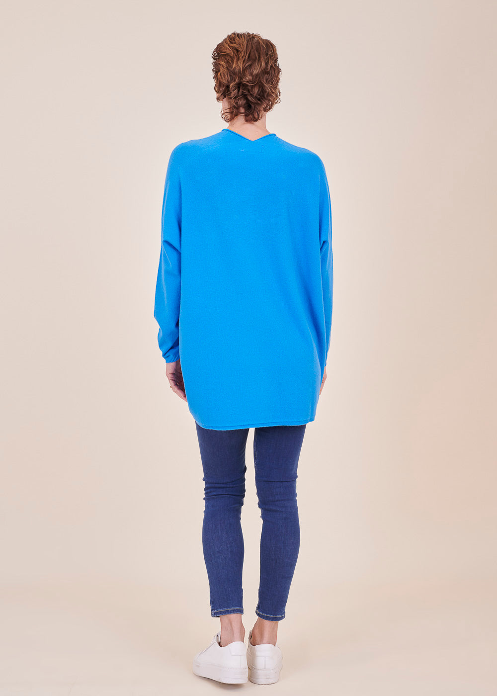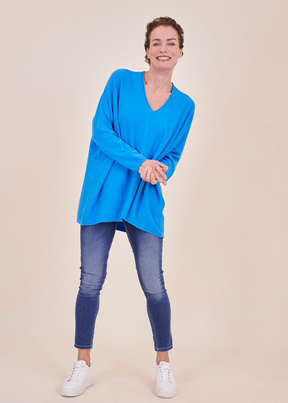 Leichter und gemütlicher Oversizepullover mit V-Ausschnitt. Mit überschnittenen Ärmeln aus unserem Kuschelgarn. Rippenbündchen an den Ärmeln und Schlitzen an den Seiten. Einfach zum Wohlfühlen. Kombiniere diesen Artikel gerne mit einer unserer Please Skinny Jeans.