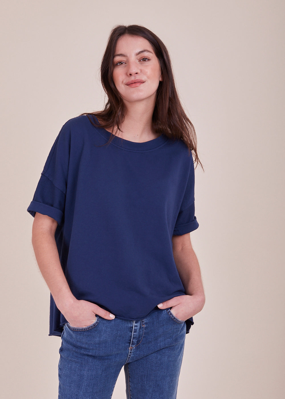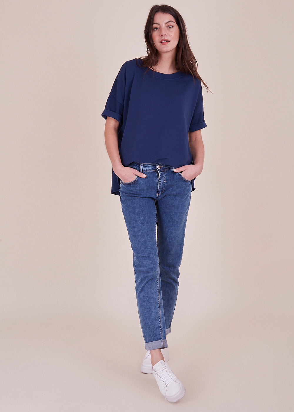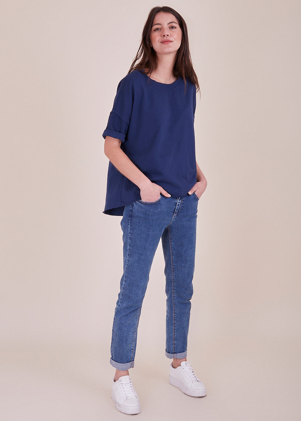 Lässig geschnittenes Sweatshirt mit kurzen Armen und Rundhalsausschnitt. Ein absolutes Must-Have für deinen Kleiderschrank. Es lässt sich ideal unter unseren Strickjacken kombinieren. Oder trage es als Basic zu einer Jeans und Sneakern.