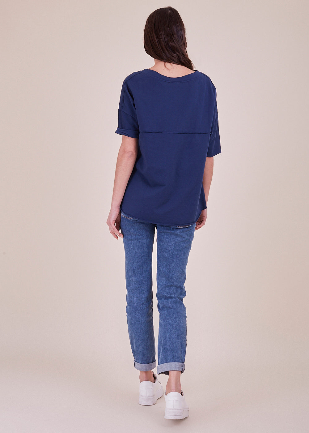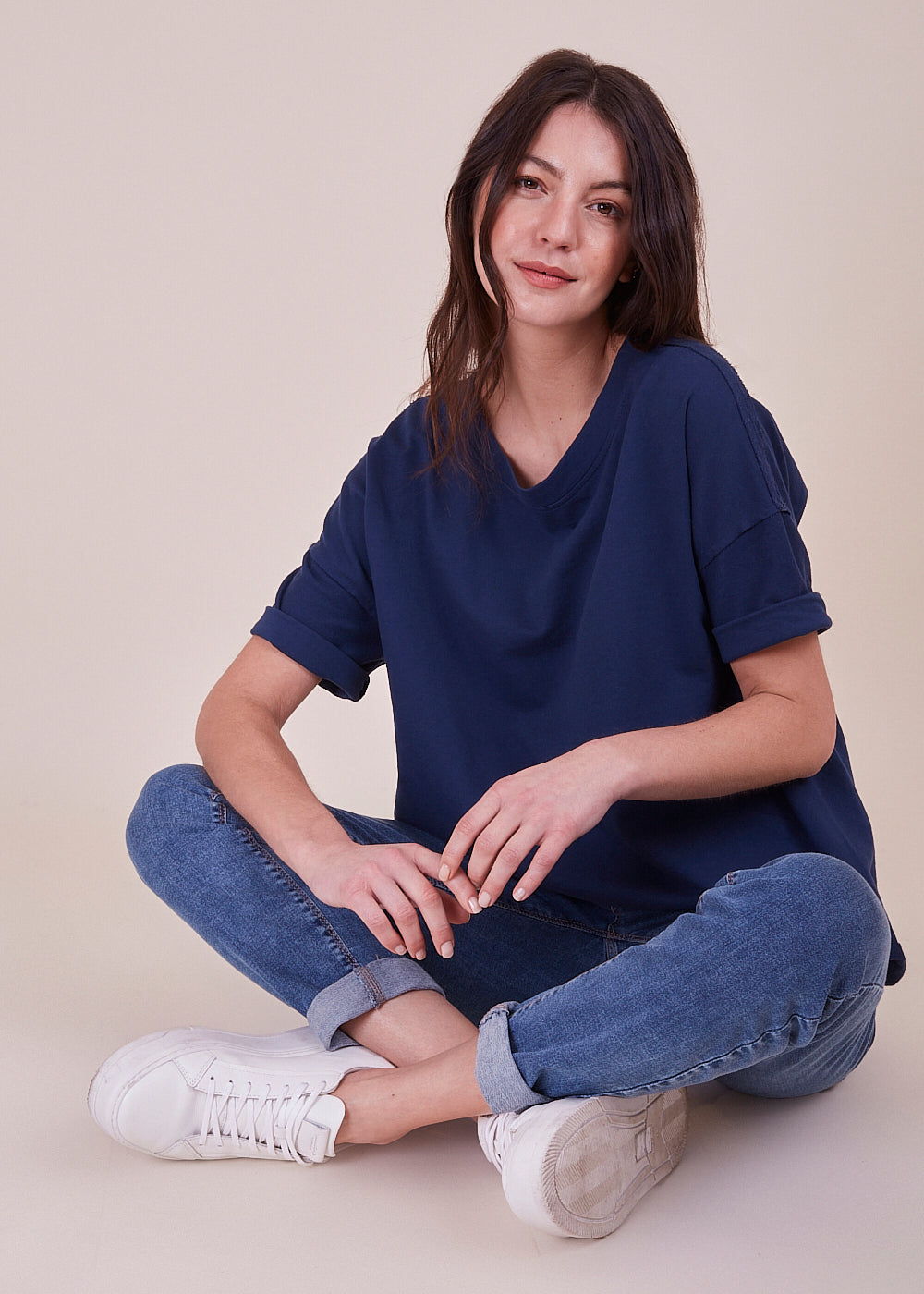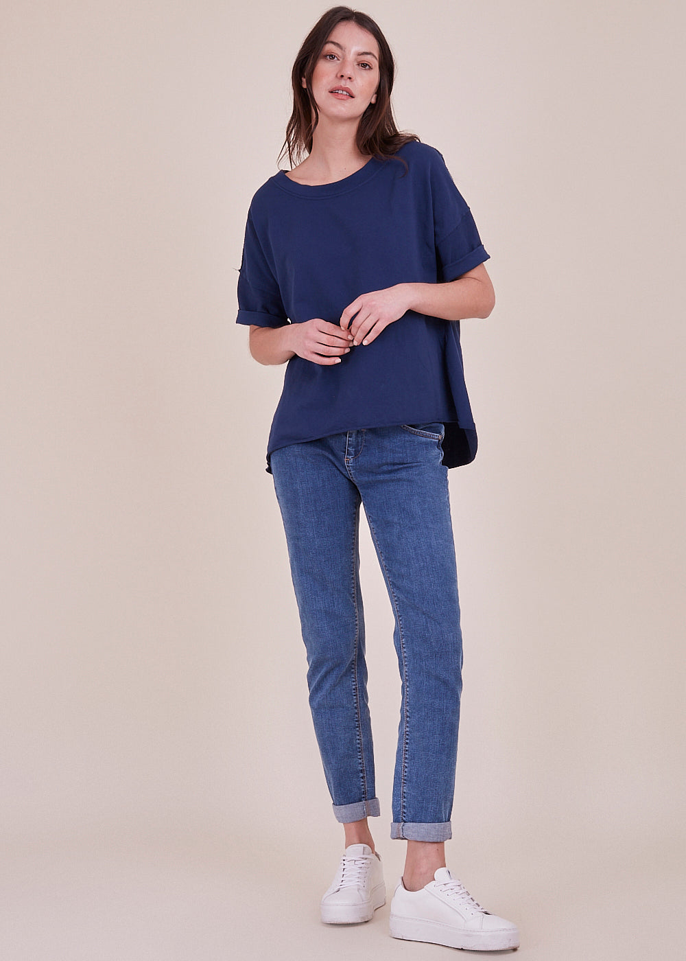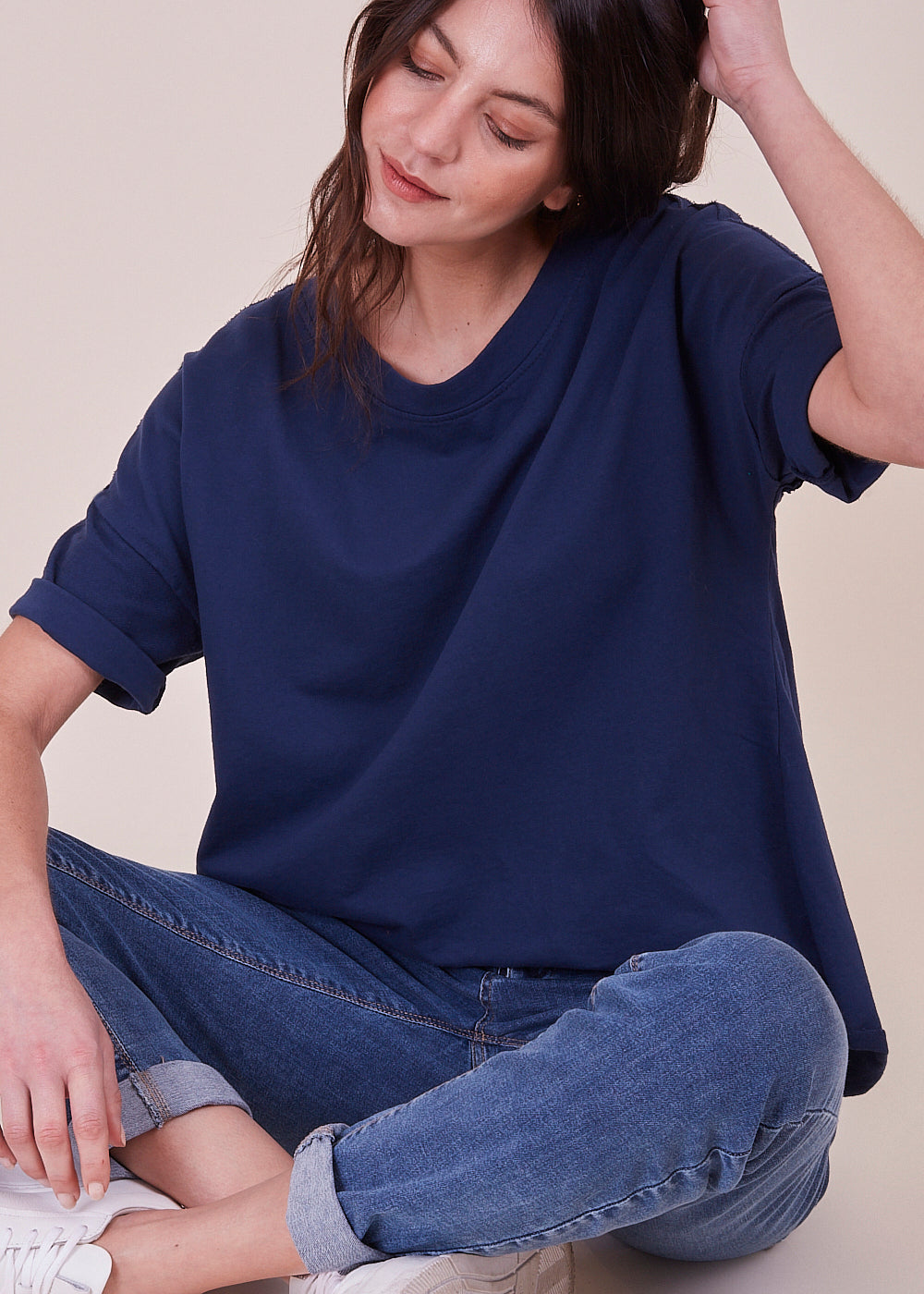 Lässig geschnittenes Sweatshirt mit kurzen Armen und Rundhalsausschnitt. Ein absolutes Must-Have für deinen Kleiderschrank. Es lässt sich ideal unter unseren Strickjacken kombinieren. Oder trage es als Basic zu einer Jeans und Sneakern.