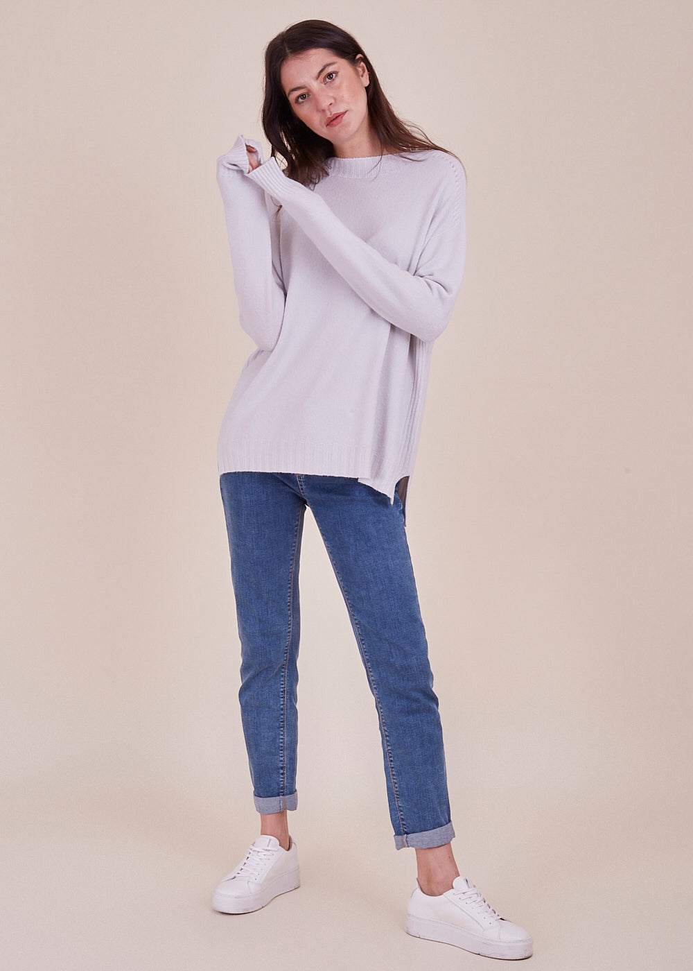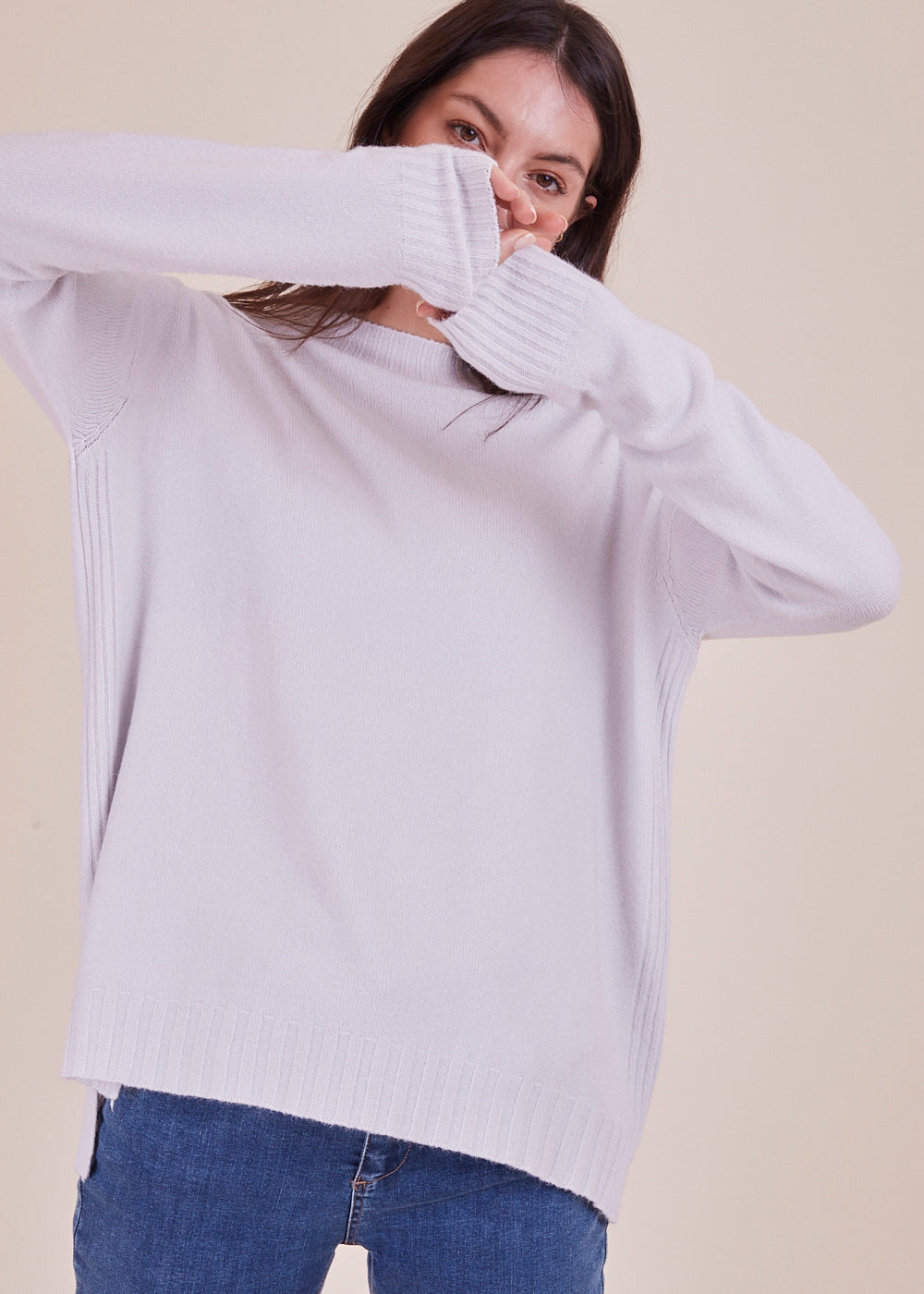 Kuscheliger Pullover mit Rundhalsschnitt und lässigen Schnitt. Der wundervolle, helle Ton verleiht jedem Frische. Mit breitem Rippenbündchen am Ausschnitt, Ärmel und Saum. Seitliche Schlitze. Mit einem leicht verlängerten Rückenstück.