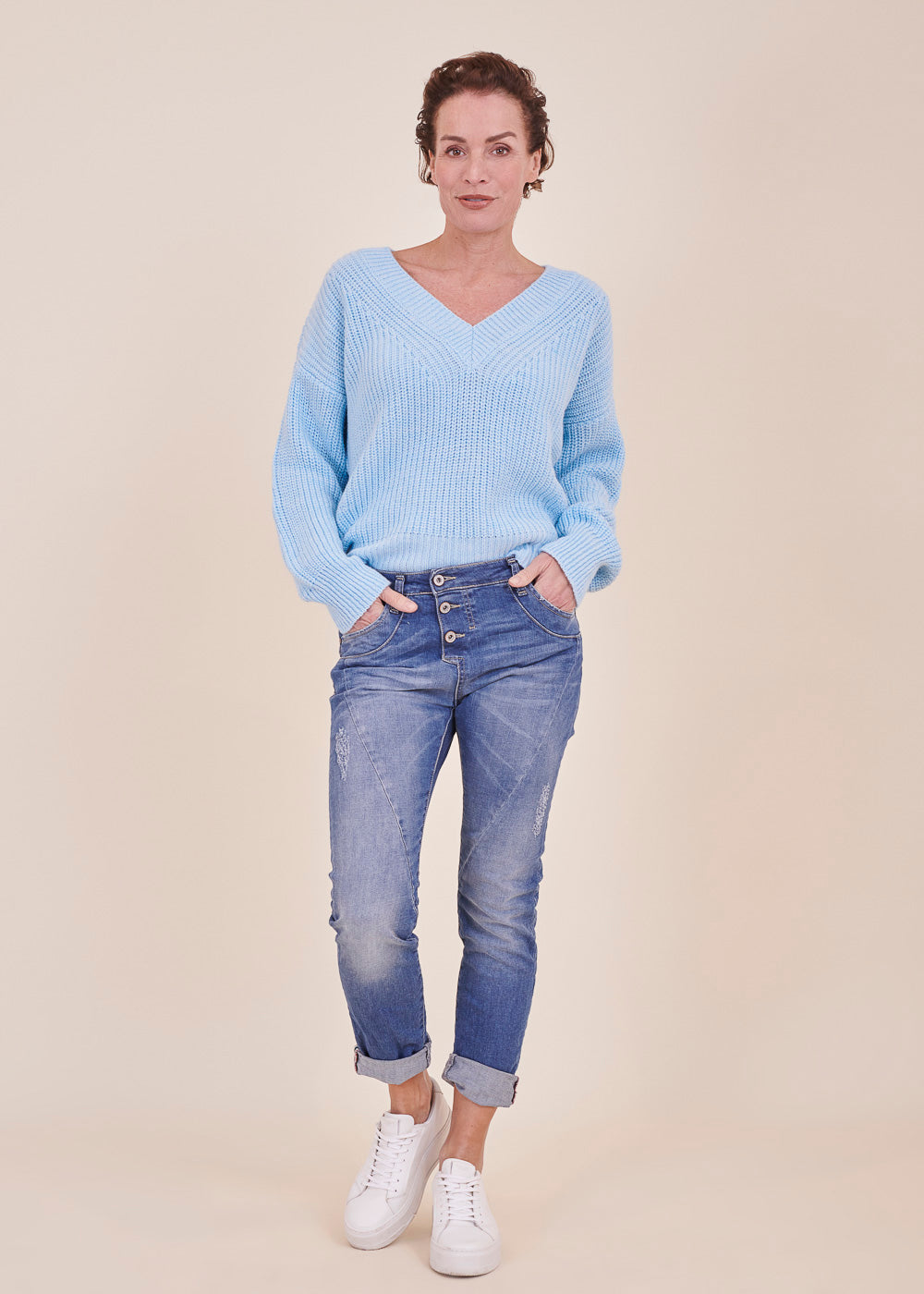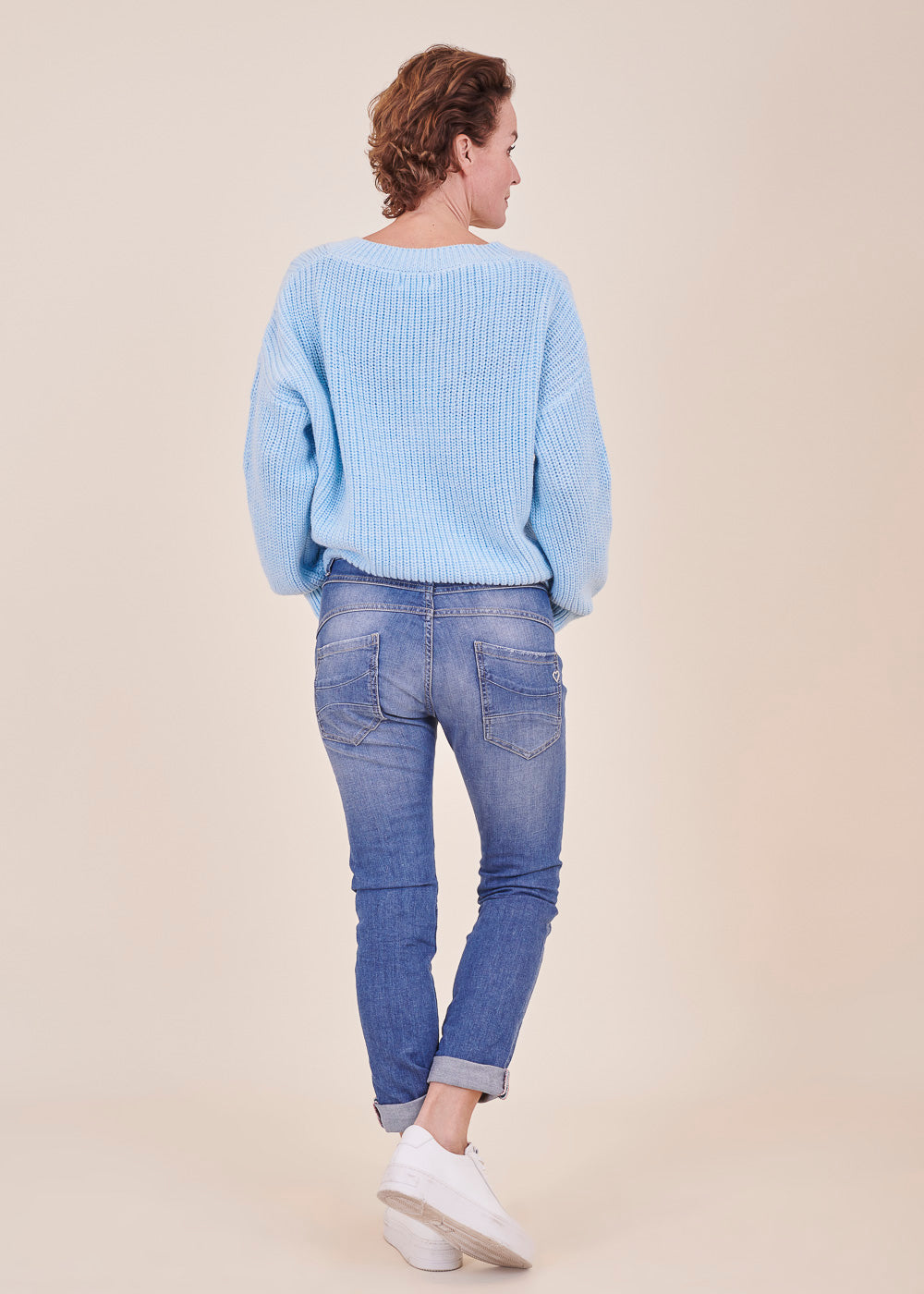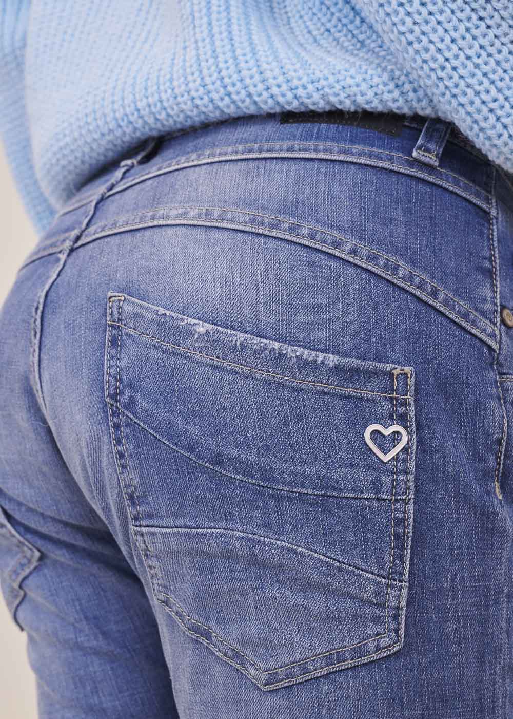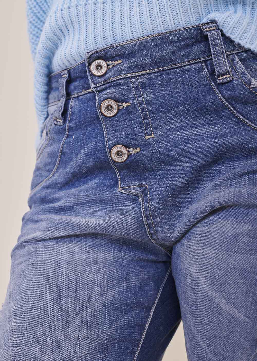 Boyfriend-Fit Jeans von Please. Sie sitzt locker auf den Hüften und hat die typische Ziernaht quer über die Vorderschenkel. Knopfleiste mit 3 Metallknöpfen vorn. Klassischer 5-Pocket Stil, mit dem kleinen Metallherz auf der Gesäßtasche.
