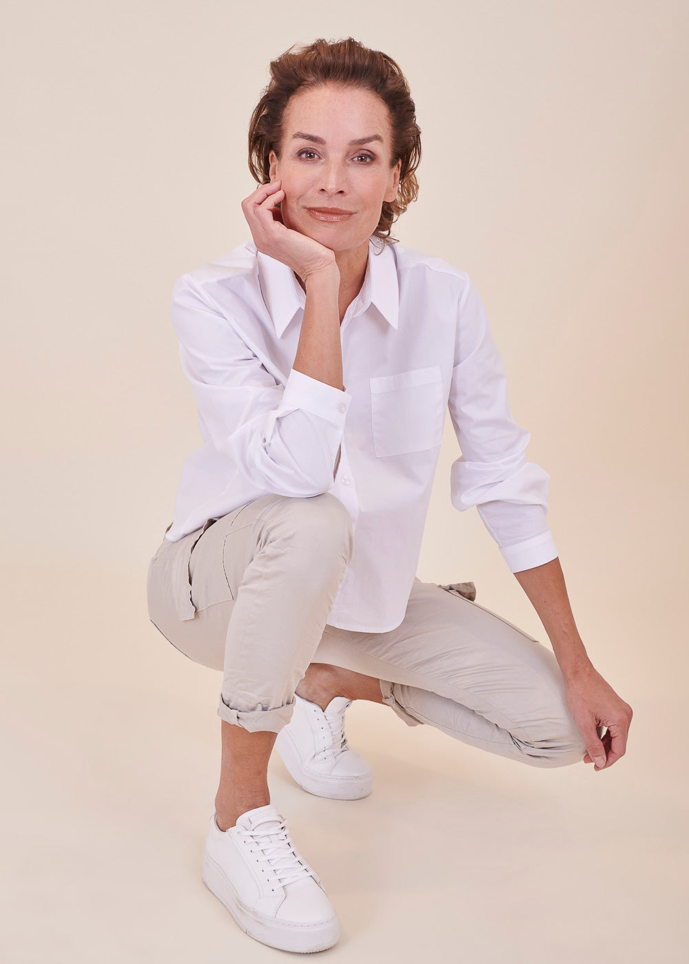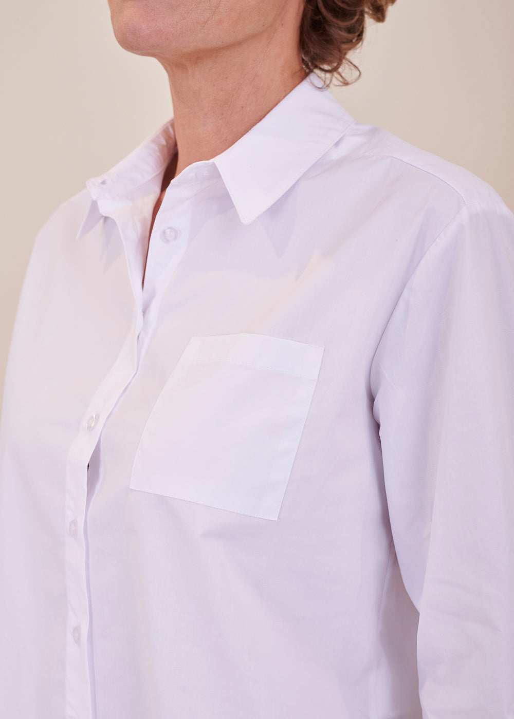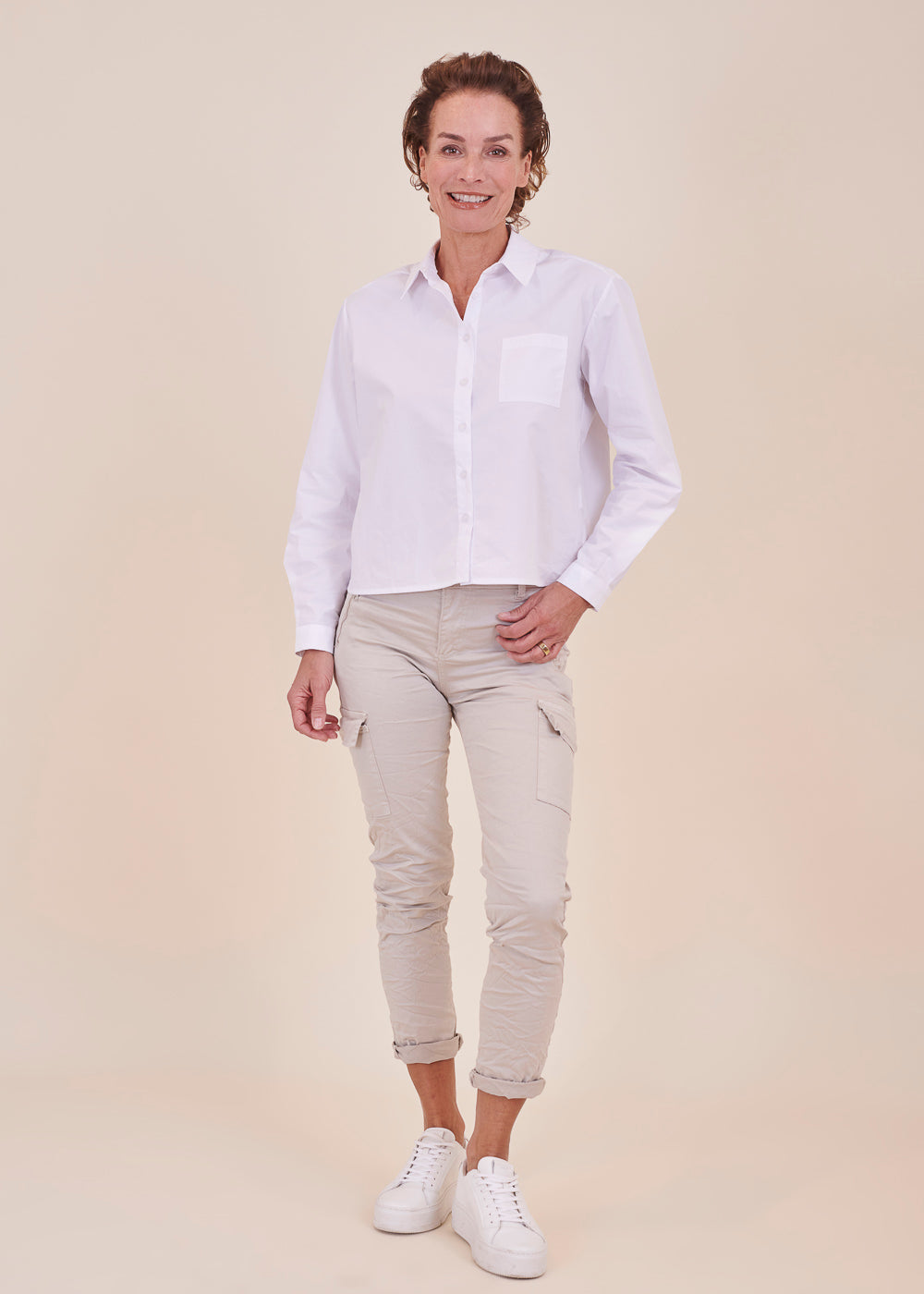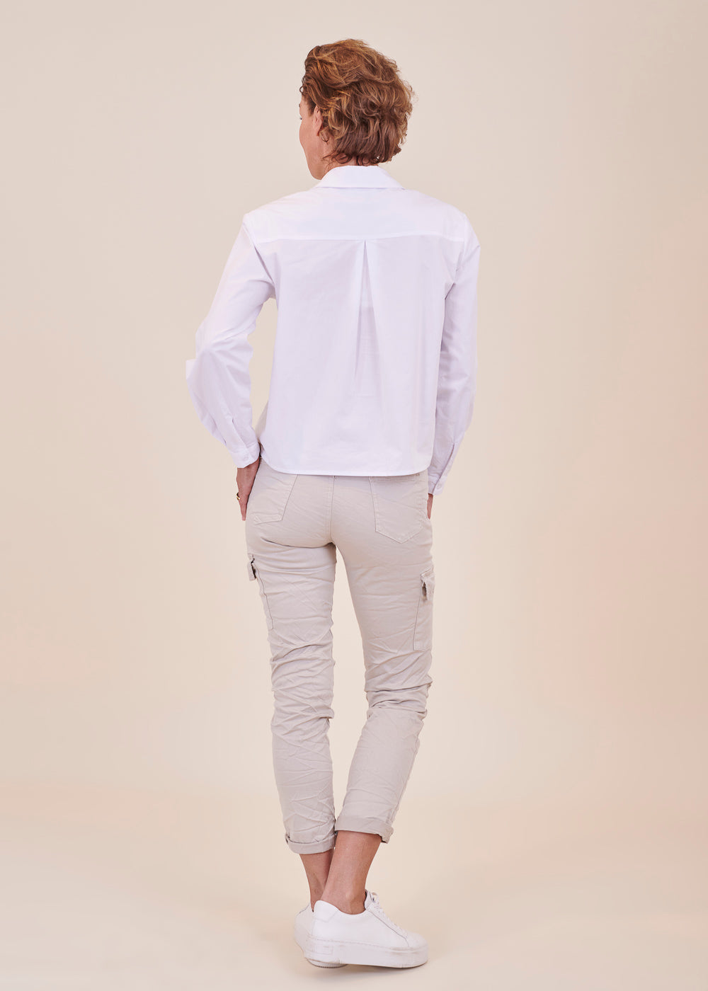 Kurze kastenförmig geschnittene Bluse aus einem Baumwollstoff mit Kragen, Knopfleiste, überschnittenen Schultern und langen Ärmeln mit geknöpften Manschetten. Doppellagige Rückenpasse mit Naht und Kellerfalte. Gerader Saum mit einem etwas verlängertem Rückenteil.