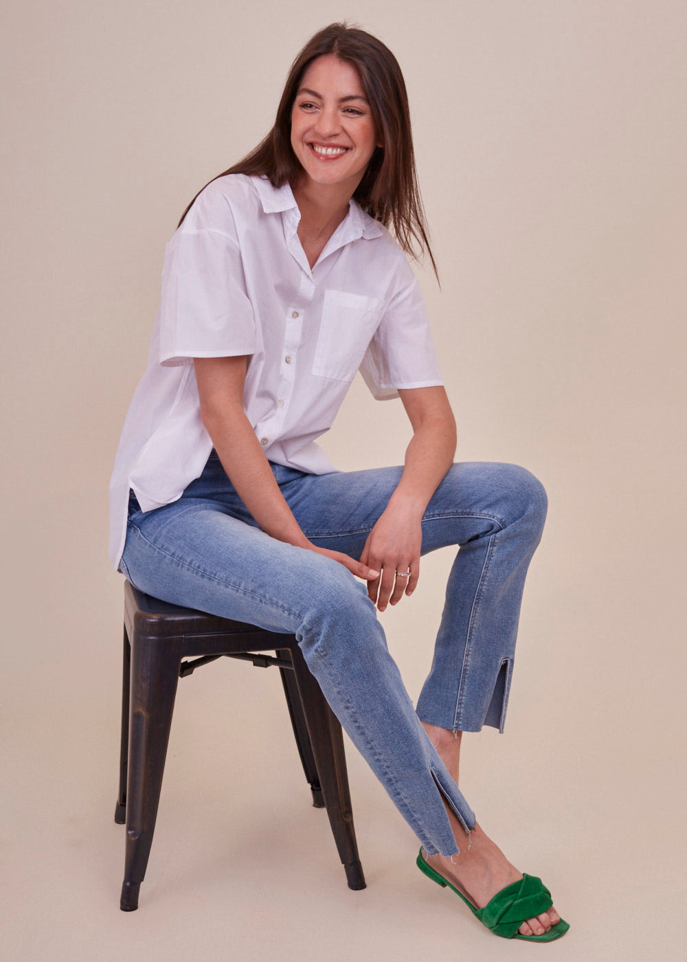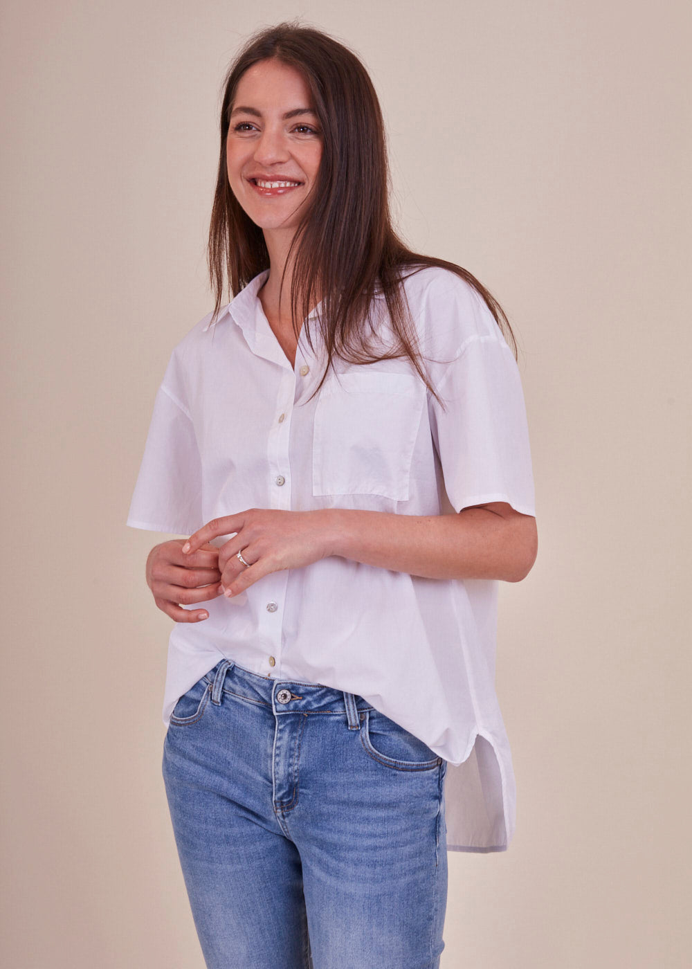 Lässig geschnittene halbarm Bluse mit verlängertem Rückenteil. Die durchgehend geknöpfte Hemdbluse mit Brusttasche und leicht überschnittenen Schultern ist der perfekte Begleiter für den bevorstehenden Sommer. Durch ihre schlichte Uni Farbe ist diese Bluse ein wunderbarer Kombinationsartikel, der nur darauf wartet, von dir gestylt zu werden.