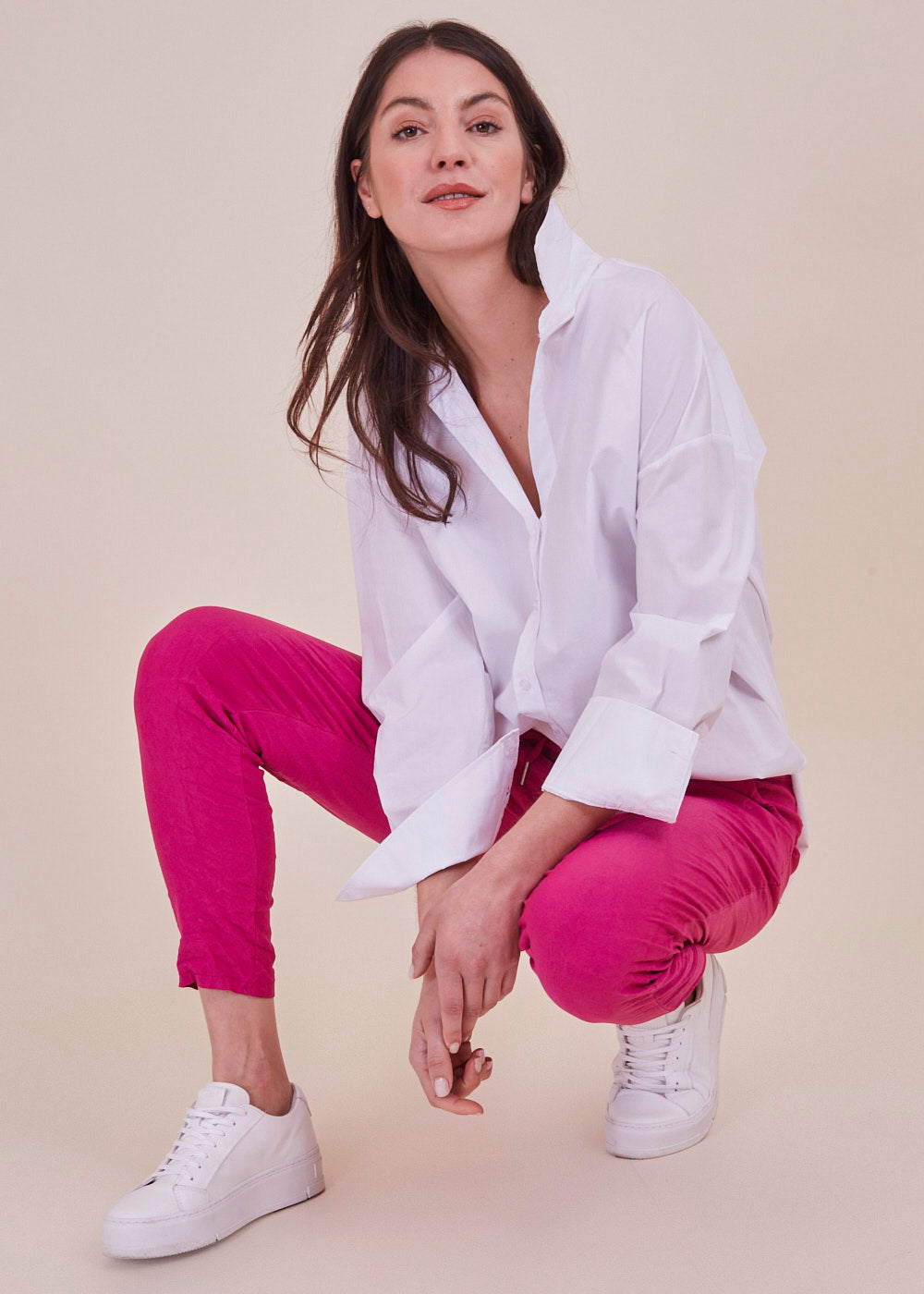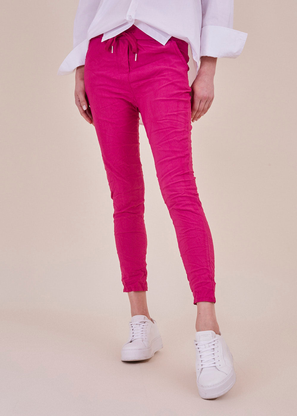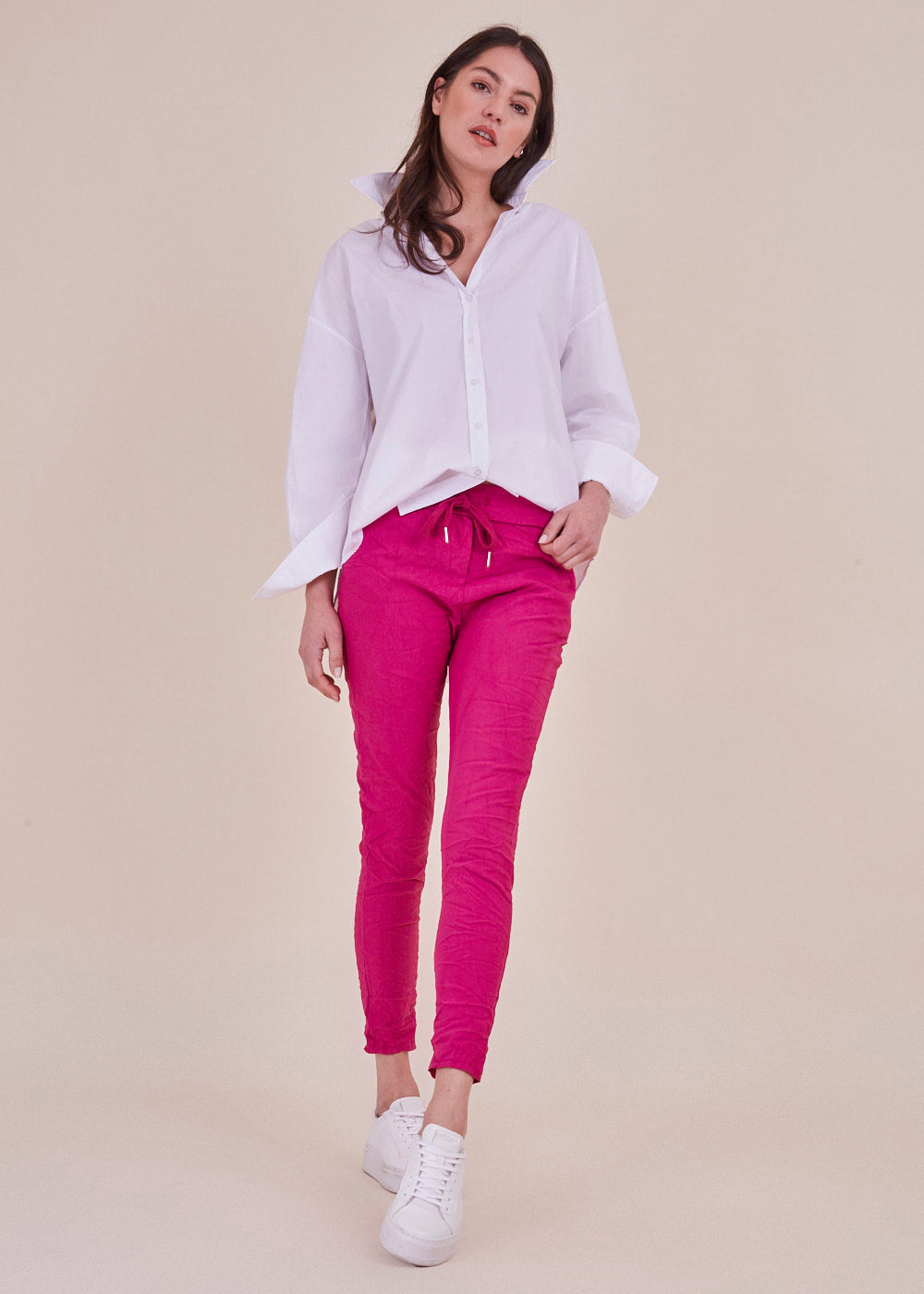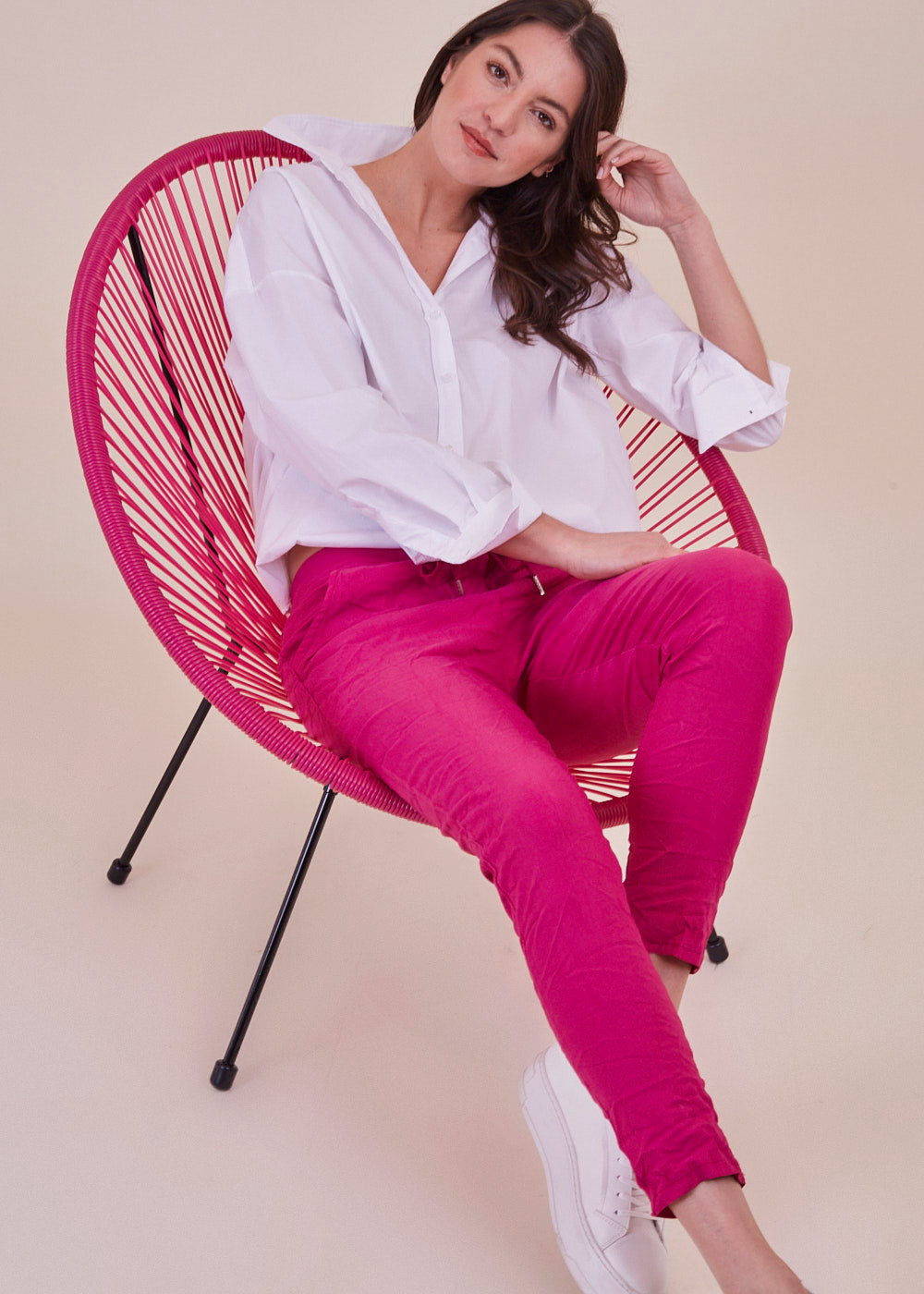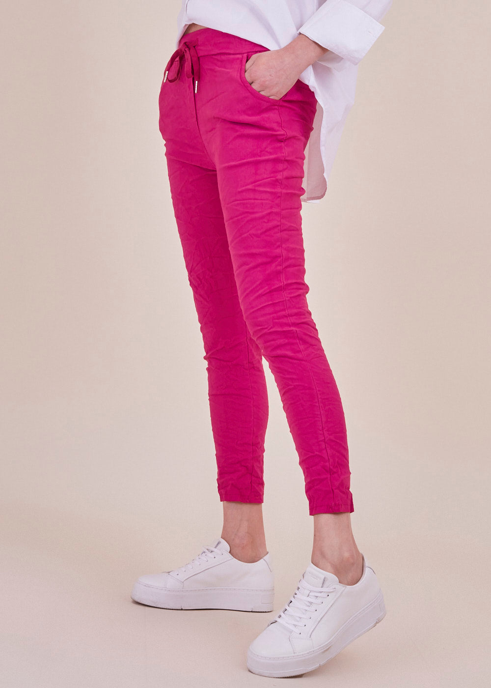 Unser Bestseller! Hose aus Viskose und Elasthan-Anteil. Dadurch sitzt sie super bequem und lässt sich prima zu Allem kombinieren. Gummizug im Bund, Tunnelzug mit Band und seitliche Eingriffstaschen.