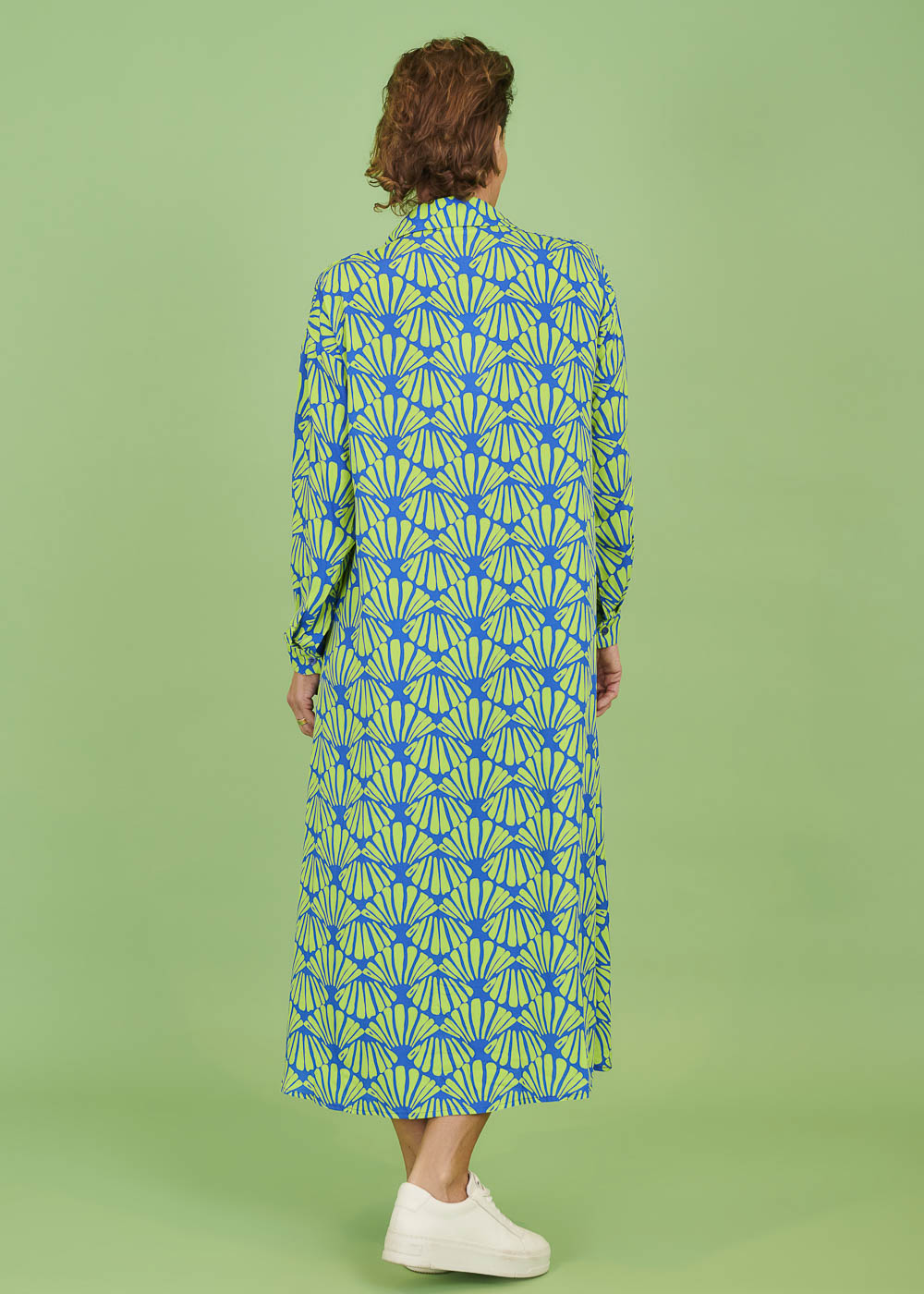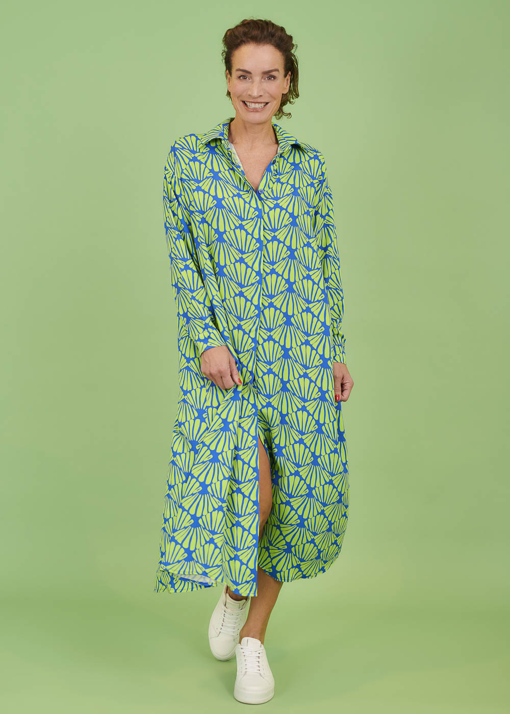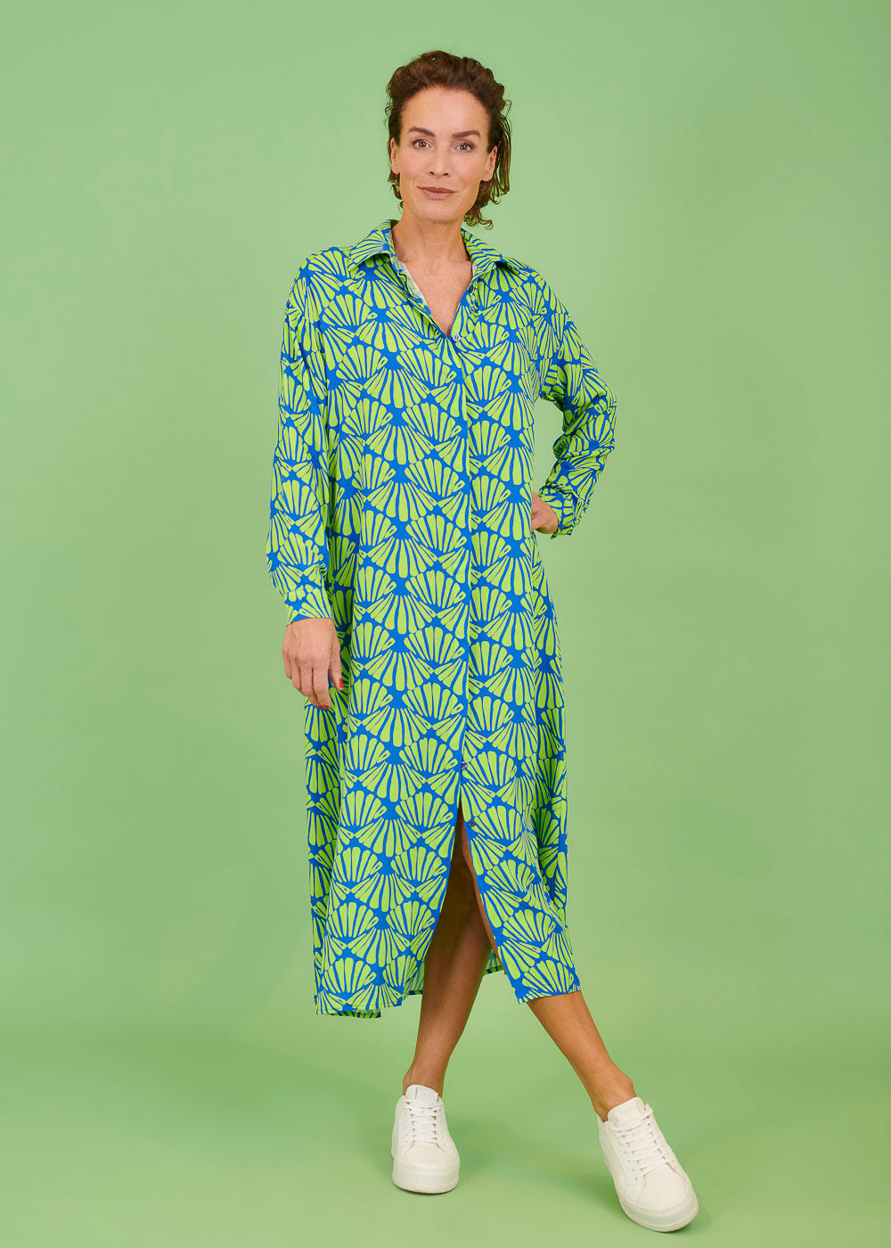 Maxi-Kleid mit durchgezogener Knopfleiste im All-Over-Print. Das Kleid hat einen Hemdblusenkragen und lange Ärmel, die je nach Bedarf hochgeshoppt werden können.