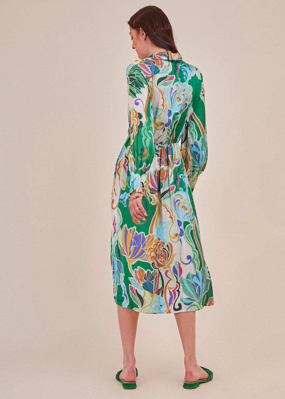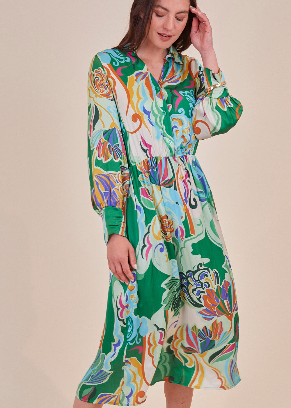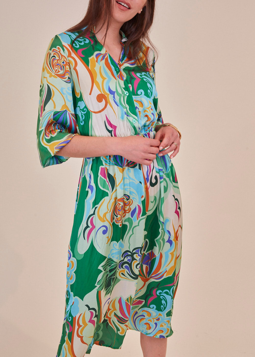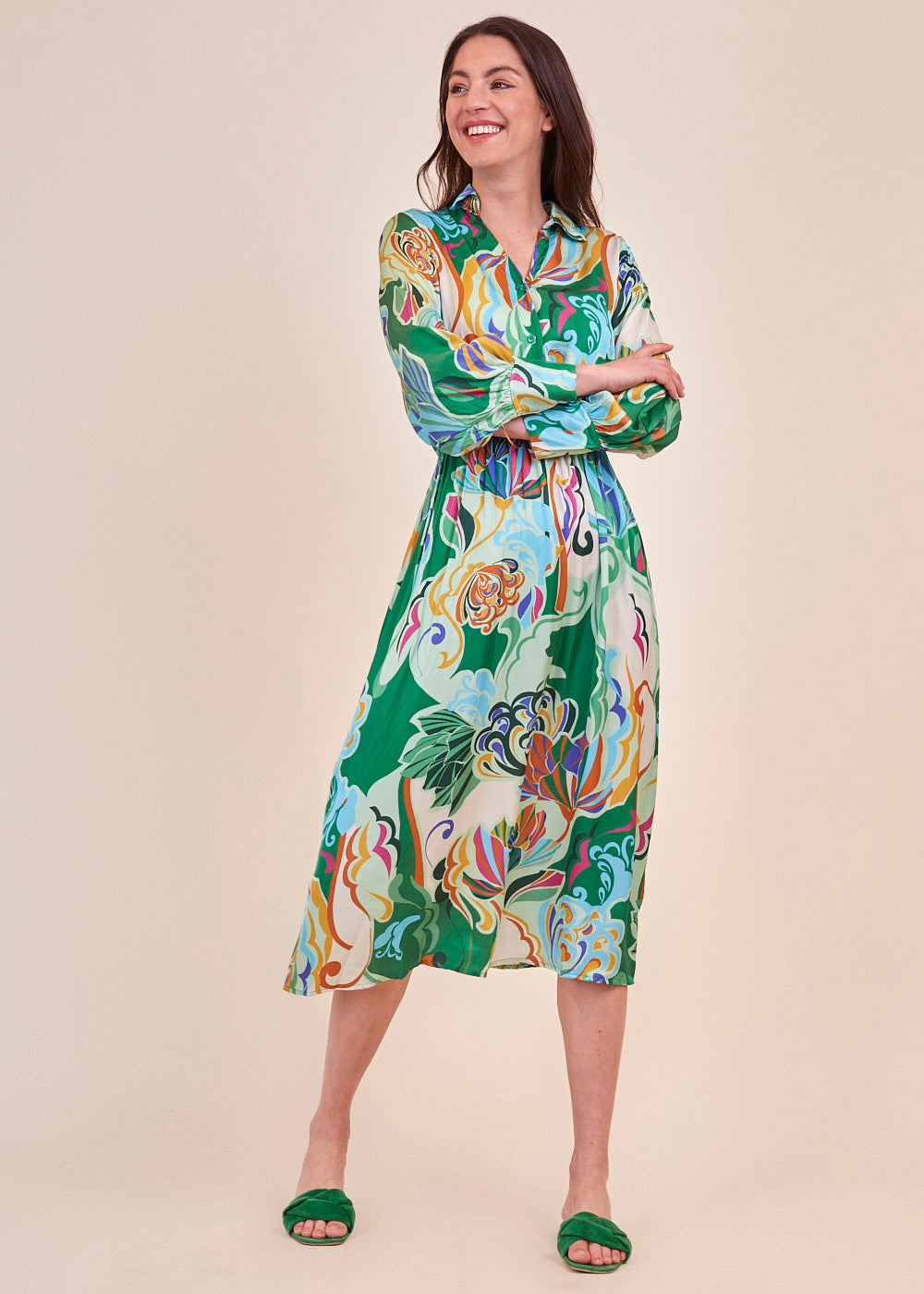 Dieses sommerliche Kleid erstrahlt in frischen neuen Trendfarben und einem All-Over-Print im Floral-Muster. Das Kleid besitzt einen Hemdkragen, sowie Manschetten an den den Armen. Der fließende Schnitt sorgt für ein luftig-leichtes Tragegefühl.