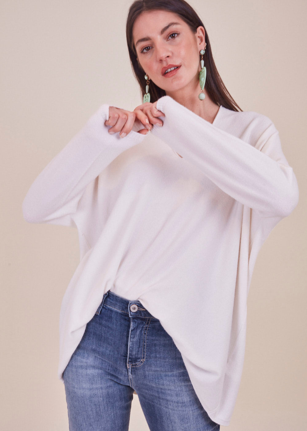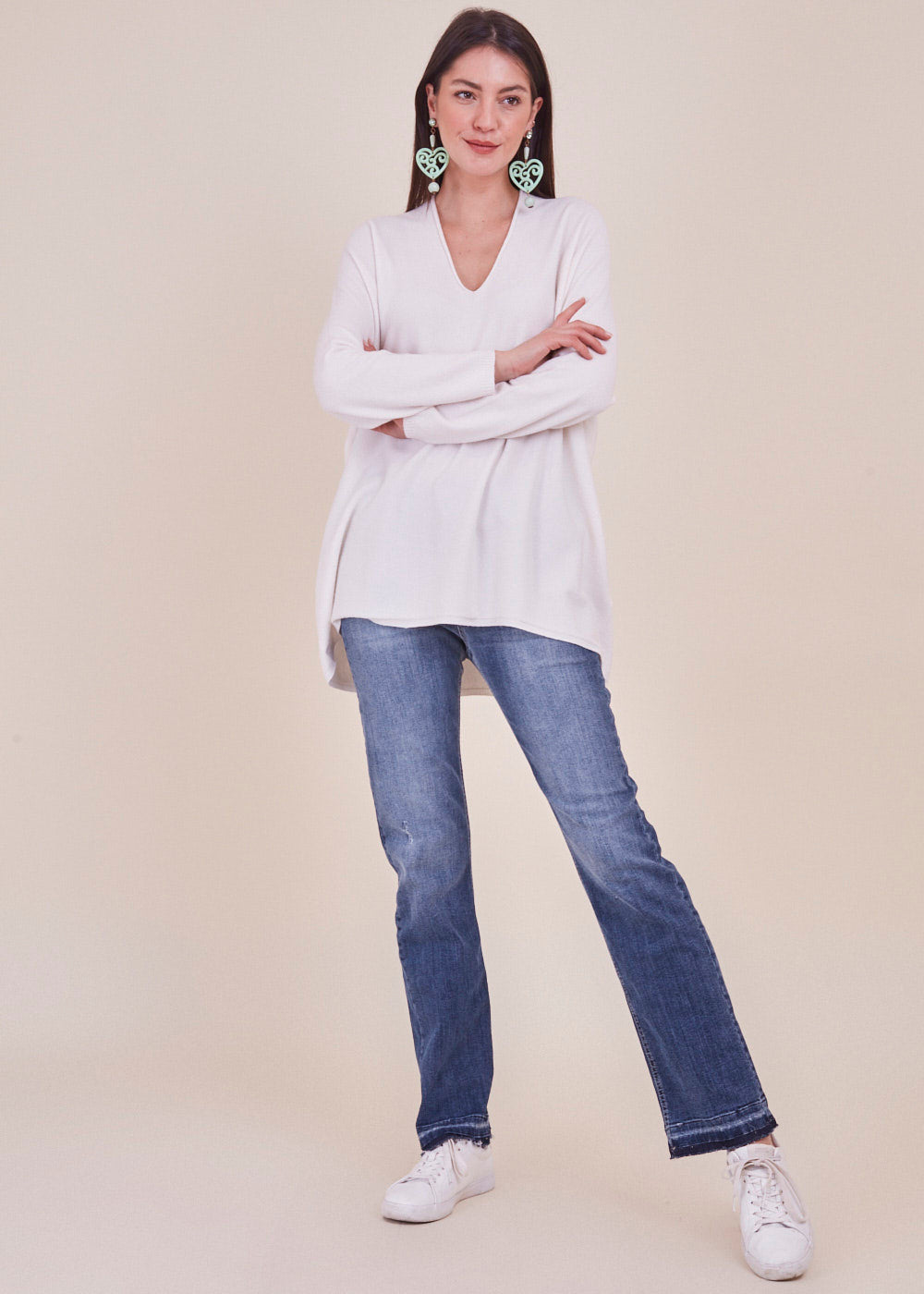 Leichter und gemütlicher Oversizepullover mit V-Ausschnitt. Mit überschnittenen Ärmeln aus unserem Kuschelgarn. Rippenbündchen an den Ärmeln und Schlitzen an den Seiten. Einfach zum Wohlfühlen. Kombiniere diesen Artikel gerne mit einer unserer Please Skinny Jeans.