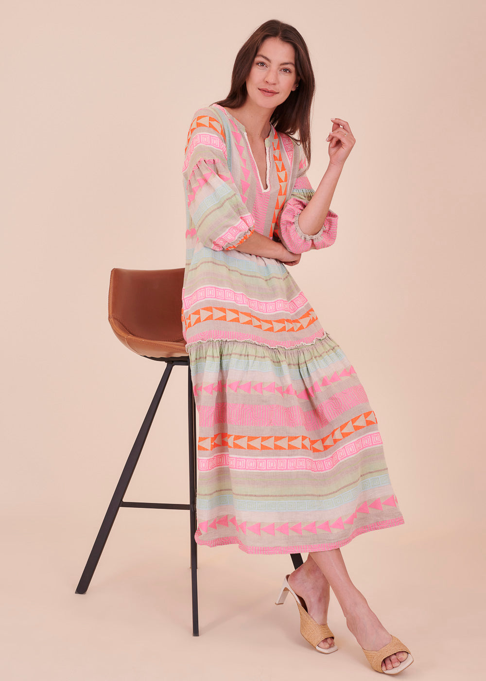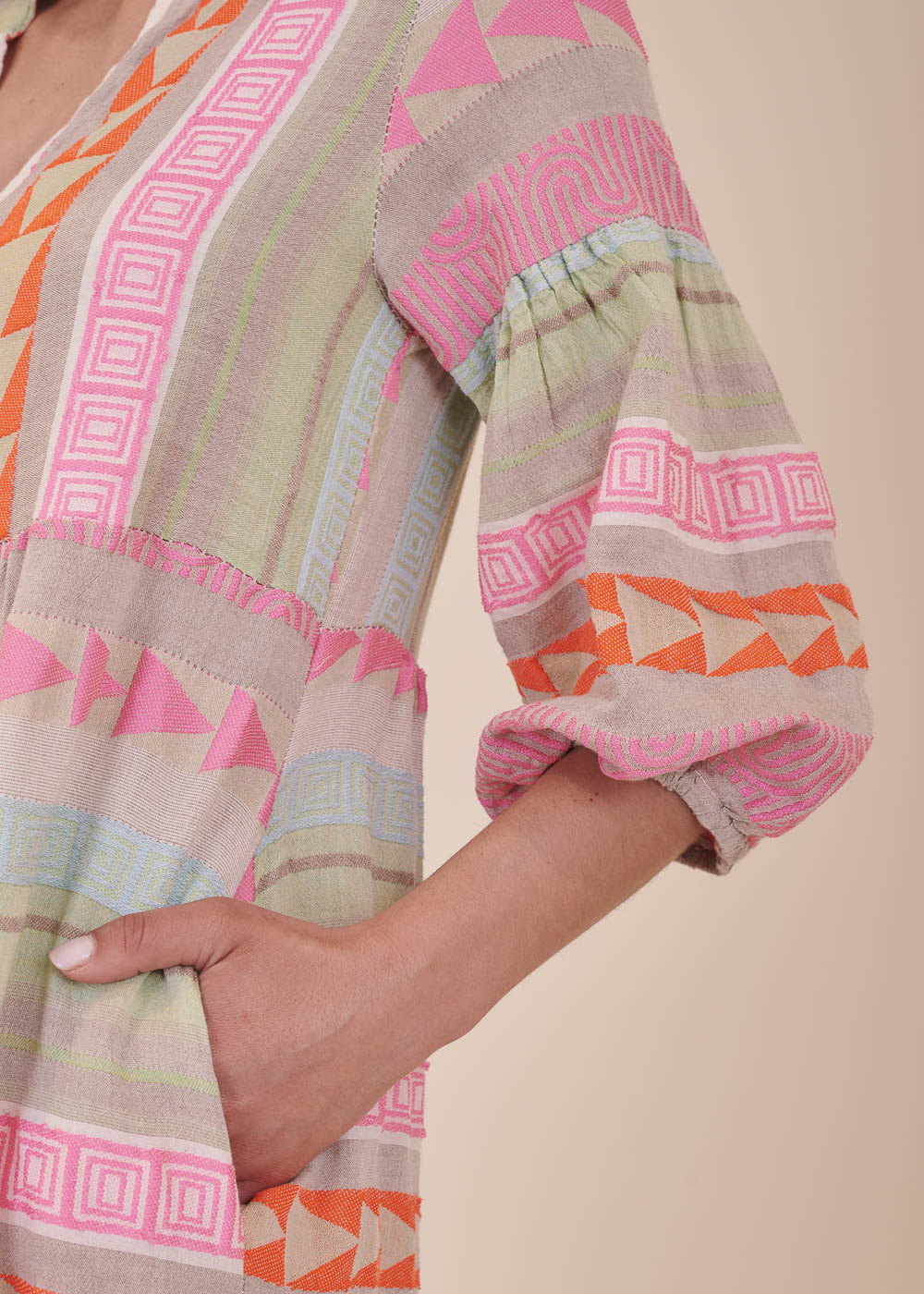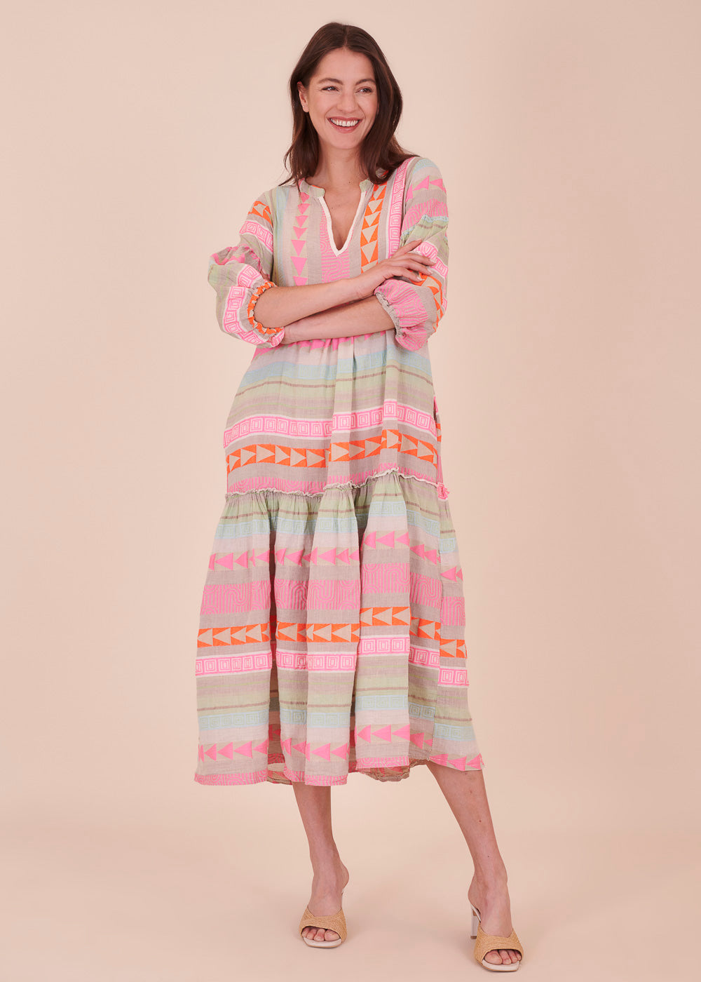 Das Must-Have der Saison. Unser Jaquardkleid! Der wunderschöne und farbenfrohe Print des Kleides lässt sich hervorragend mit einem kleinen Absatzschuh kombinieren. Durch seinen besonders lässigen Schnitt sitzt dieses Kleid besonders gemütlich und engt dich in deinem Alltag nicht ein. Auf der nächsten Gartenparty deiner Freundin, wirst du mit dieser besonderen Kleid, zum absoluten Blickfang.
