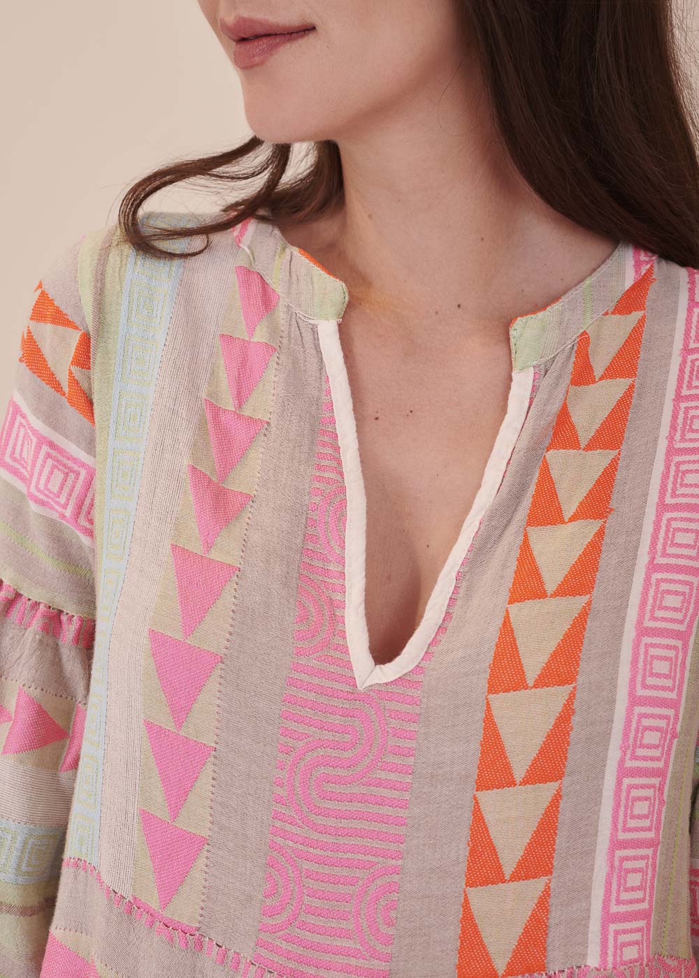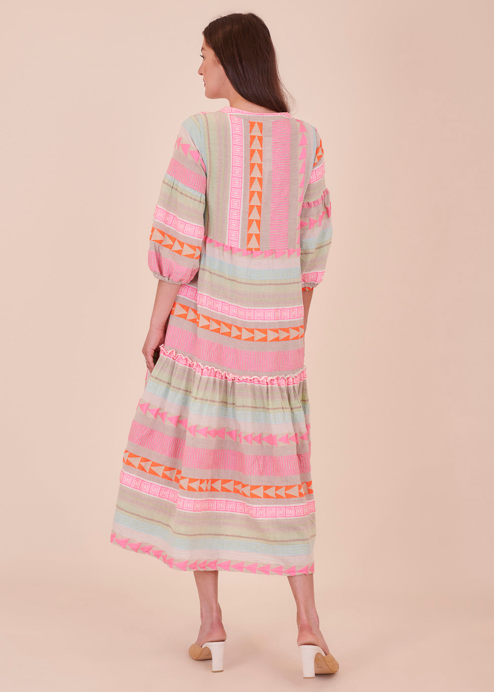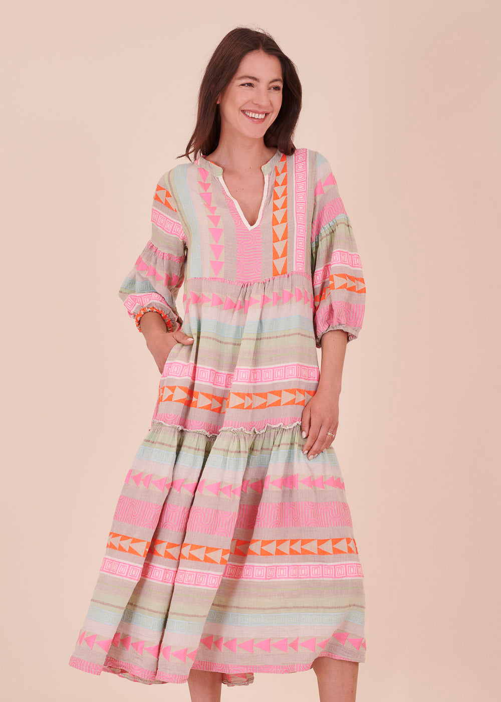 Das Must-Have der Saison. Unser Jaquardkleid! Der wunderschöne und farbenfrohe Print des Kleides lässt sich hervorragend mit einem kleinen Absatzschuh kombinieren. Durch seinen besonders lässigen Schnitt sitzt dieses Kleid besonders gemütlich und engt dich in deinem Alltag nicht ein. Auf der nächsten Gartenparty deiner Freundin, wirst du mit dieser besonderen Kleid, zum absoluten Blickfang.