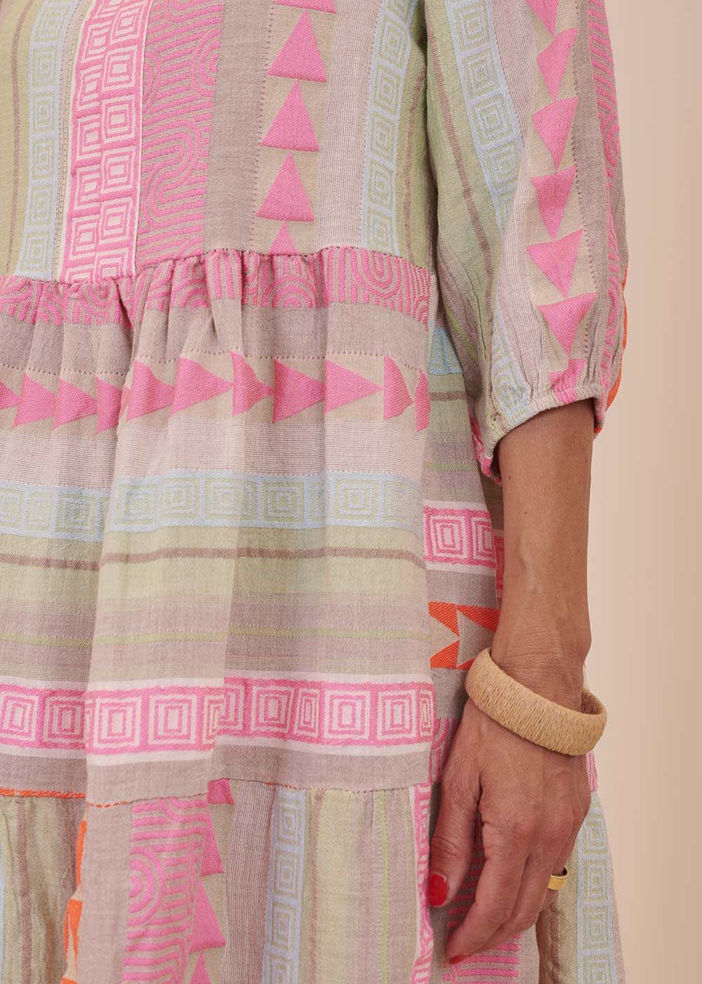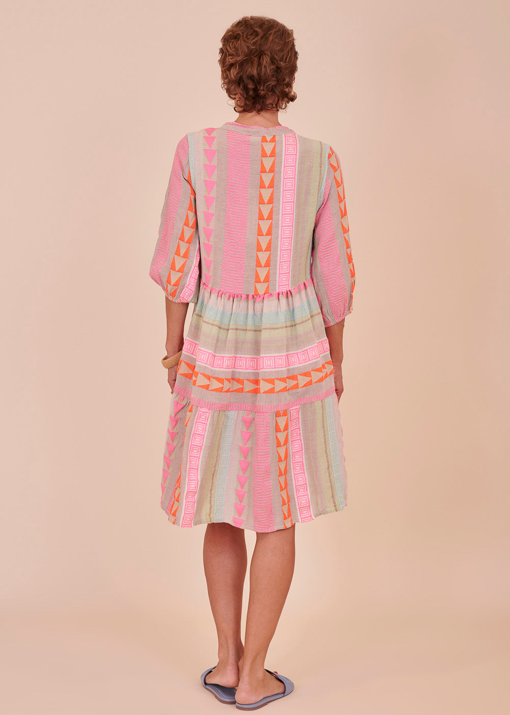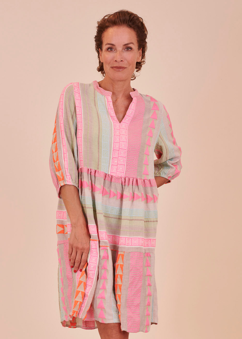 Das Must-Have der Saison. Unser Jaquardkleid in der kurzen Version! Der wunderschöne und farbenfrohe Print des Kleides lässt sich hervorragend mit einem kleinen Absatzschuh kombinieren. Durch seinen besonders lässigen Schnitt sitzt dieses Kleid besonders gemütlich und engt dich in deinem Alltag nicht ein. Auf der nächsten Gartenparty deiner Freundin, wirst du mit dieser besonderen Kleid, zum absoluten Blickfang.