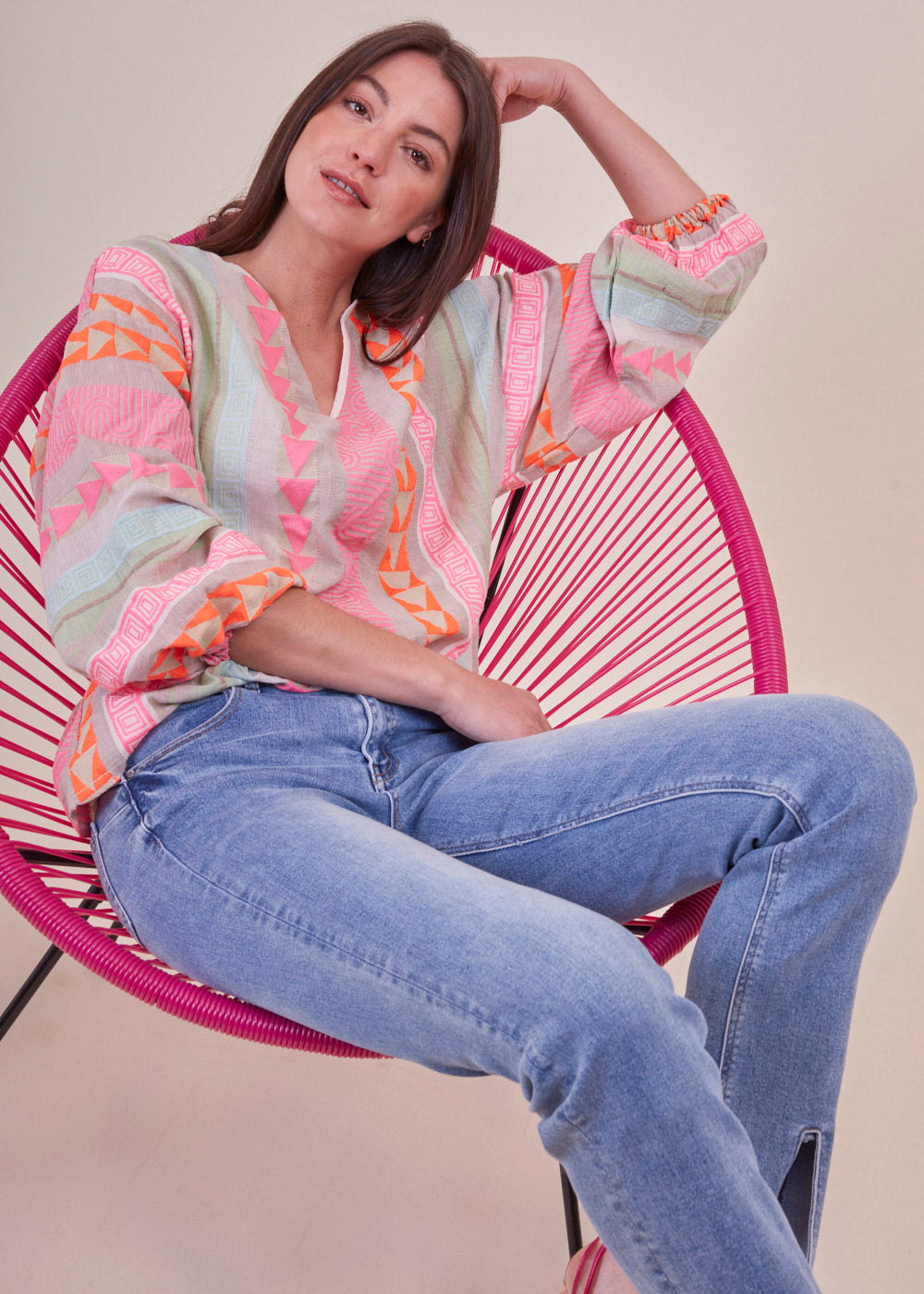 Lust auf den Sommer? Mit dieser besonderen Tunika, holst du dir schon jetzt, die ersten Sonnenstrahlen in deinen Kleiderschrank. Der wunderschöne und farbenfrohe Print der Bluse lässt sich hervorragend mit Jeans oder einer weißen Jeans kombinieren. Durch seinen besonders lässigen Schnitt sitzt diese Tunika besonders gemütlich und engt dich in deinem Alltag nicht ein. Aber auch auf der nächsten Gartenparty deiner Freundin, wirst du mit dieser besonderen Tunika, zum absoluten Blickfang.