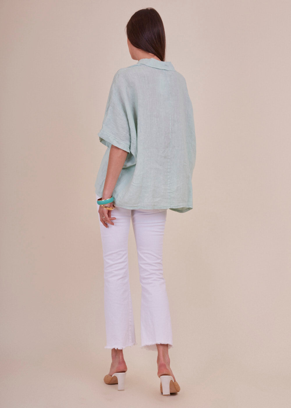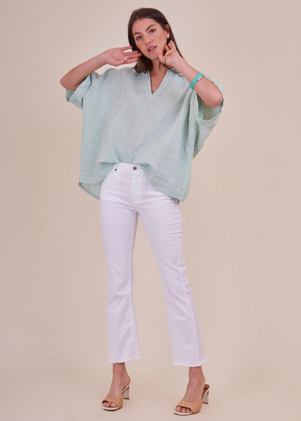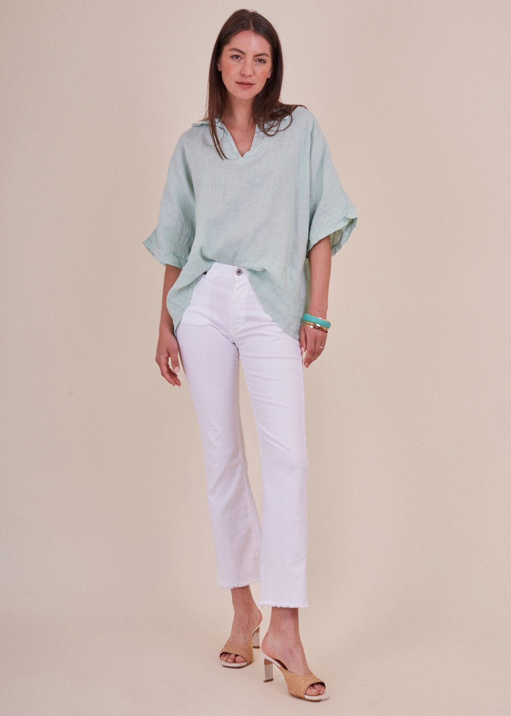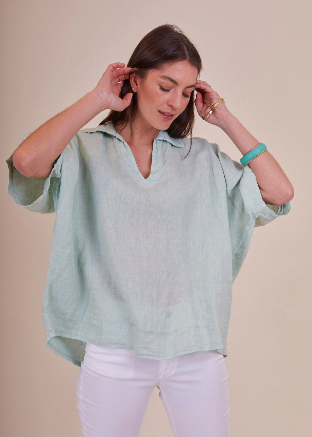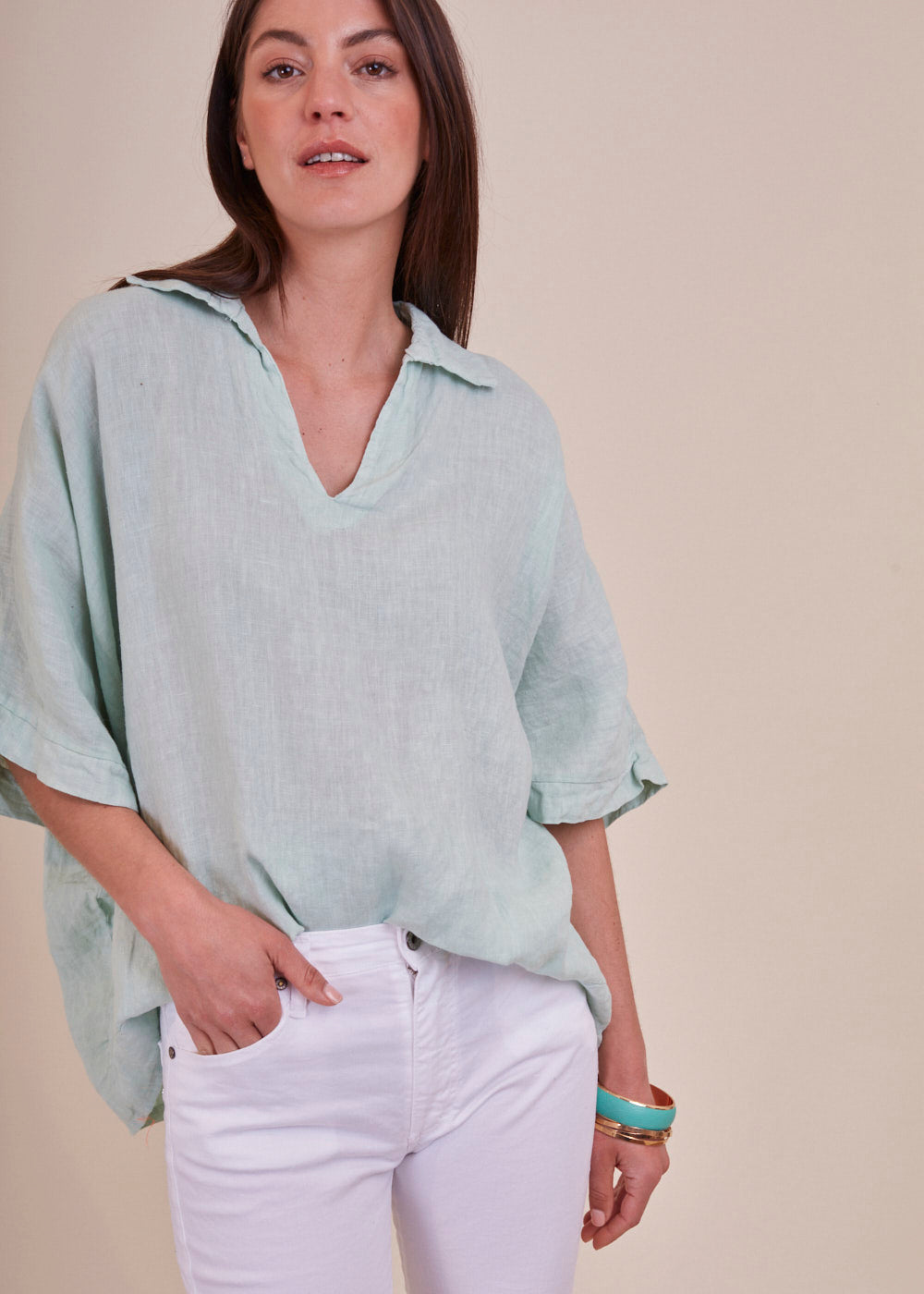 Locker leichte Leinenbluse mit kurzem Arm und besonderen Ausschnitt. Die sommerliche Tunika aus 100% kühlendem Leinen ist der ideale Begleiter für deinen nächsten Urlaub oder einen gemütlichen Stadtbummel mit der besten Freundin.