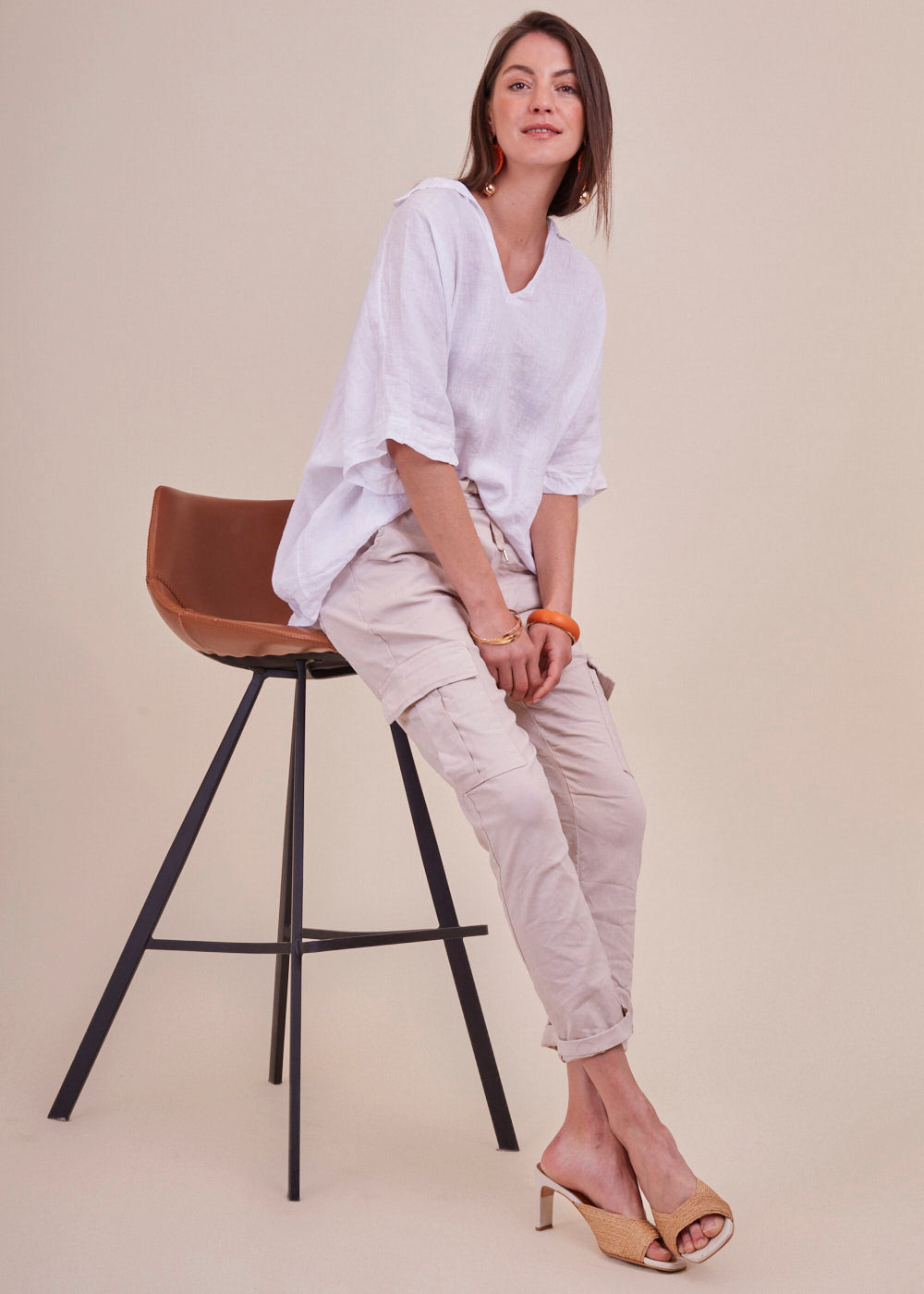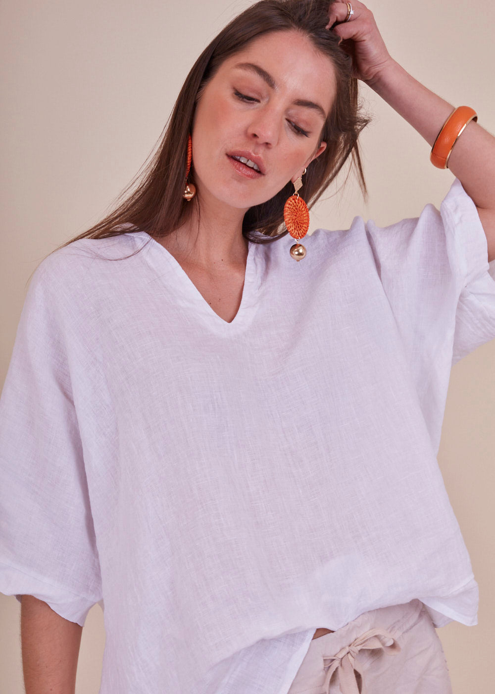 Locker leichte Leinenbluse mit kurzem Arm und besonderen Ausschnitt. Die sommerliche Tunika aus 100% kühlendem Leinen ist der ideale Begleiter für deinen nächsten Urlaub oder einen gemütlichen Stadtbummel mit der besten Freundin.
