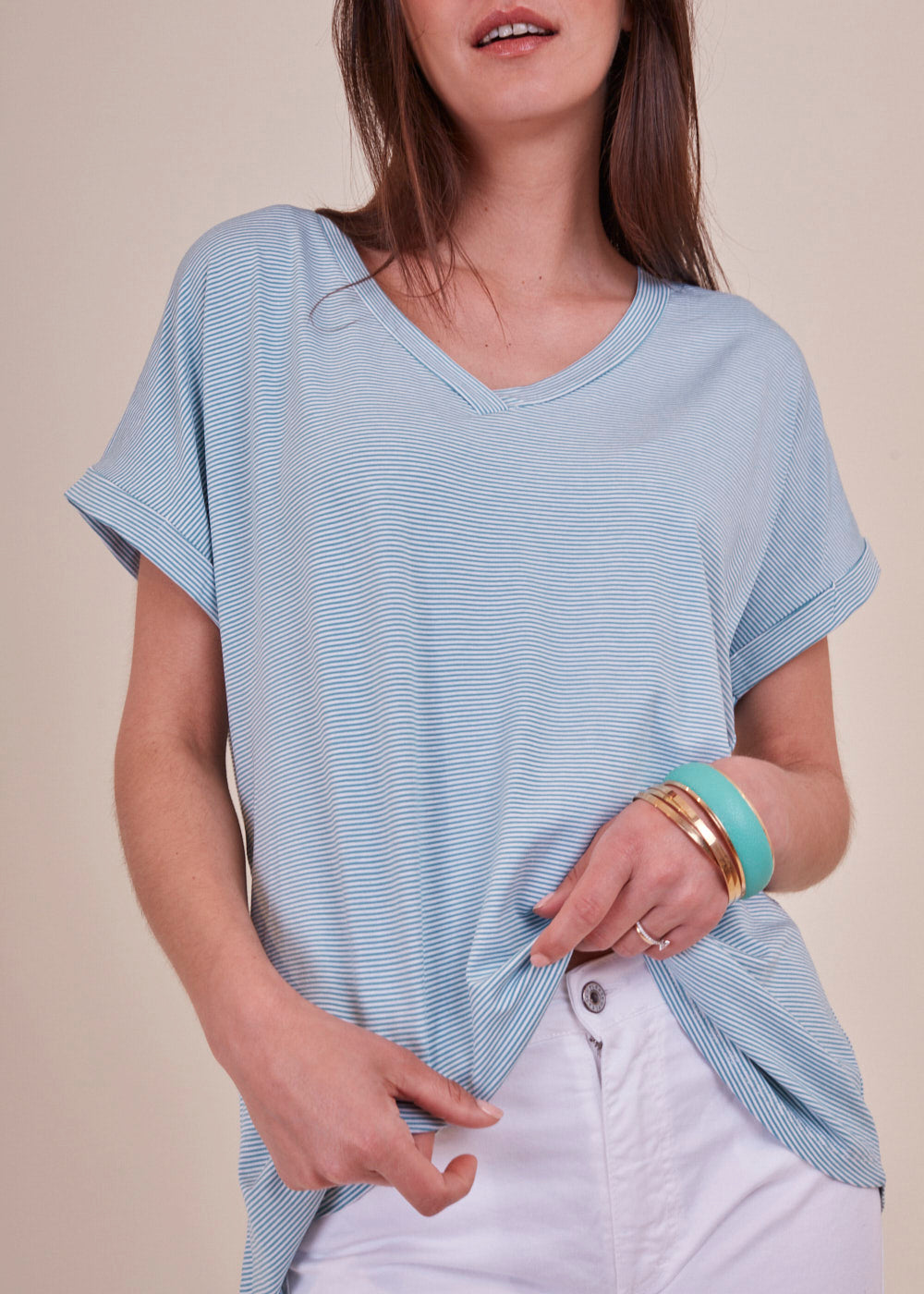 Ein maritimer und wunderbar zeitloser Klassiker ist das Streifenshirt! Schön gerade geschnitten setzt das T-Shirt auf Komfort und liegt dank seines Materials besonders angenehm auf der Haut. Ein schöner V-Ausschnitt und umgeschlagene kurze Arme, runden dieses besondere Shirt, perfekt ab!