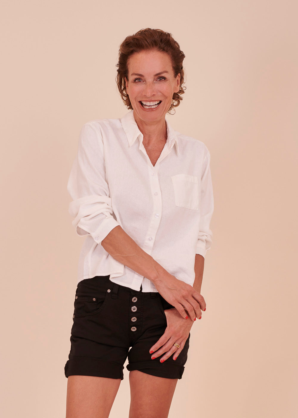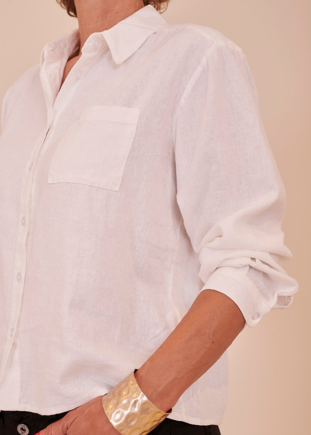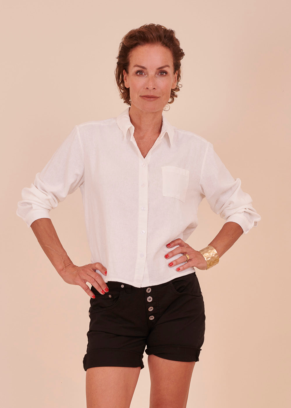 Leinen Bluse in bequemer Passform mit Hemdkragen und Brusttasche. Der kurze kastenförmige Schnitt eignet sich perfekt für jede Hose.