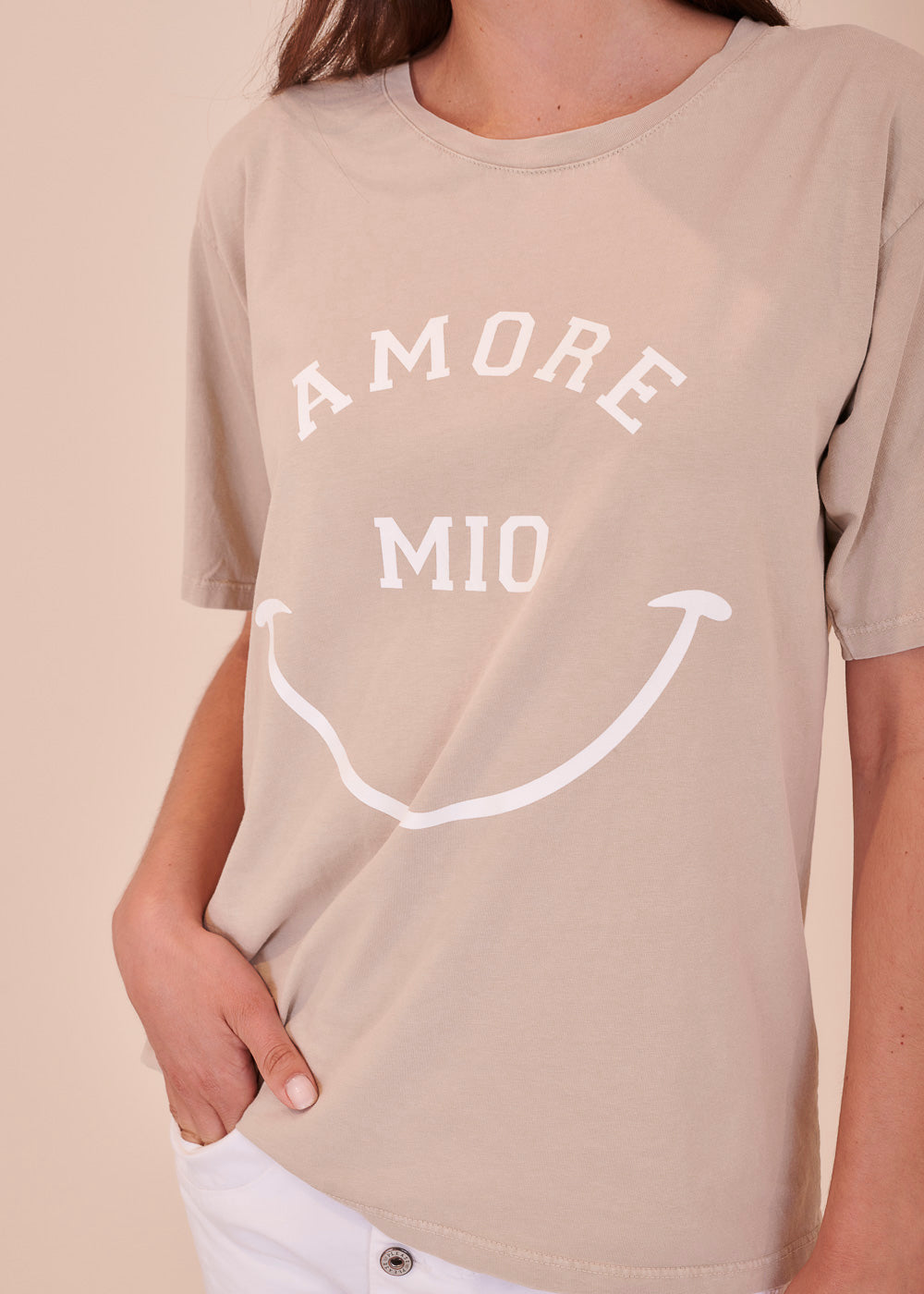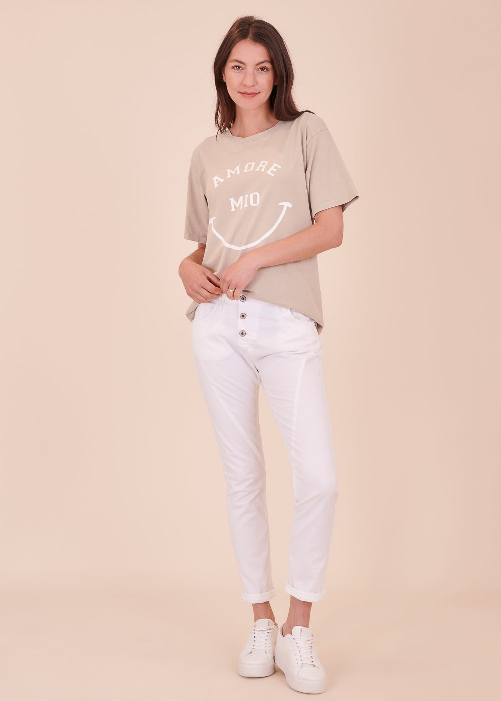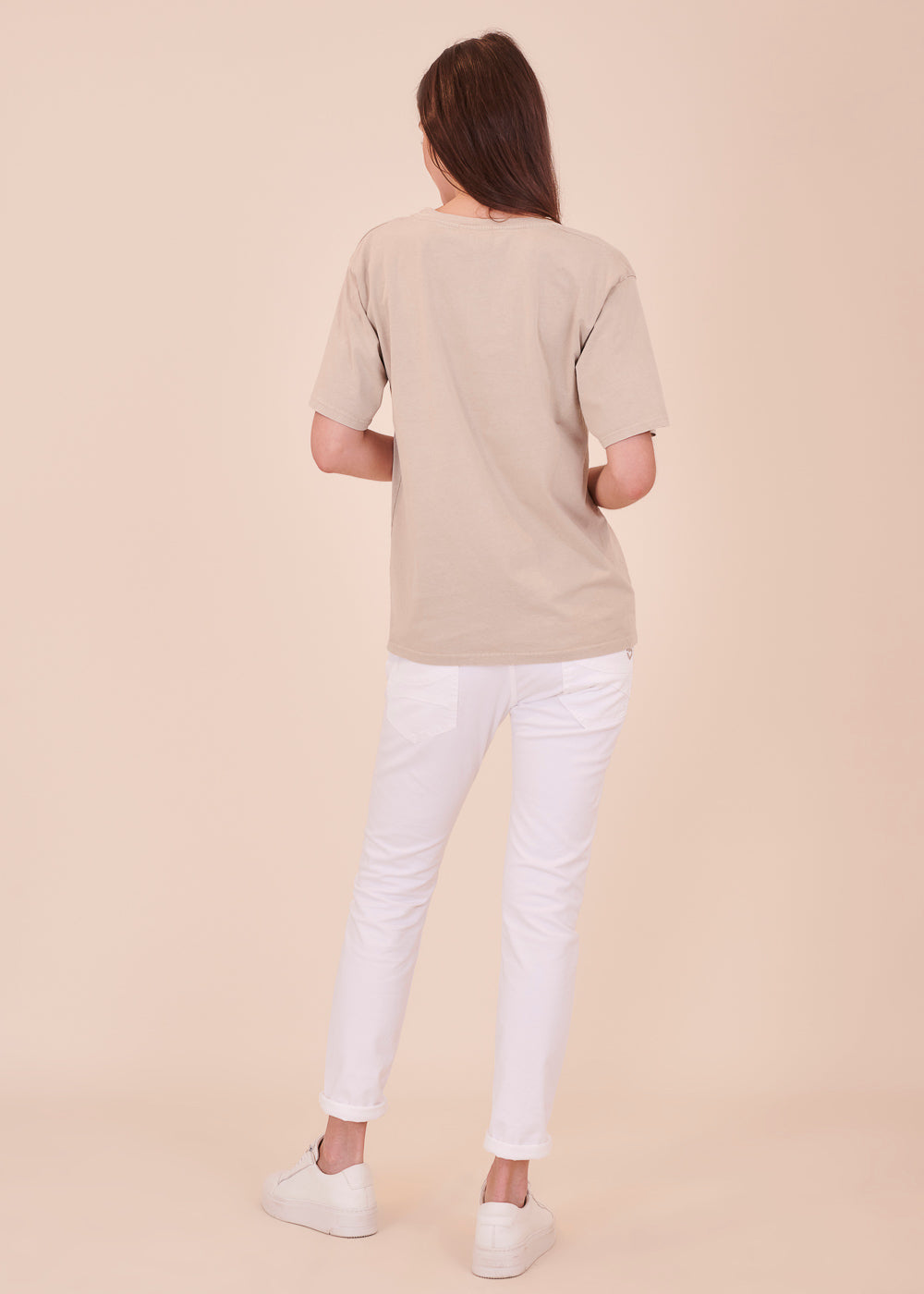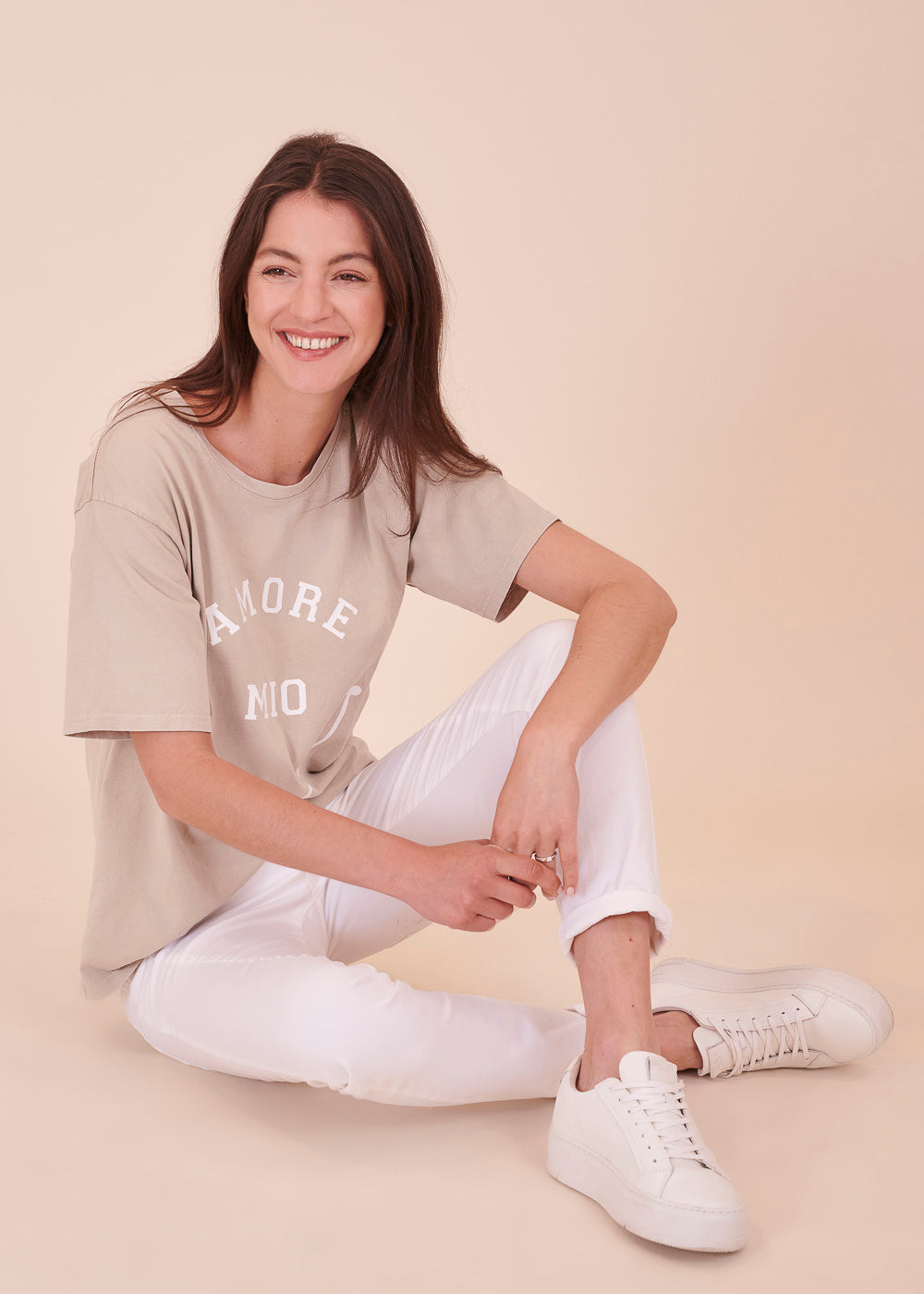 T-Shirt aus weicher Baumwolle mit Frontdruck, Rundausschnitt mit Rippenblende und überschnittenen Schultern.