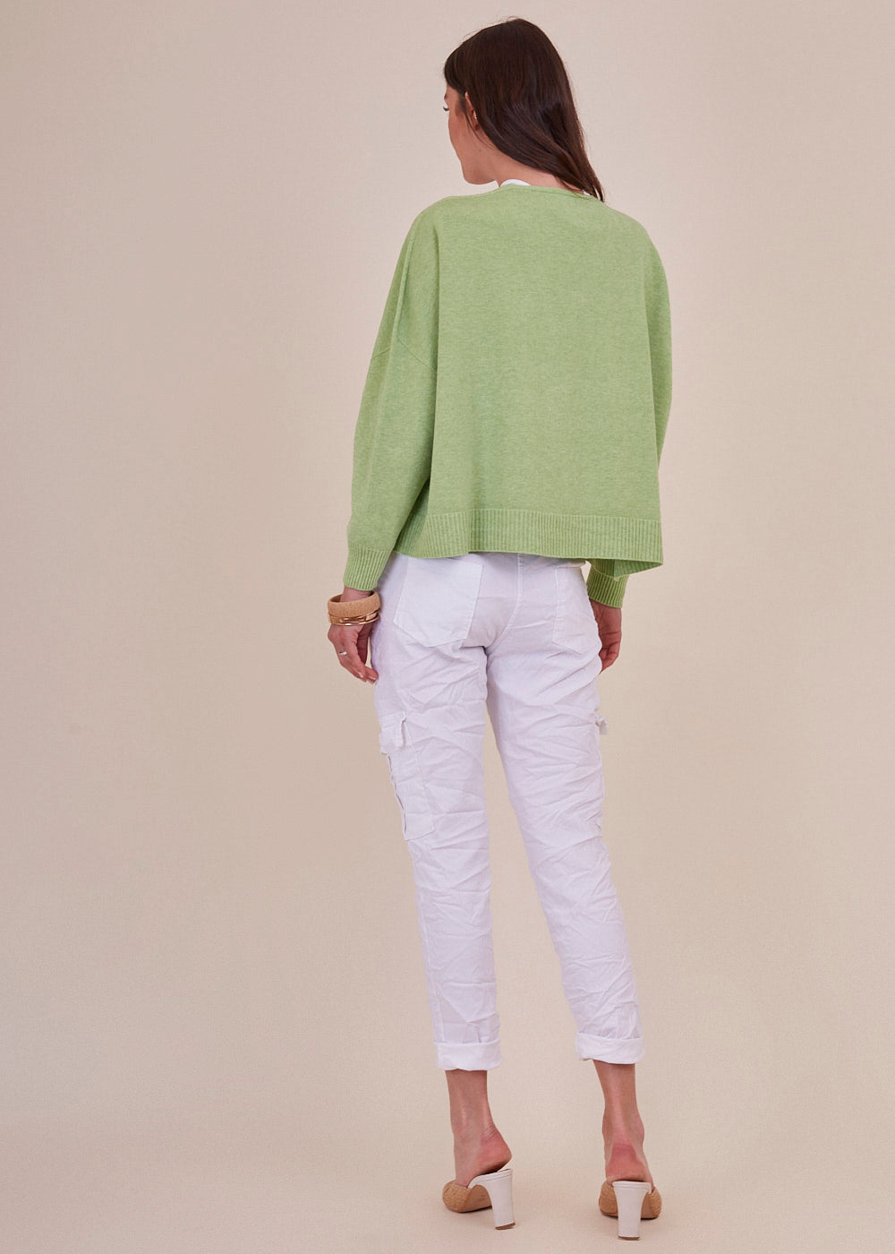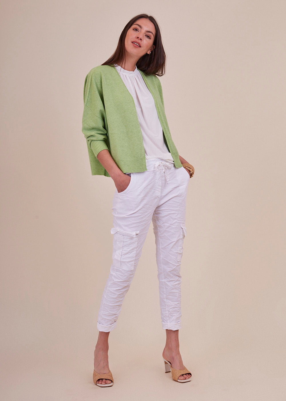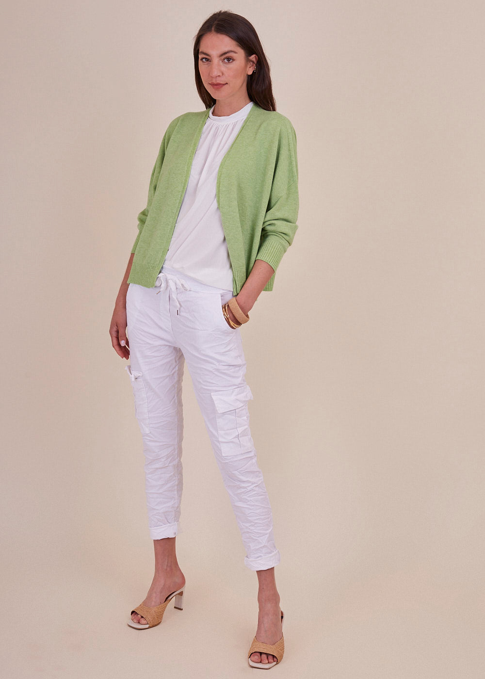 Kurz und kastenförmig geschnittene Strickjacke mit langen Armen aus unserem Bestseller Garn. Sie hat ein Rippenbündchen an den Ärmeln und am Saum. Kuschelig weicher Tragekomfort mit absoluter Wohlfühlgarantie. Perfekt in der Kombination mit einem Maxikleid oder wunderbar für die kühleren Sommernächte.