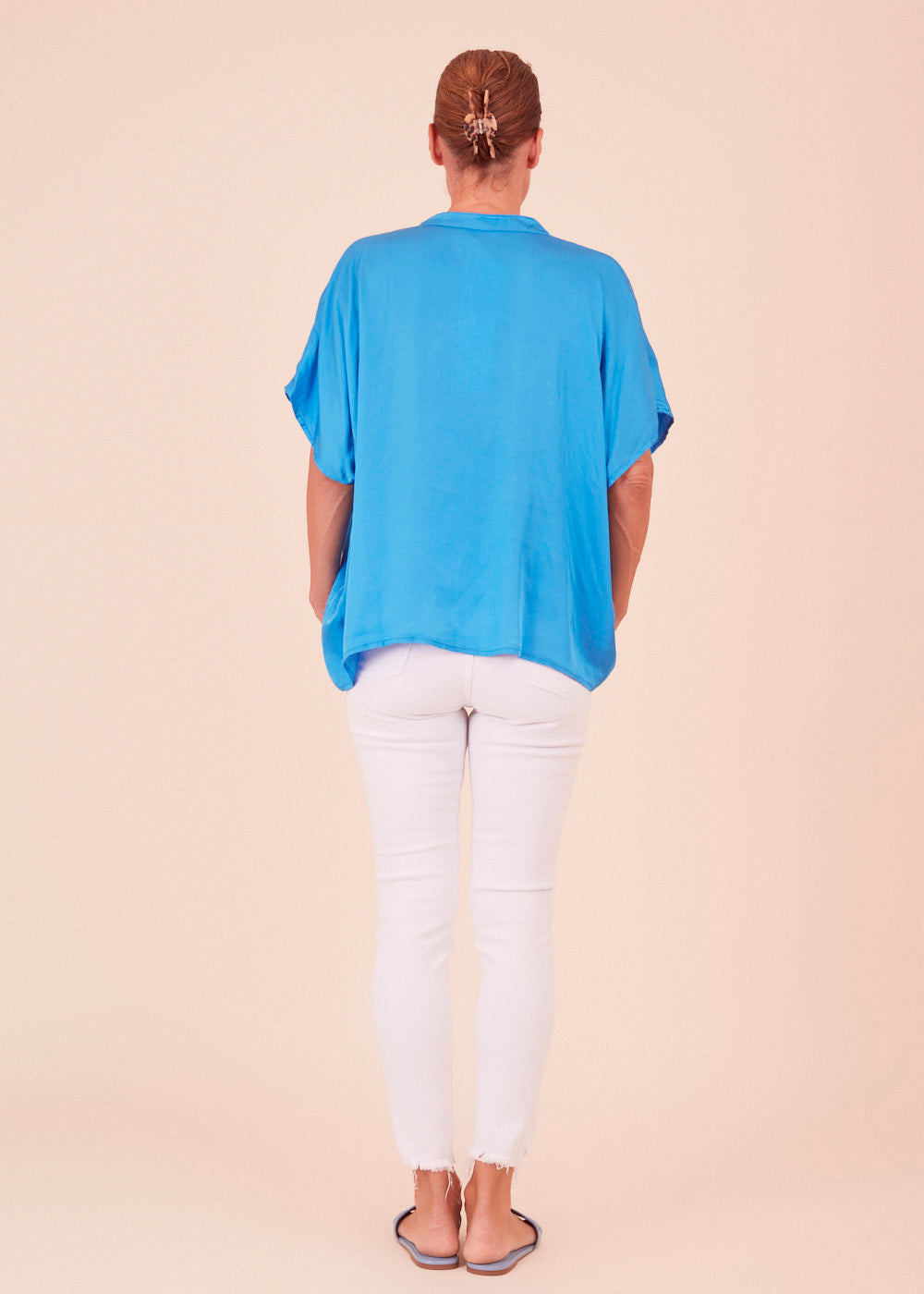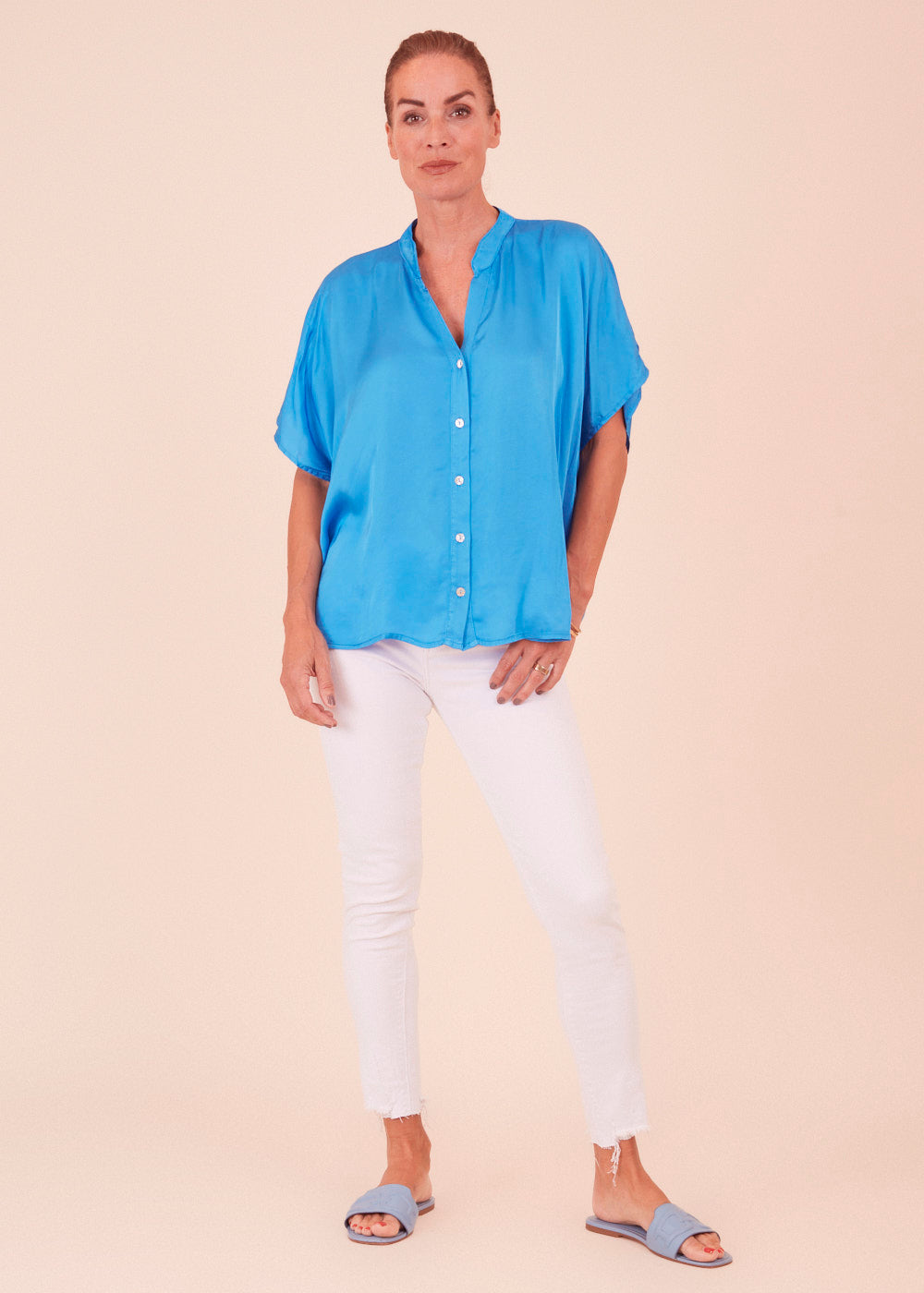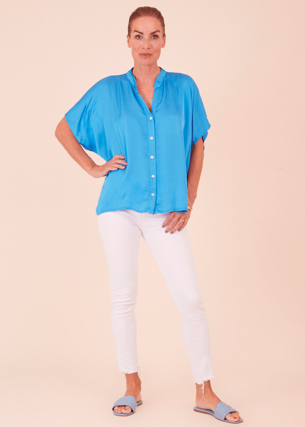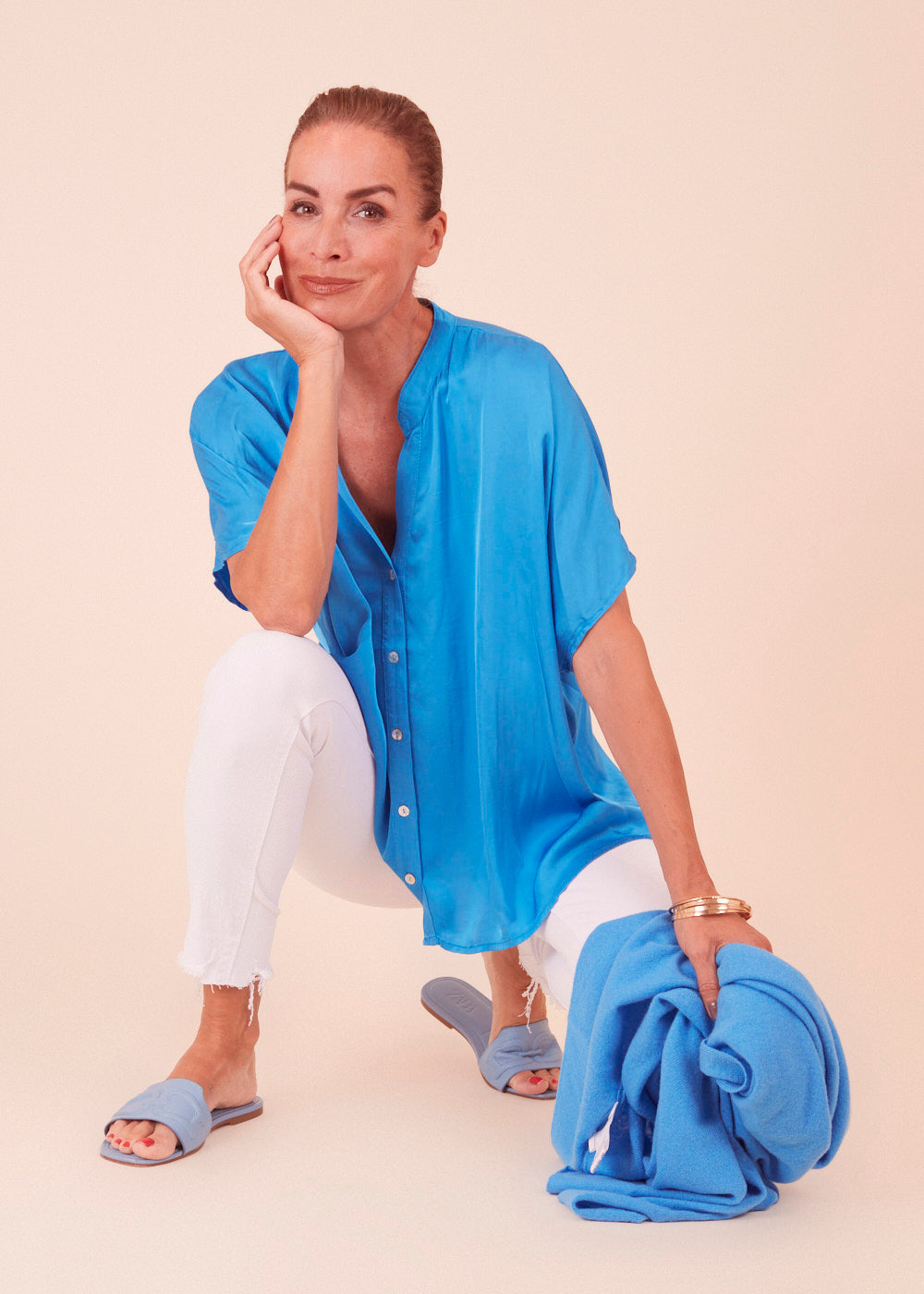Lässige Stehkragen Bluse mit durchgehender Knopfleiste aus einem fließenden Viskosematerial. Sie dreiviertel Ärmel und einem lässigen Schnitt. Das luftig leichte Material eignet sich perfekt für die heißen Tage.